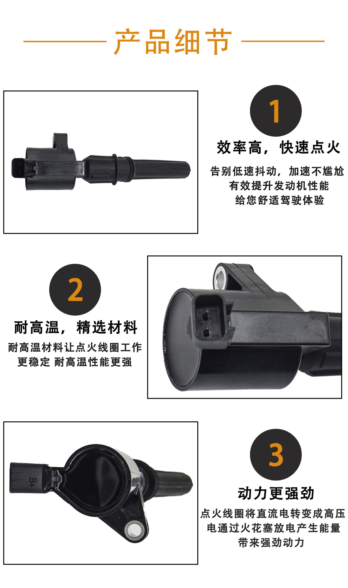 耐用材料:使用高质量绝缘材料和耐高温组件,增强点火线圈的稳定性和寿命,适应各种恶劣工作环境。