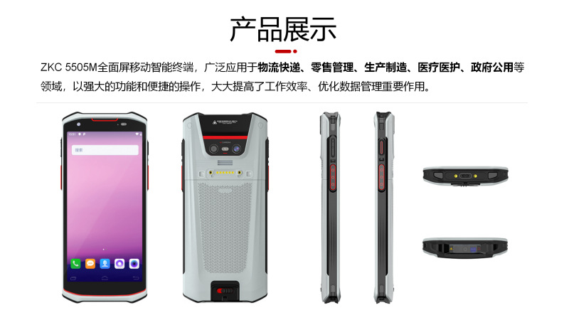 ZKC5505是一款移动智能采集终端,耐用防摔。基干 Android10.0/13.0智能操作系统,采用八核处理器、高度整合4G/5G、WiFi、GPS、蓝牙、1300W、200W前后双摄像头拍照录像、NFC读写,二代证阅读等功能,支持一维条码、二维码扫描、多种实时无线通讯、 拍照、GPS等功能,拥有独具特色的模块设计,用户可根据需求进行定制化功能拓展。现广泛应用于多种行业领域,帮着用户快速实现信息化管理,提高生产效率。