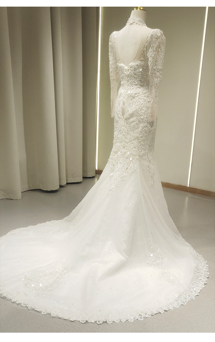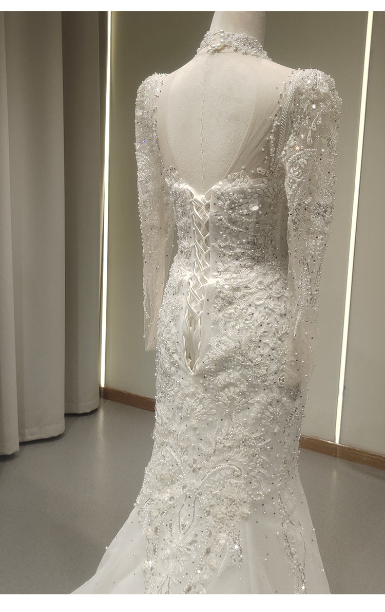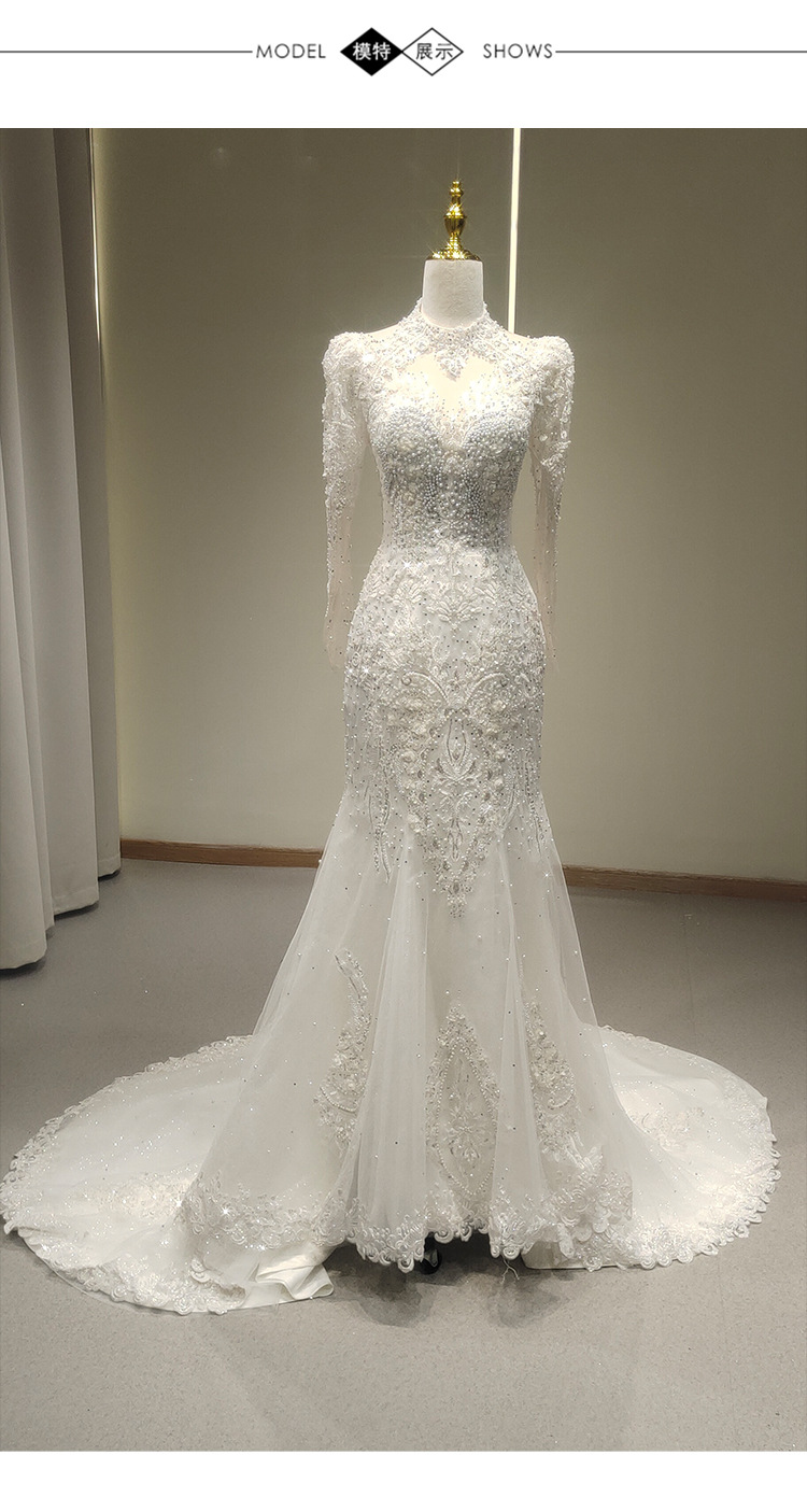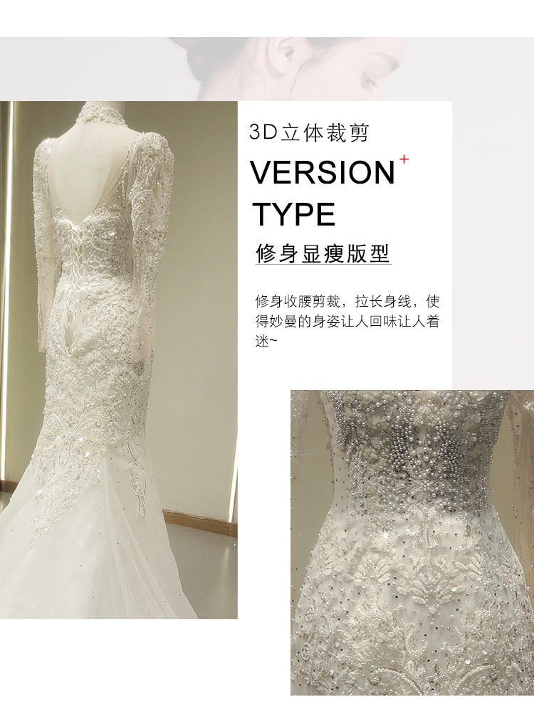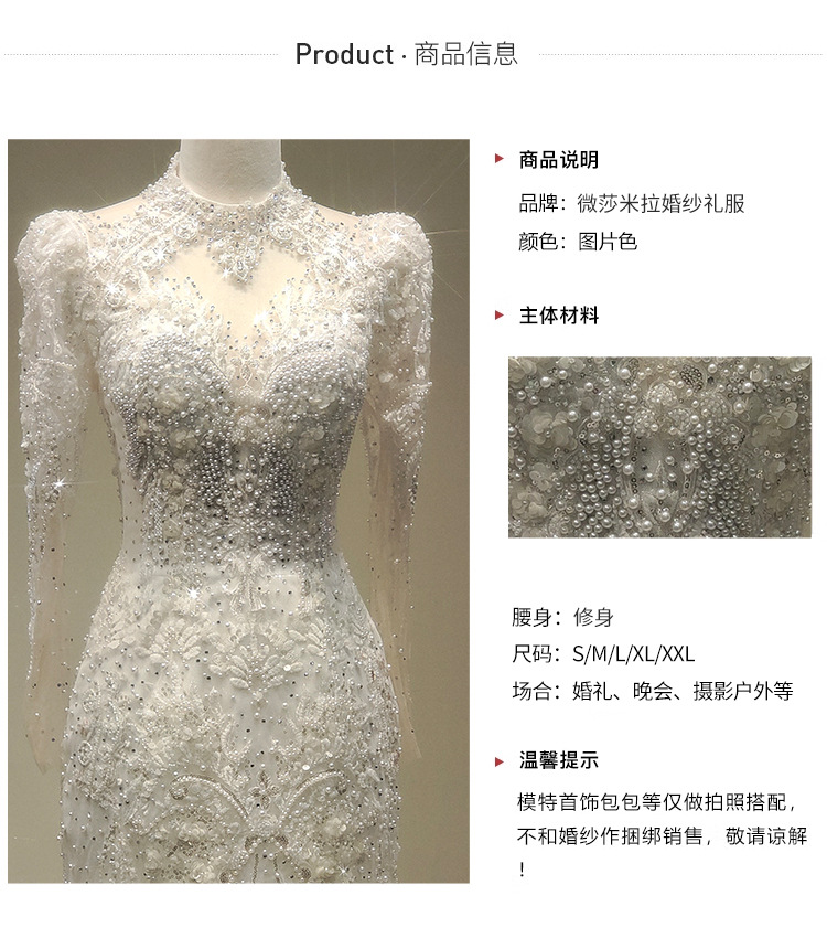高端气质鱼尾婚纱礼服一字肩长袖蕾丝法式出门纱影楼摄影鱼尾礼服