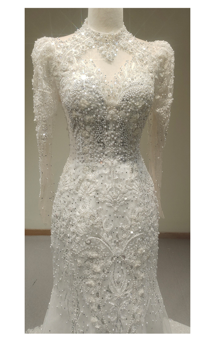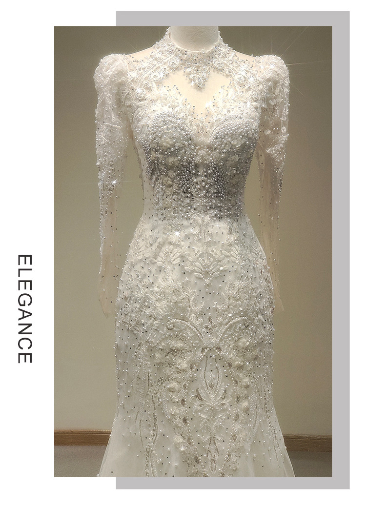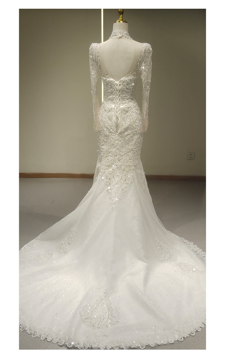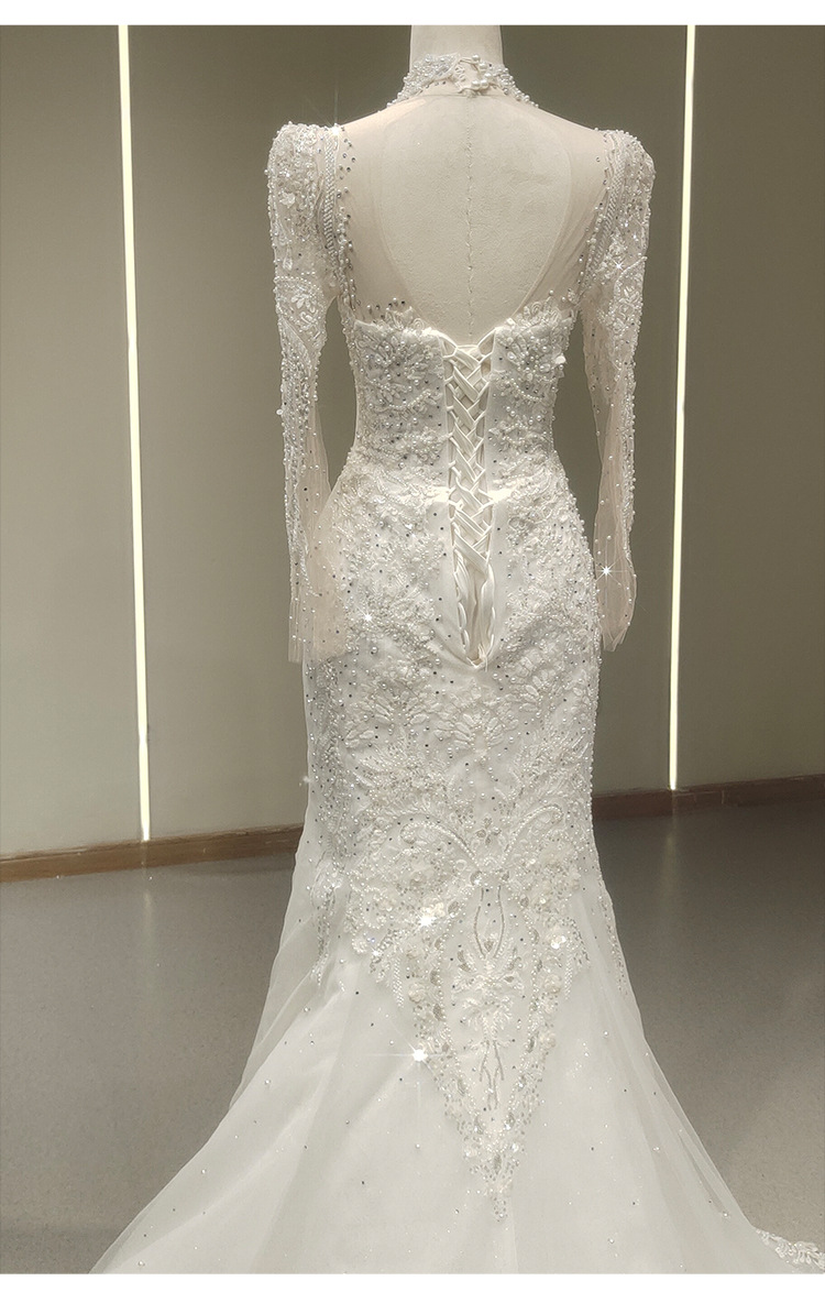 高端气质鱼尾婚纱礼服一字肩长袖蕾丝法式出门纱影楼摄影鱼尾礼服