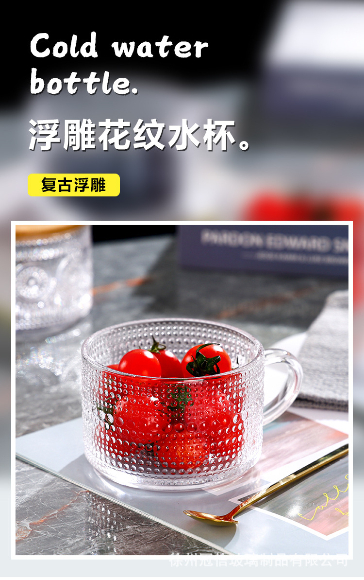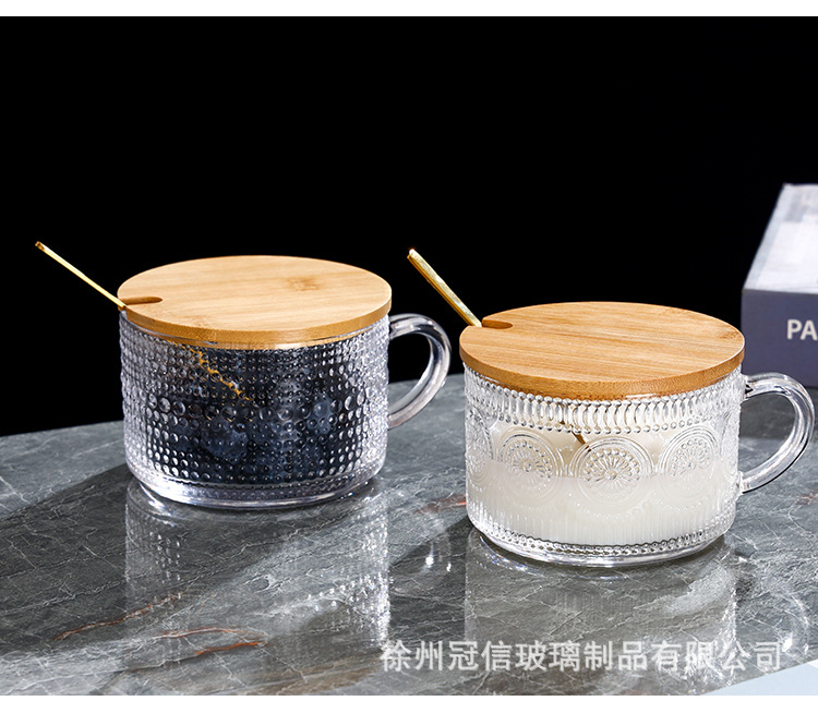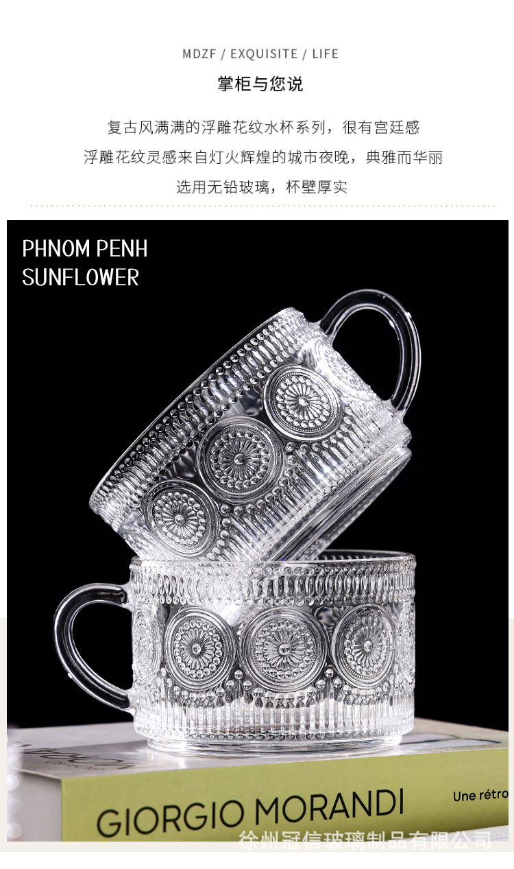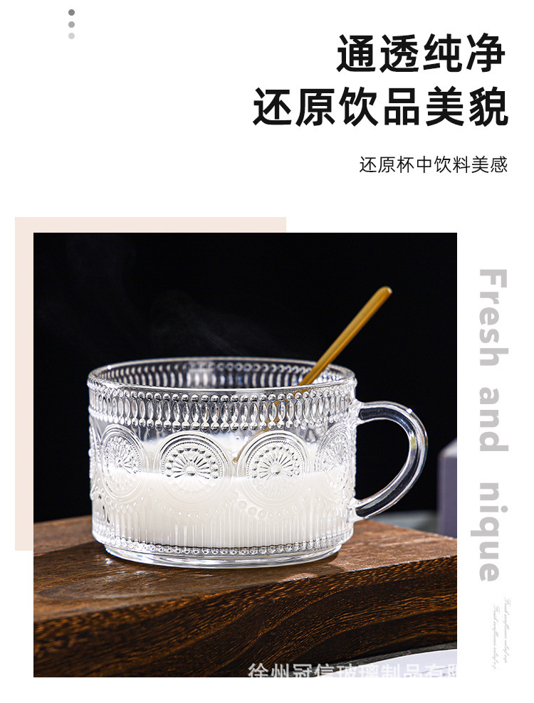 浮雕复古太阳花玻璃燕麦杯把手早餐杯透明玻璃牛奶带勺带盖咖啡杯,批发价,价格:2.8,厂家直销,浮雕复古太阳花玻璃燕麦杯把手早餐杯透明玻璃牛奶带勺带盖咖啡杯,免费拿样。