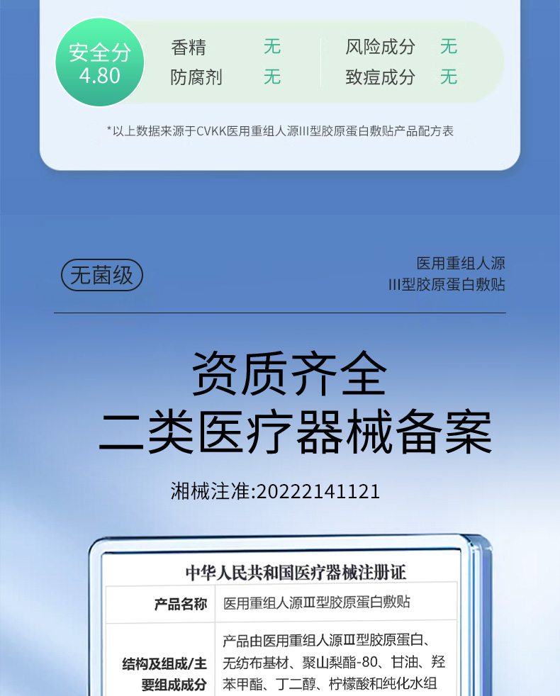 CVKK医用级重组人源三型胶原蛋白面膜型修复敷料护理械字号贴膜