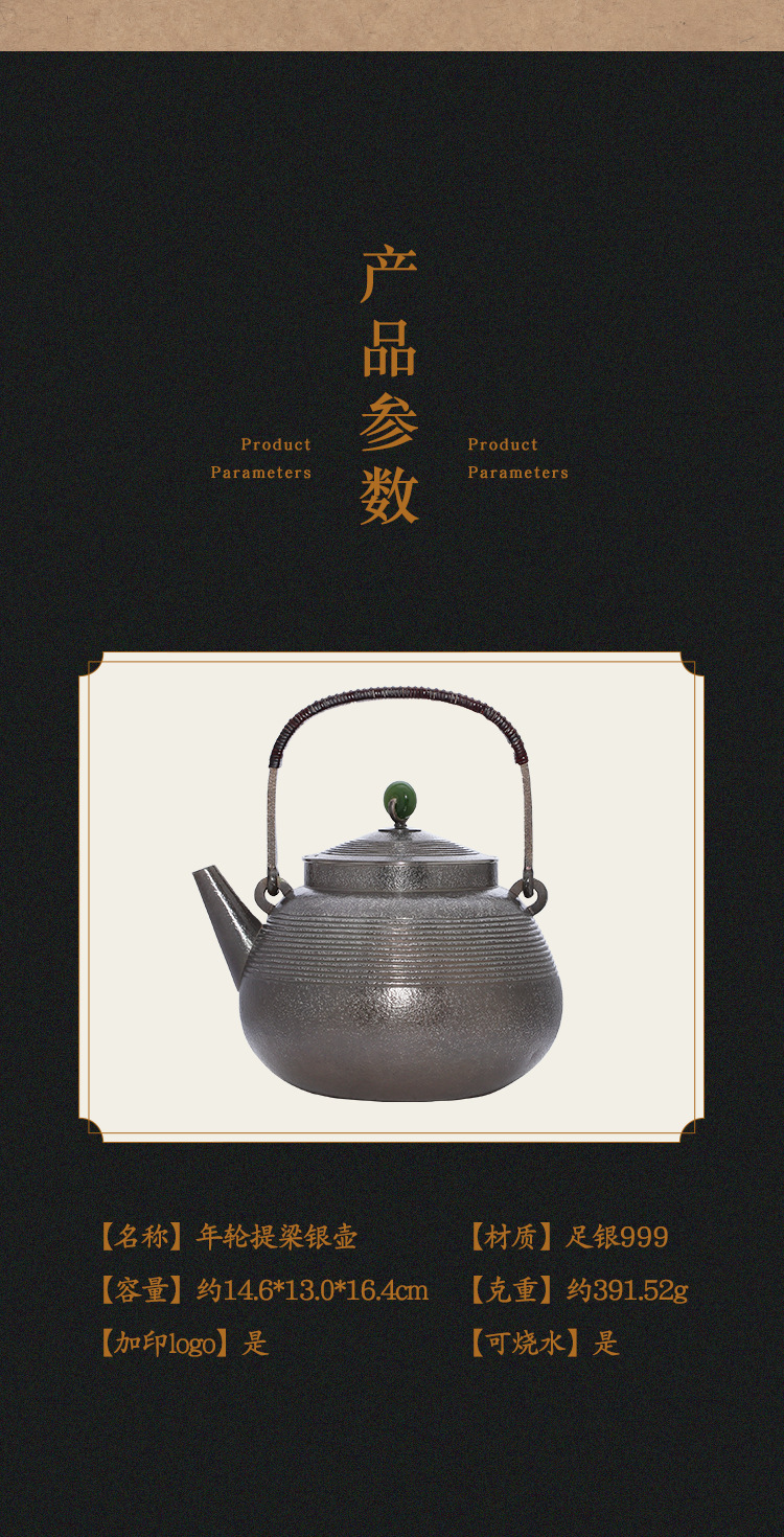 年轮提梁银壶 银壶足银999烧水壶 手工捶打家用中式功夫茶壶