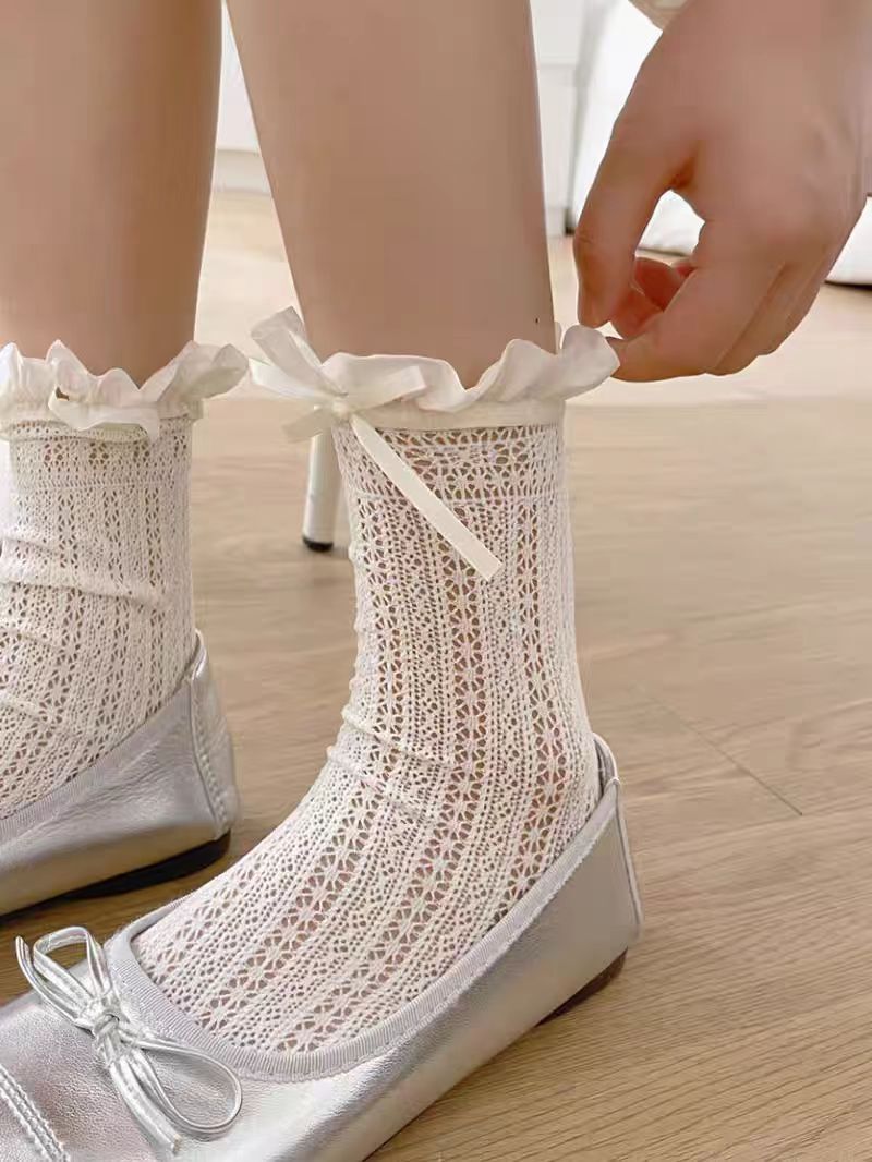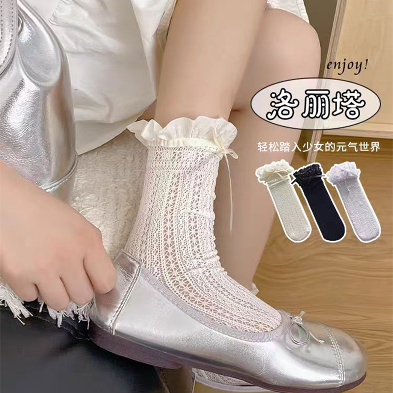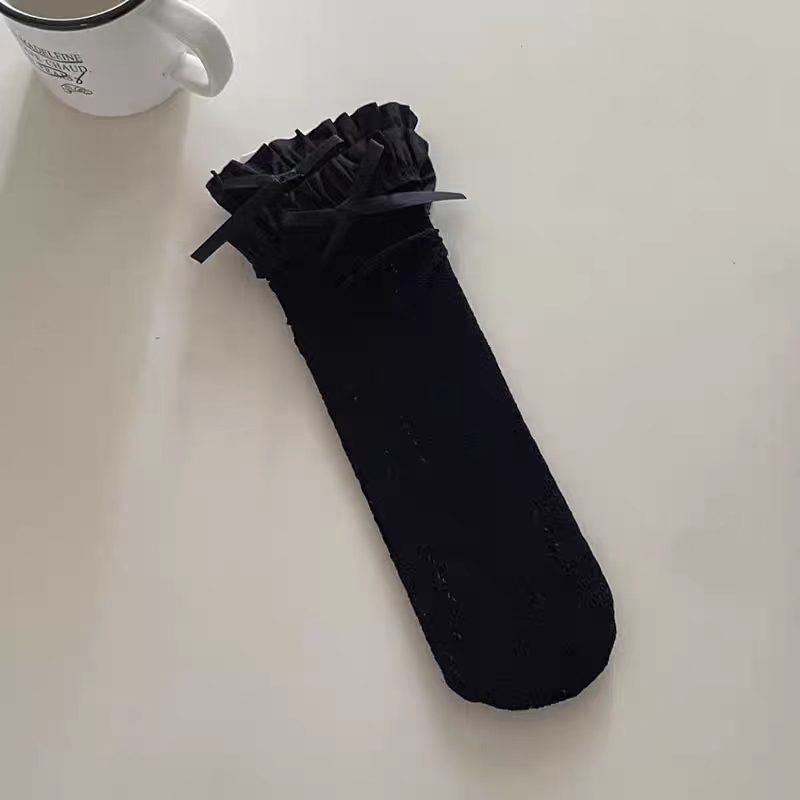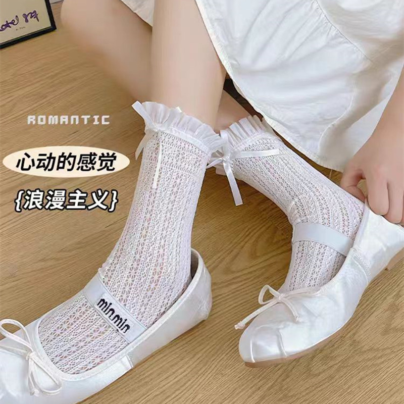 蝴蝶结袜子夏季新款韩系镂空蕾丝无跟堆堆袜纯色花边女士中筒袜