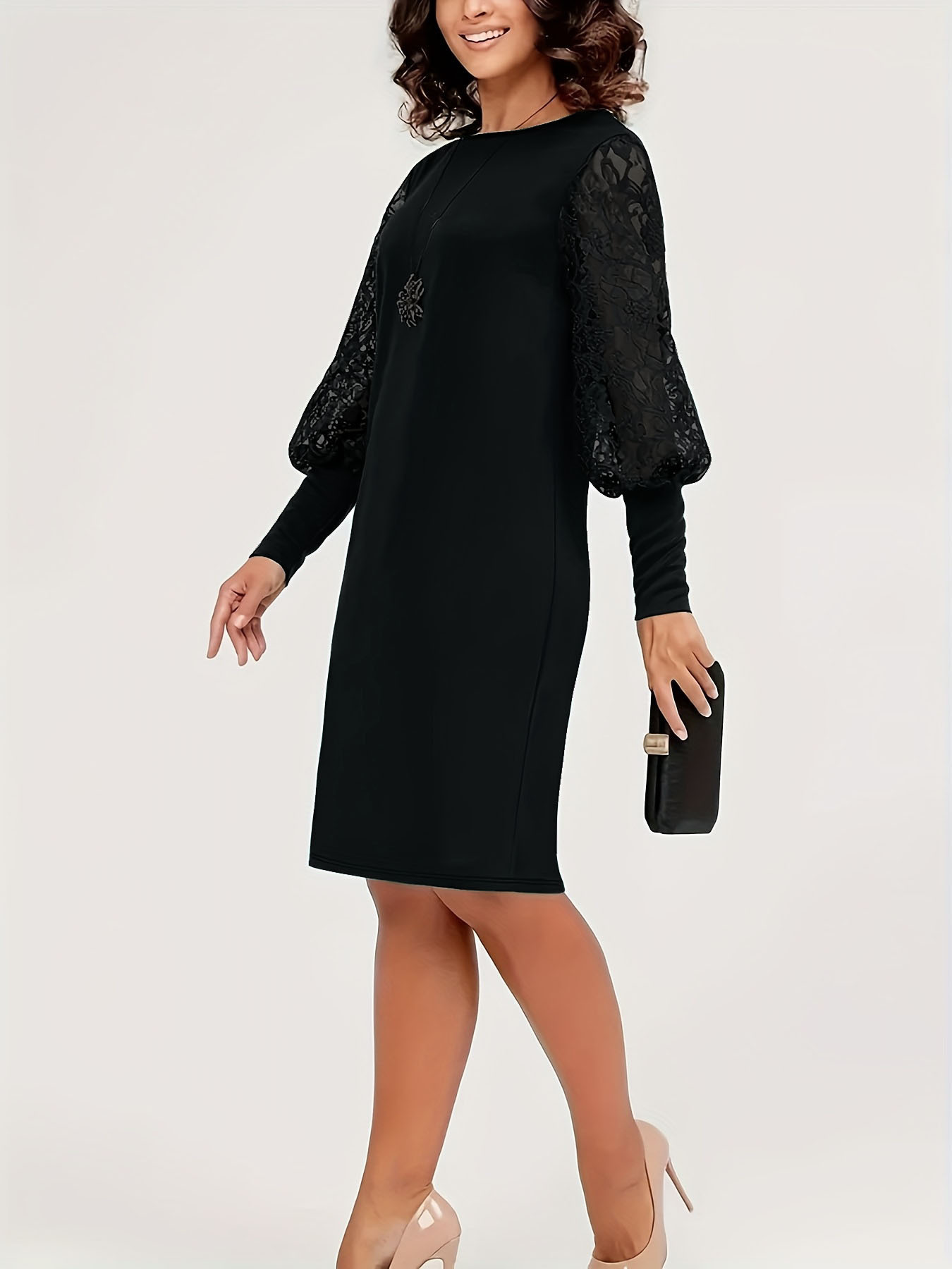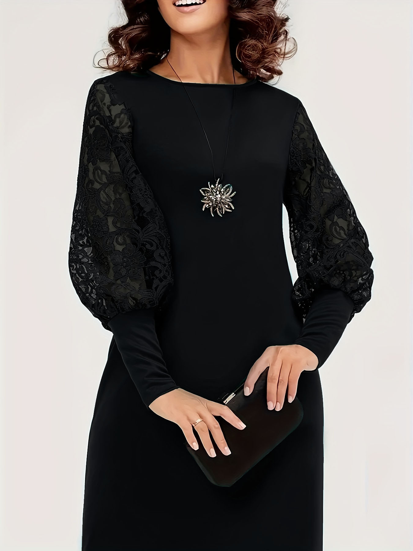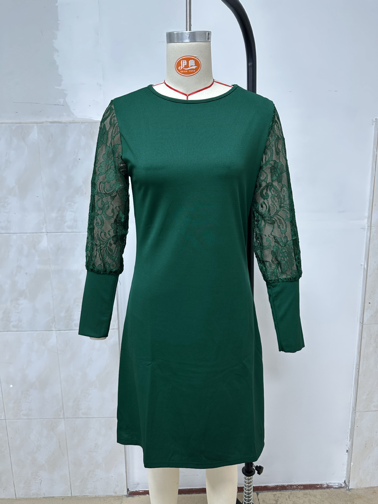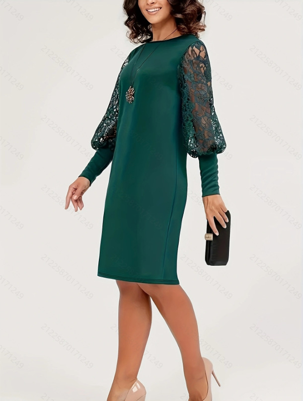 欧美女装跨境亚马逊连衣裙圆领长袖镂空蕾丝袖拼接修身连衣裙