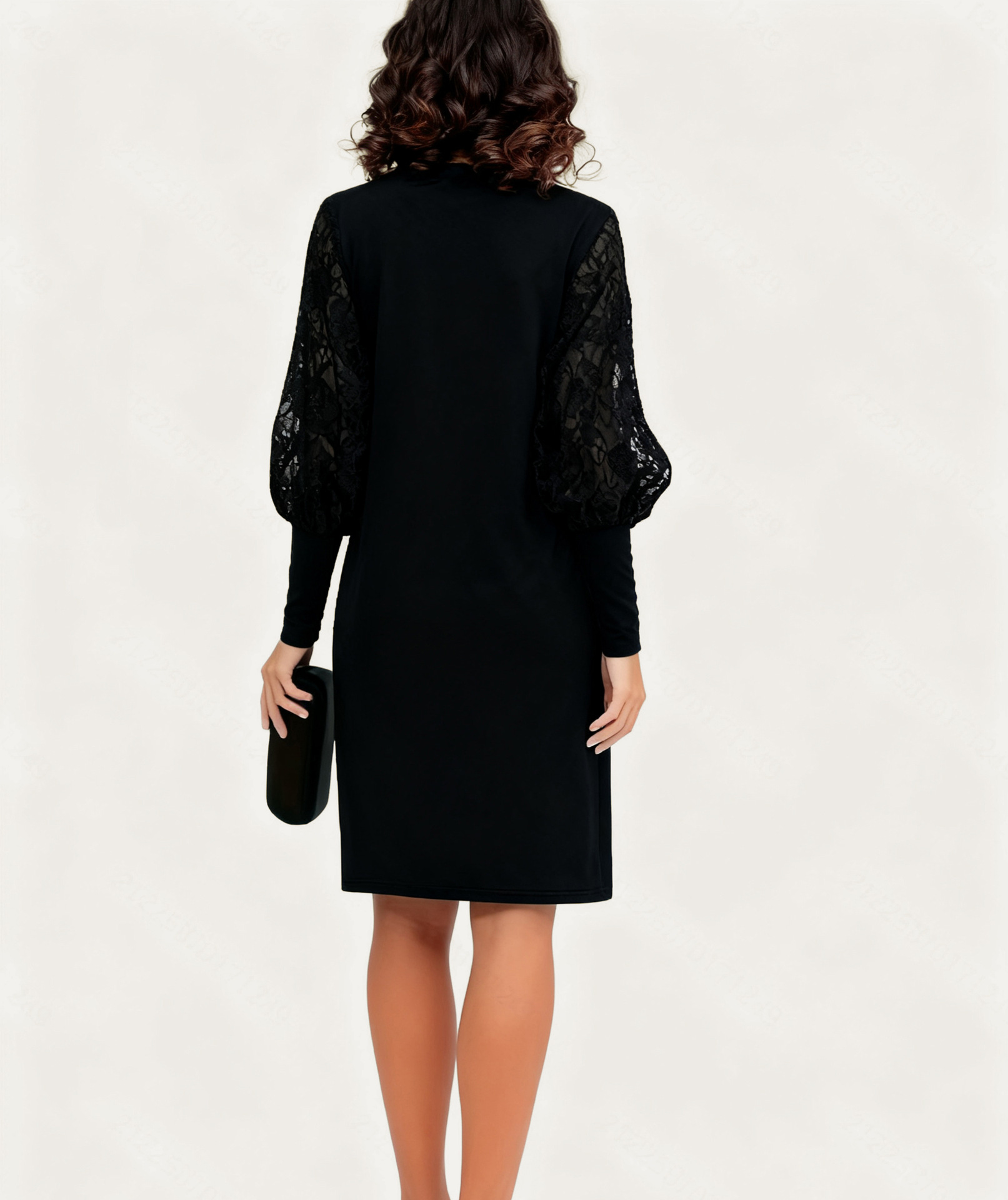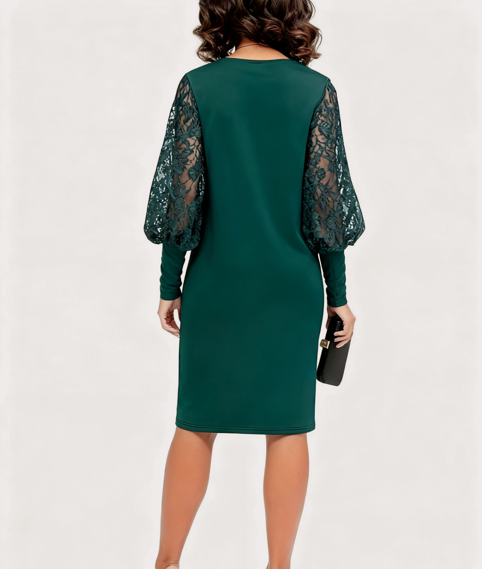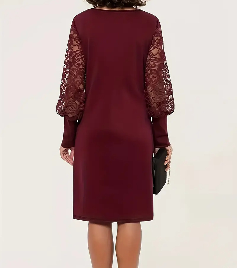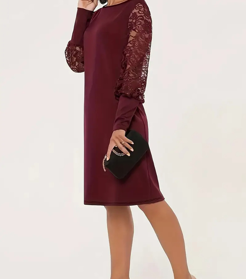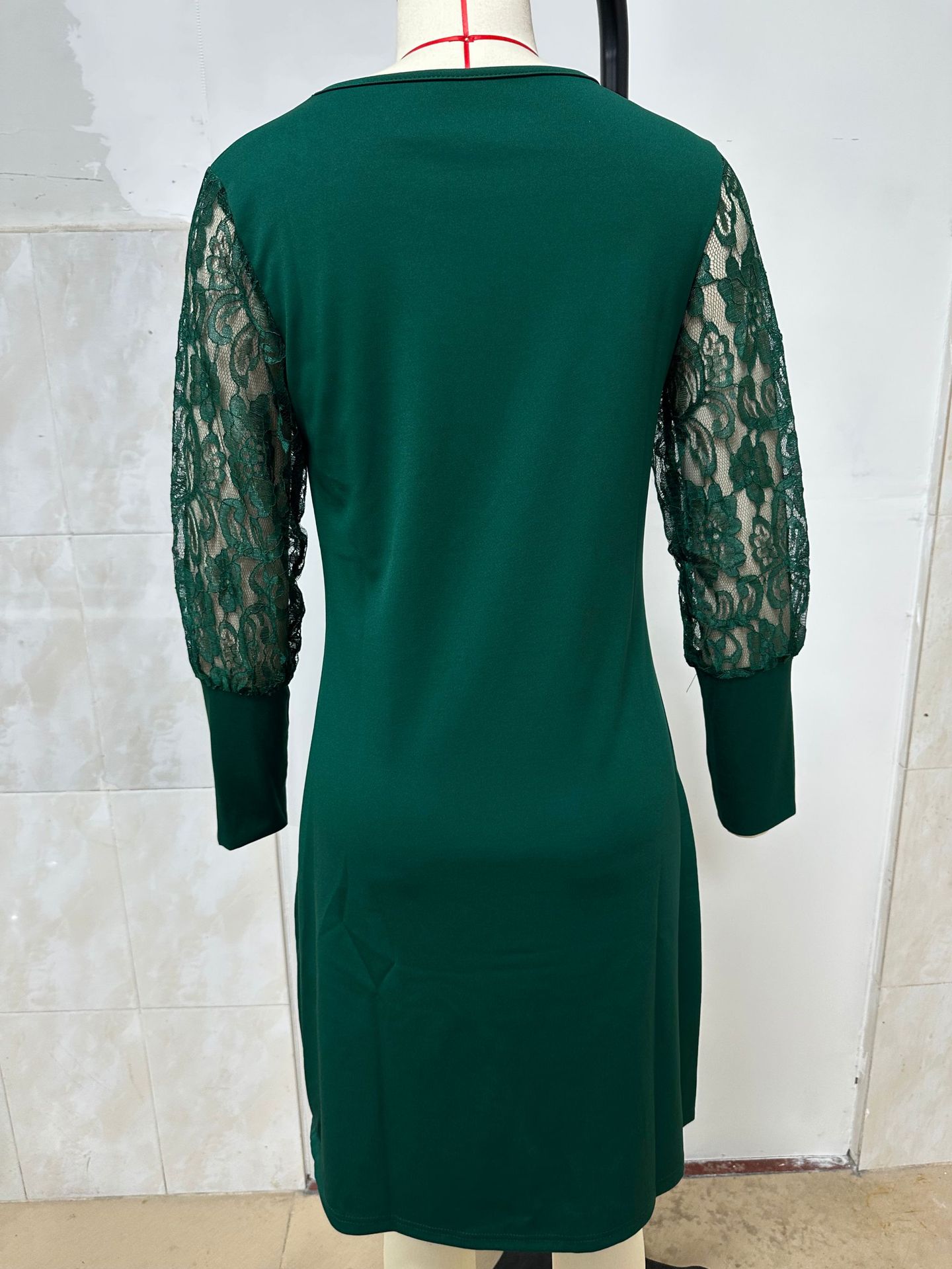 欧美女装跨境亚马逊连衣裙圆领长袖镂空蕾丝袖拼接修身连衣裙
