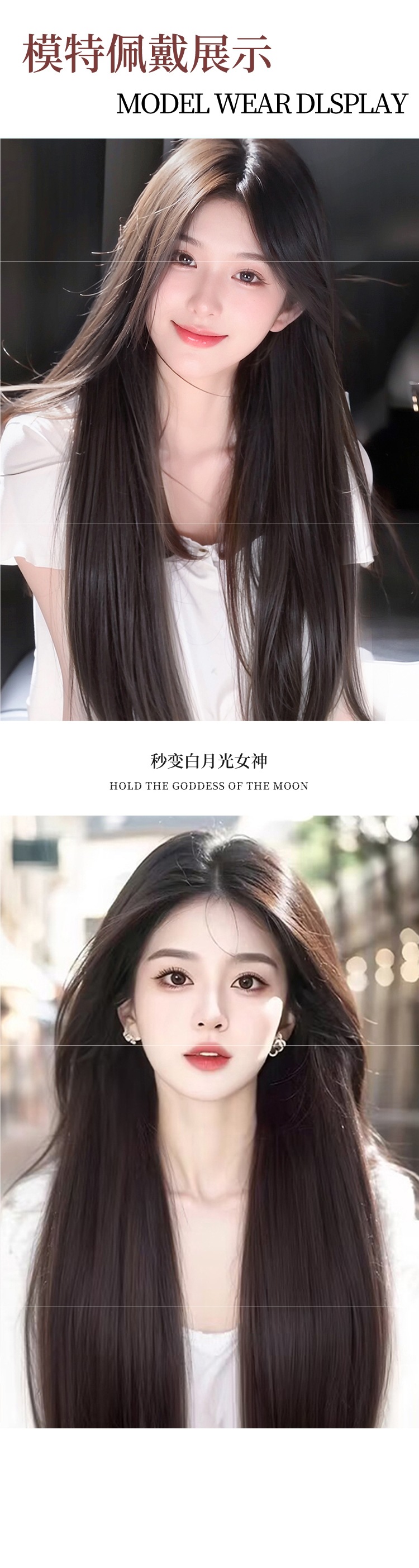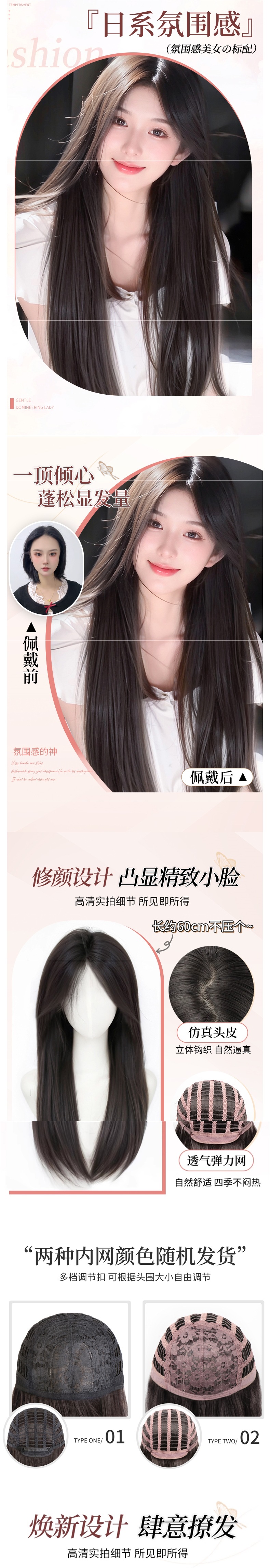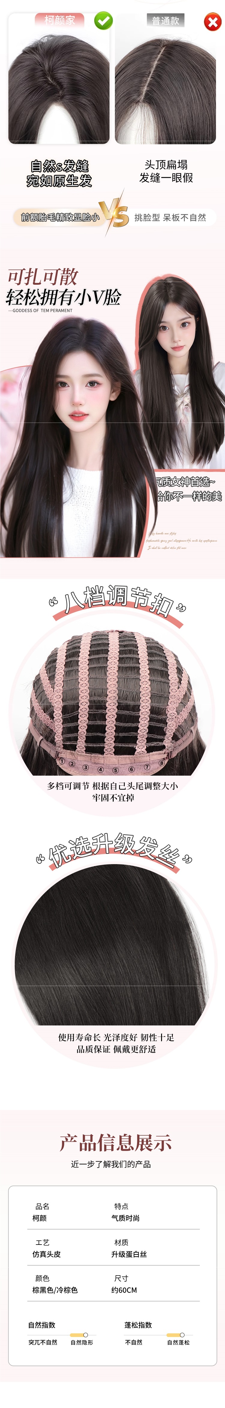 推荐理由:这款黑长直全头套假发堪称日常造型神器!中分八字刘海自然修饰脸型,轻松打造氛围感小脸。精选仿真人发材质,蓬松不贴头皮,光泽感与真发无异,近距离也不怕露馅。全头套设计佩戴方便,无需额外打理,日常通勤、通用