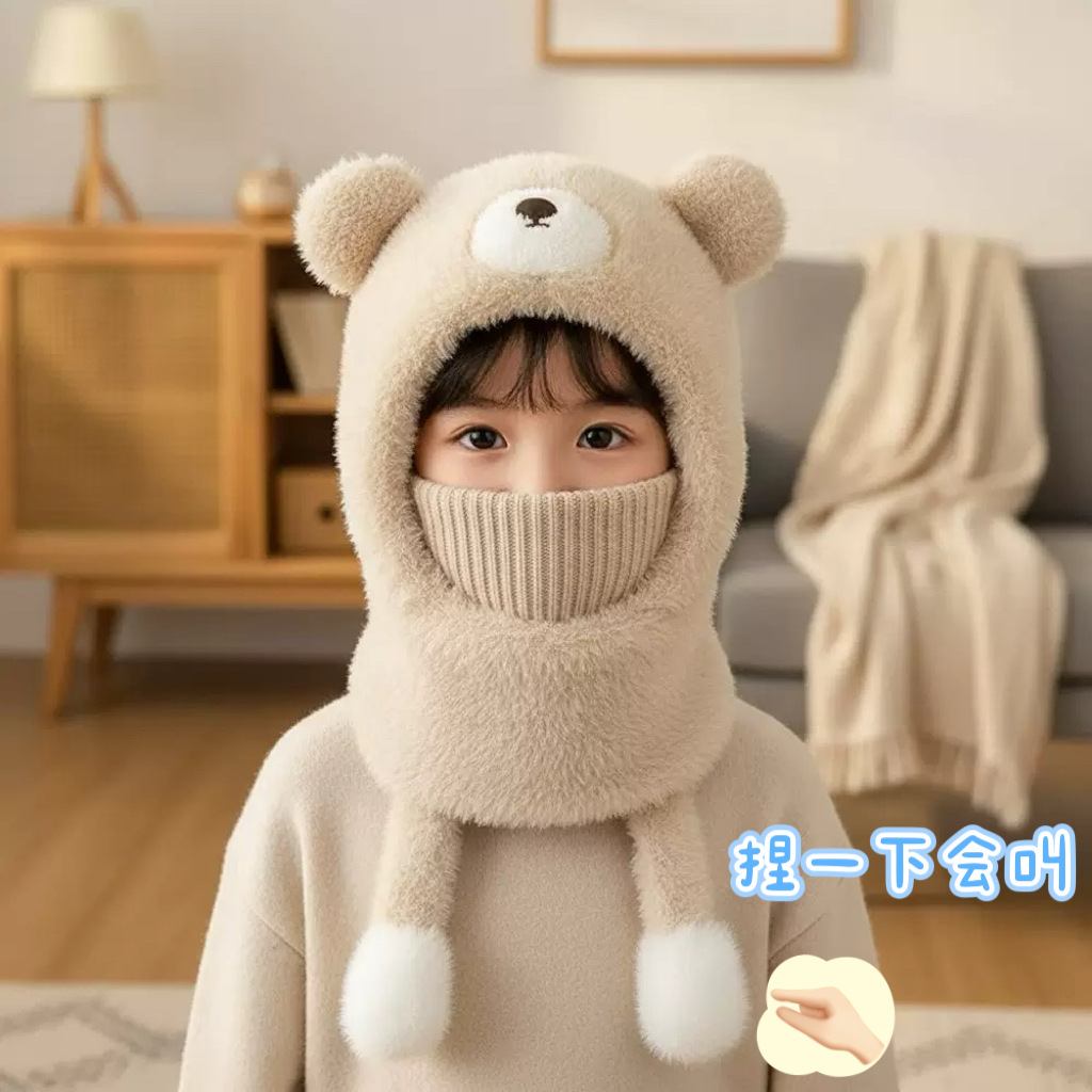 儿童帽子冬季围脖口罩一体帽加绒保暖护耳帽男女童防寒小熊套头帽