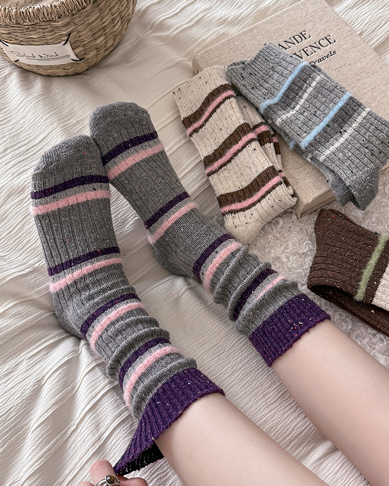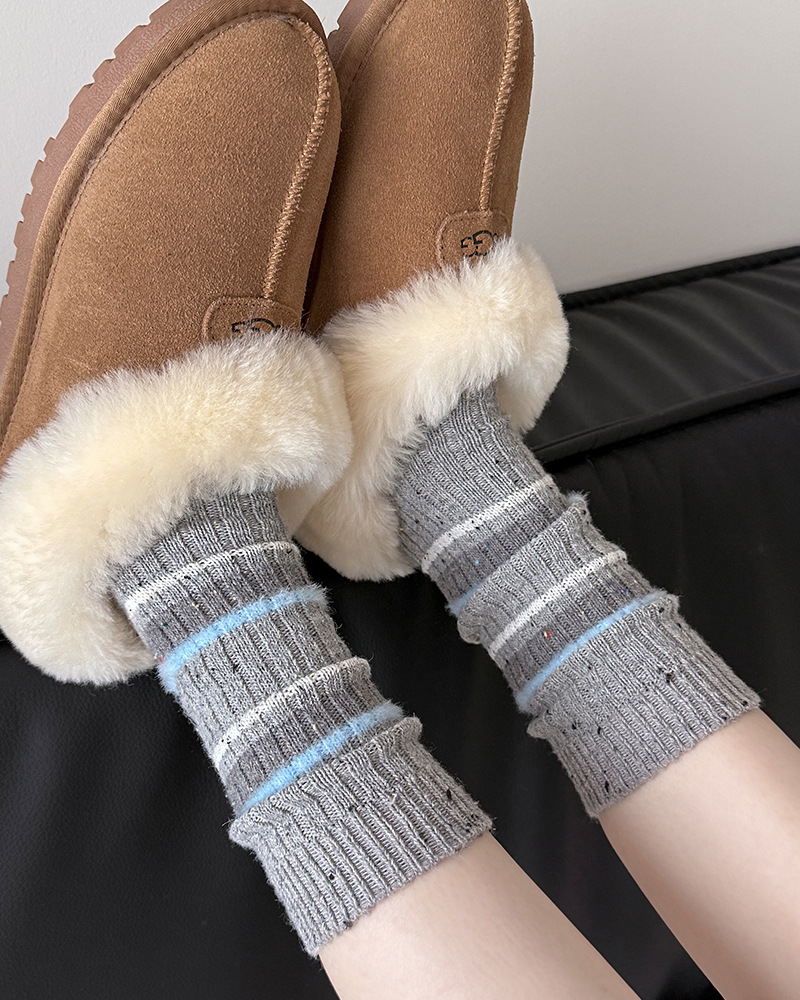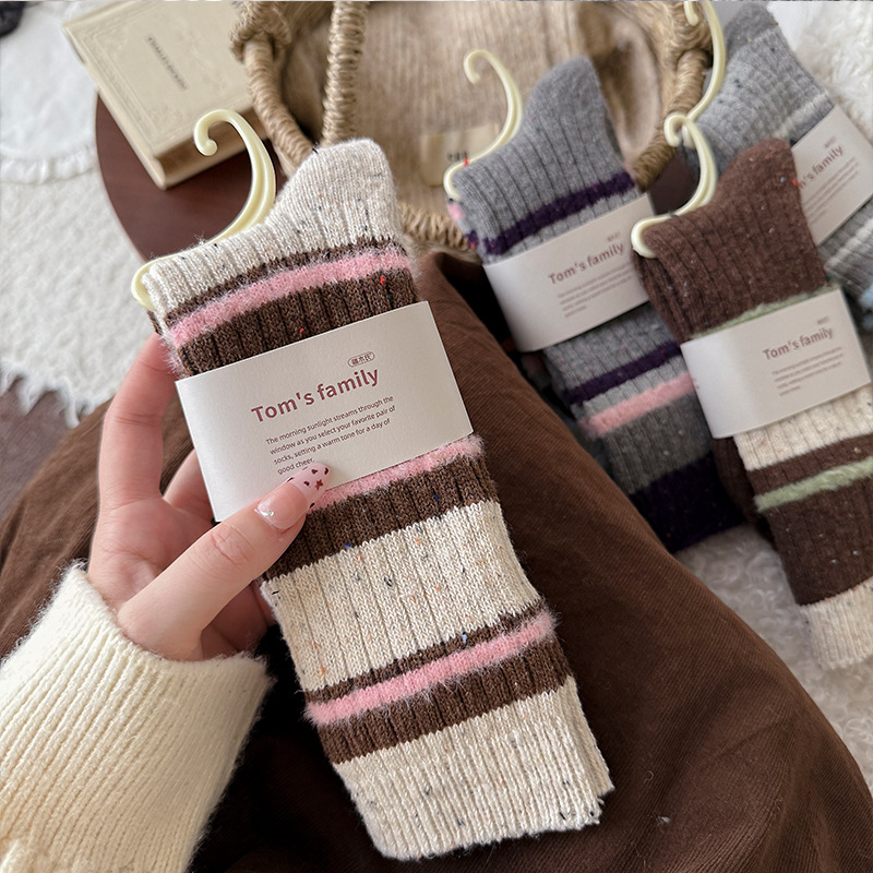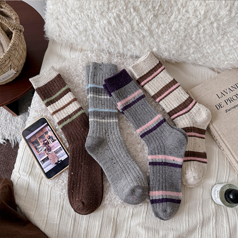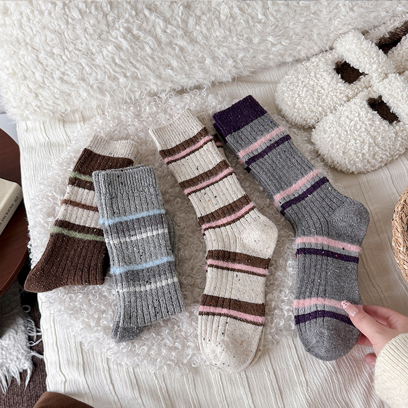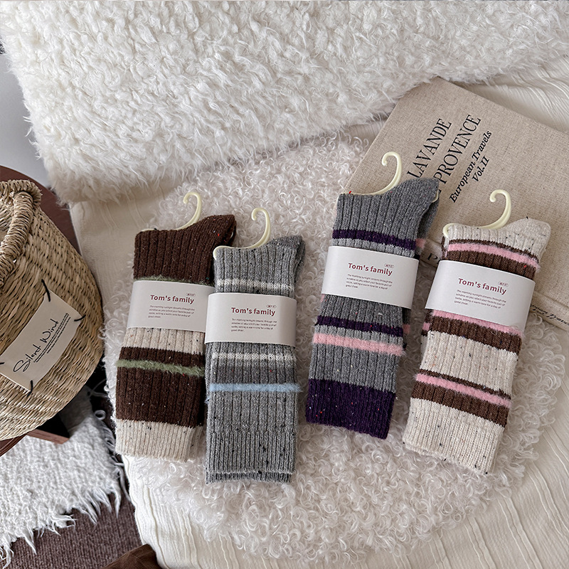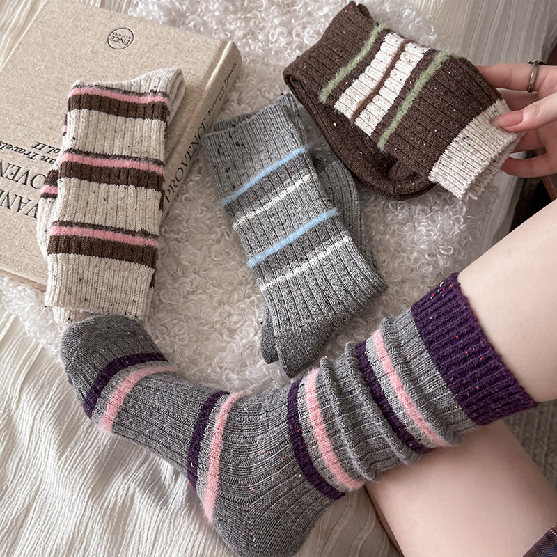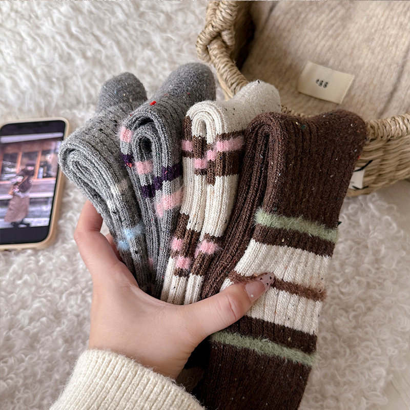 羊毛袜子女中筒袜秋冬粗线毛毛韩版ins潮加厚保暖条纹撞色堆堆袜