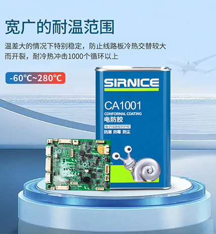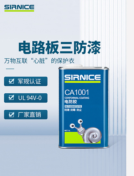 CA1001 是低粘度单组分有机硅苯基树脂电防胶(又名 PCB 三防漆、电路板三防漆),可室温固化,也可 溶剂挥发后加温固化,应用于厚膜 电路系统、多孔基材及印刷线路板的涂层保护。