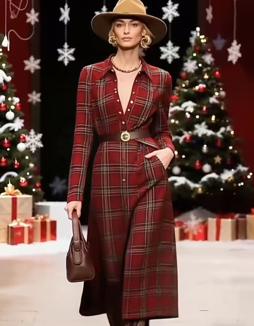 欧美新款亚马逊外贸秋冬新款圣诞时尚格纹POLO领衬衫外贸女连衣裙