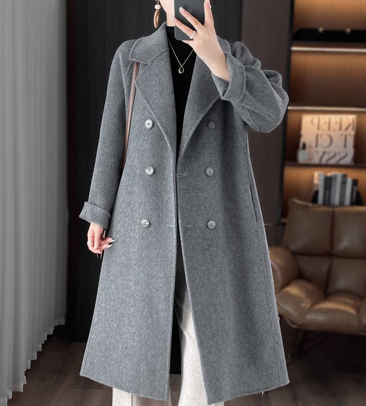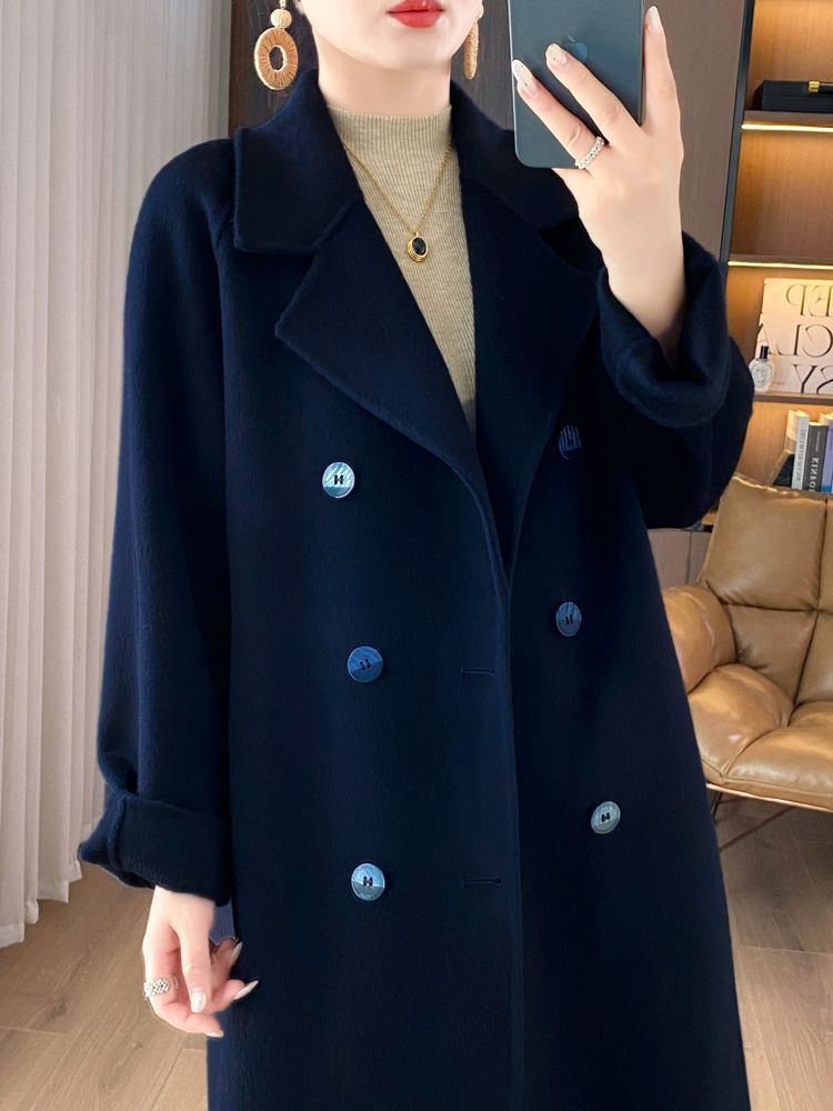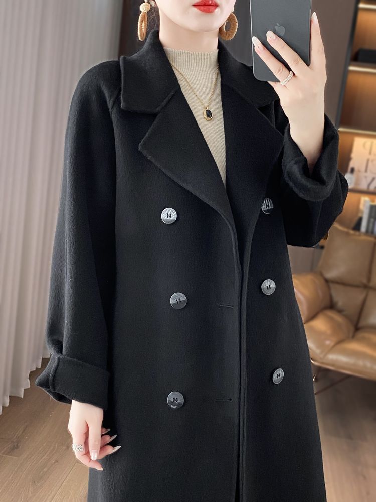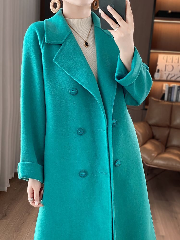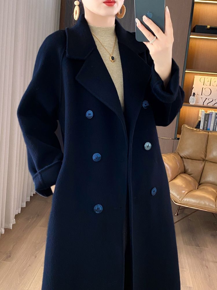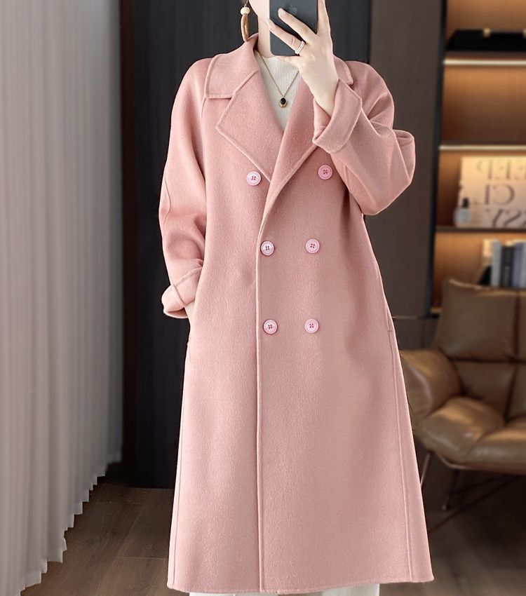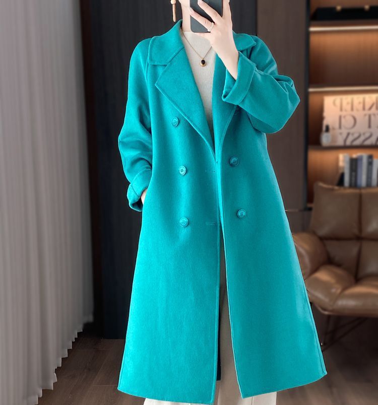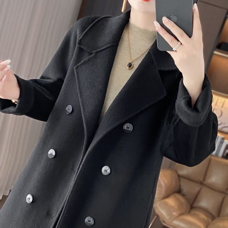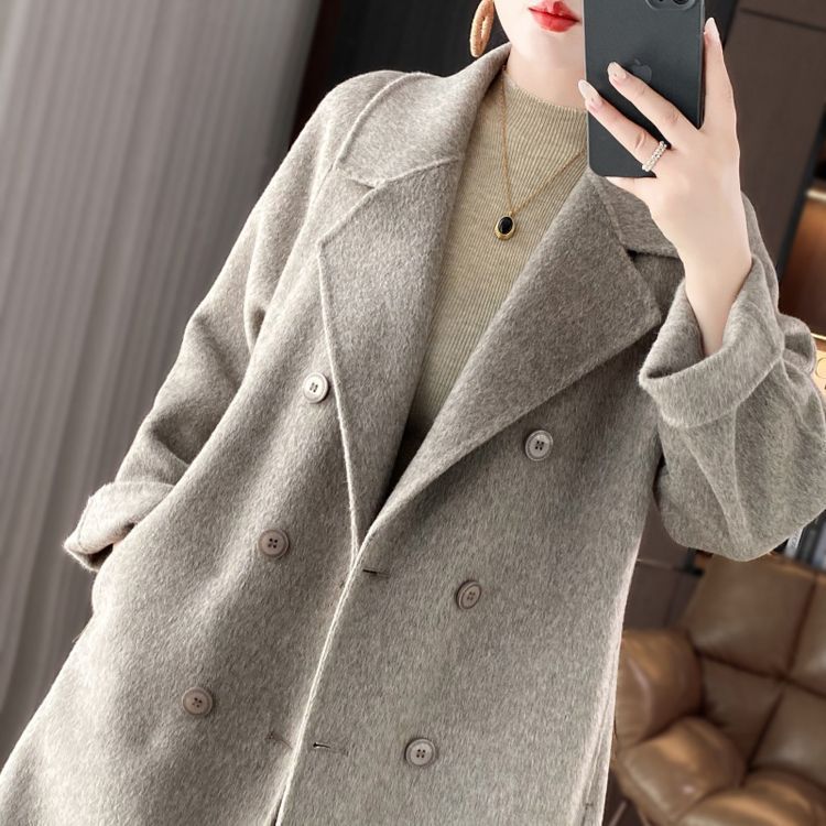 新款羊毛呢双面呢羊毛大衣女士高档双排扣长款秋冬季赫本风外套81