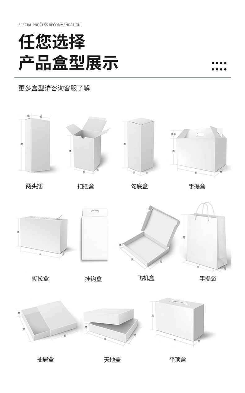 温馨提示:此包装盒均属定做,由于产品的订货尺寸以及印刷、工艺、数量的不同,以上标价并不作为成交价格,敬请谅解,具体价格需提供您的包装盒尺寸,印刷工艺,数量等、我们客服帮您核算,如有疑问可致电客服!