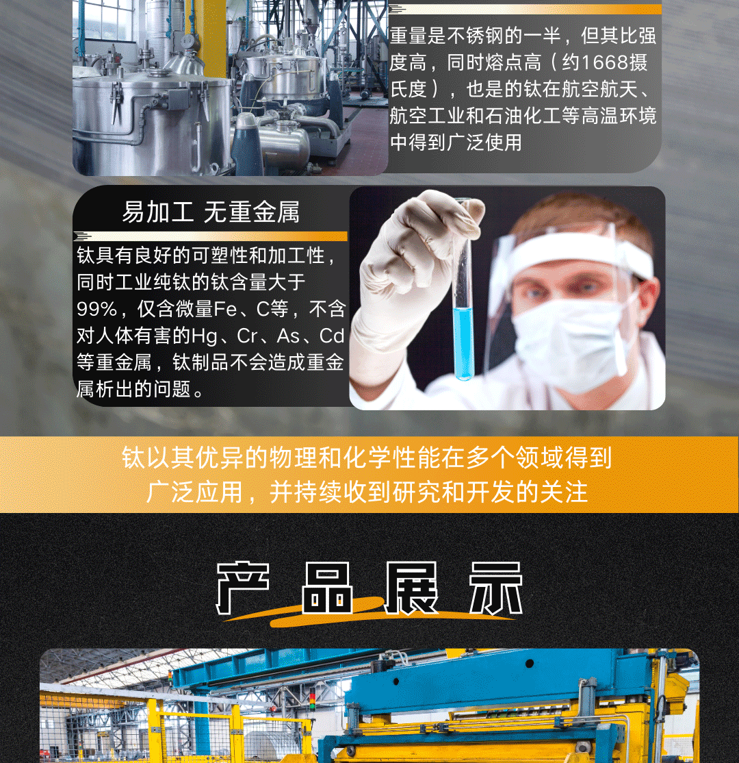 通用结构与耐蚀设备:是化工、海洋工程、电力等行业的首选钛材,用于制造压力容器、管道、阀门、泵、电站凝汽器。