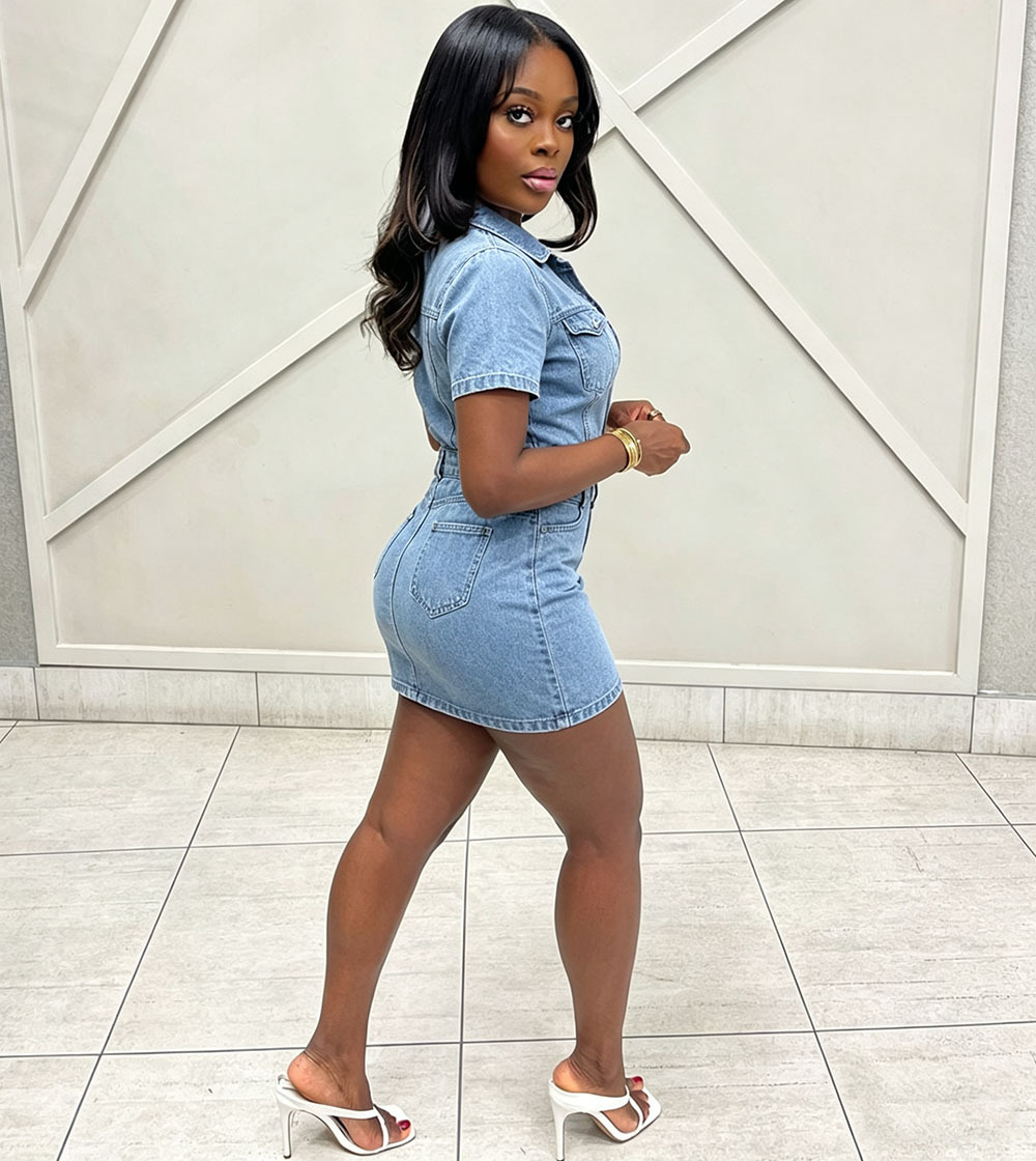欧美女式牛仔连衣裙亚马逊跨境新款女装街头时尚单排扣短袖连身裙