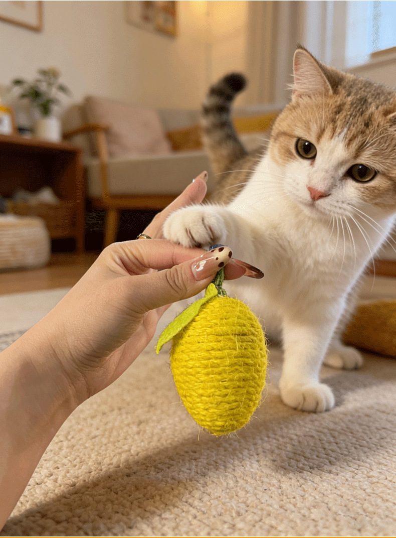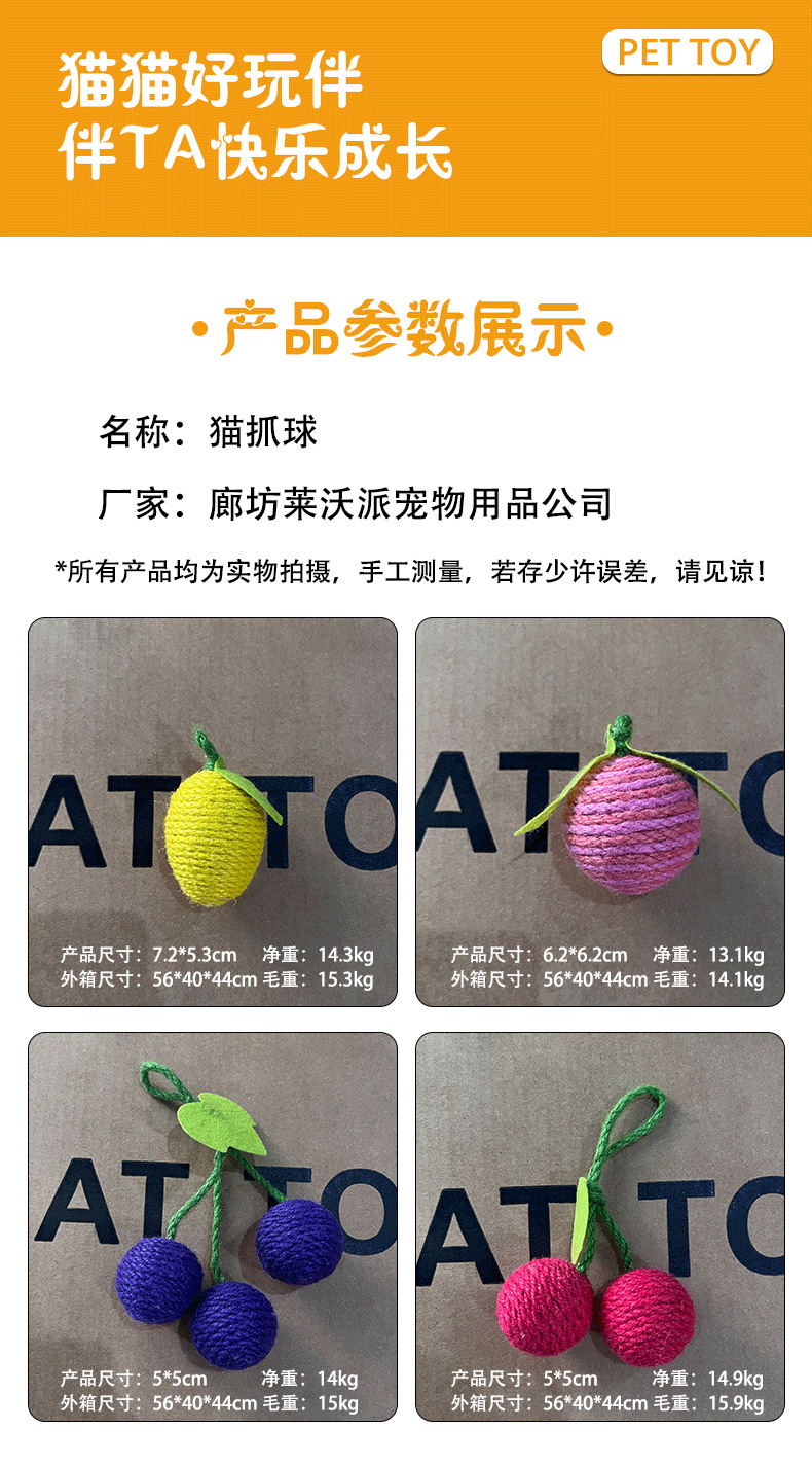 推荐理由:具球宠物猫咪用品厂家批发猫咪自嗨解闷毛球耐咬剑麻水果猫玩具