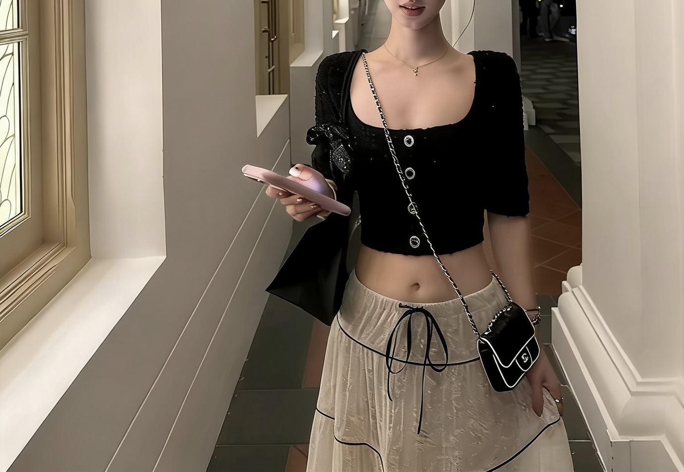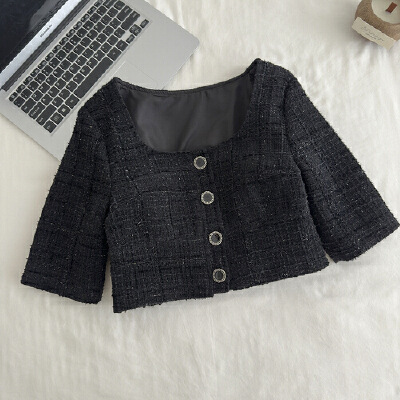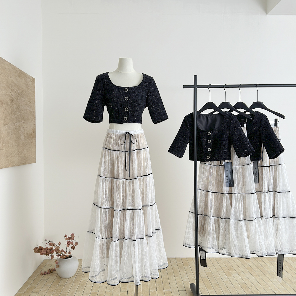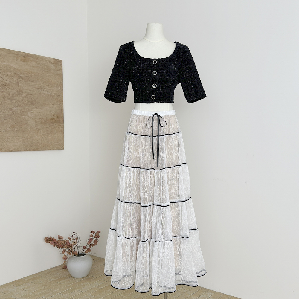 板栗可可Bankelili'黑曜石千金'小香风粗花呢短袖/蕾丝半身裙套装