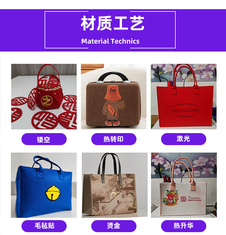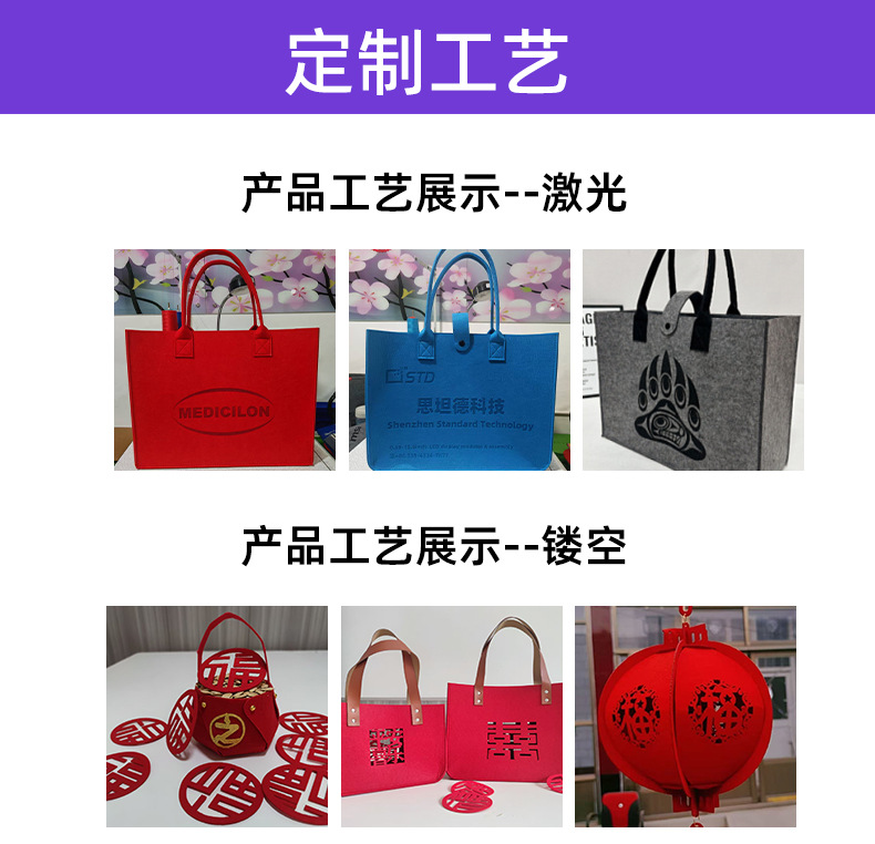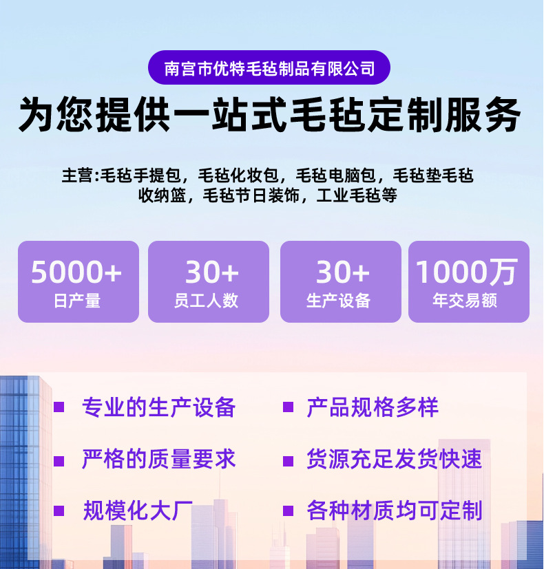 推荐理由:本公司是一家主营:毛毡包、收纳包、化妆包等彩色毛毡制品批发零售的企业。拥有熟练的质控人员和工人,无论款式、性能还是质量都深得好评。支持来图来样来料加工定制, 时刻以顾客为关注焦点,用全新的理念,挚诚与