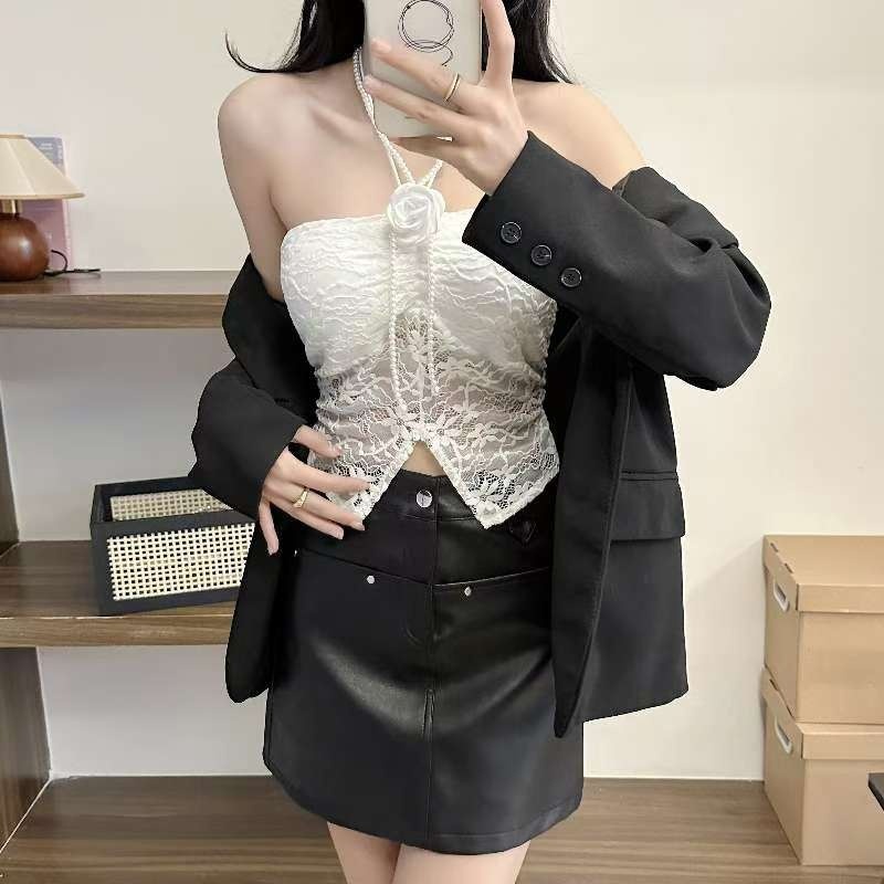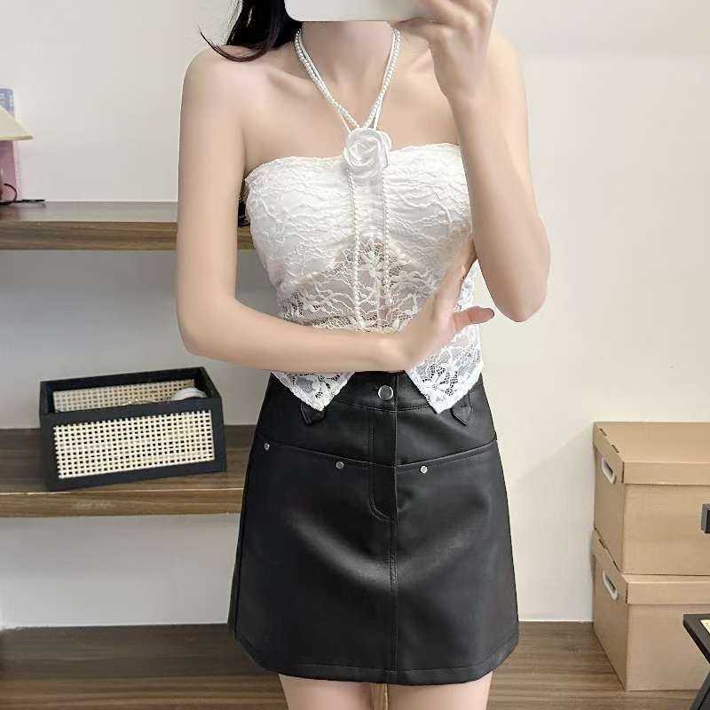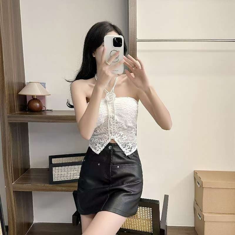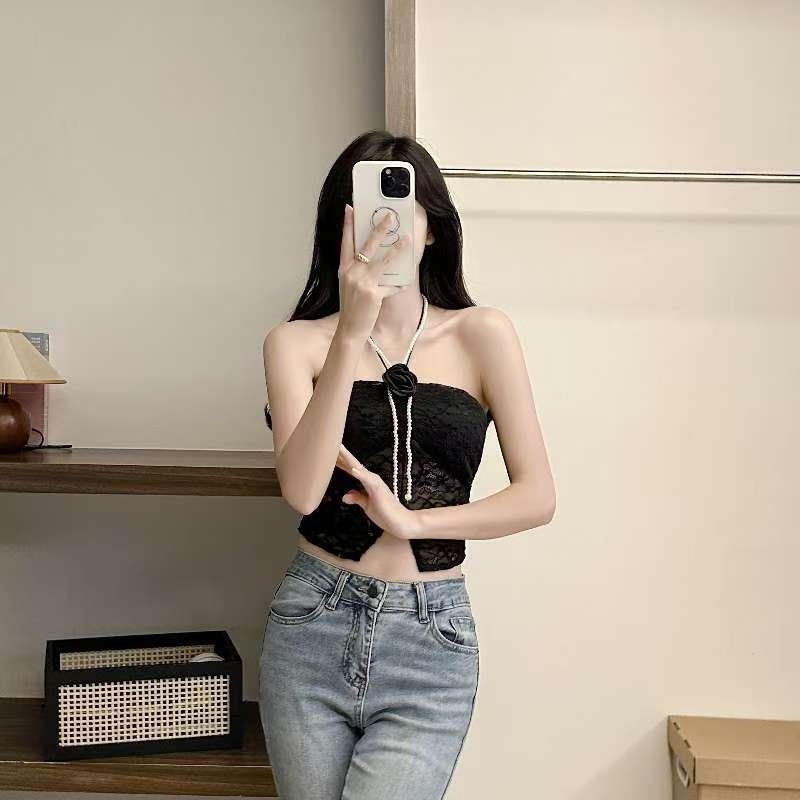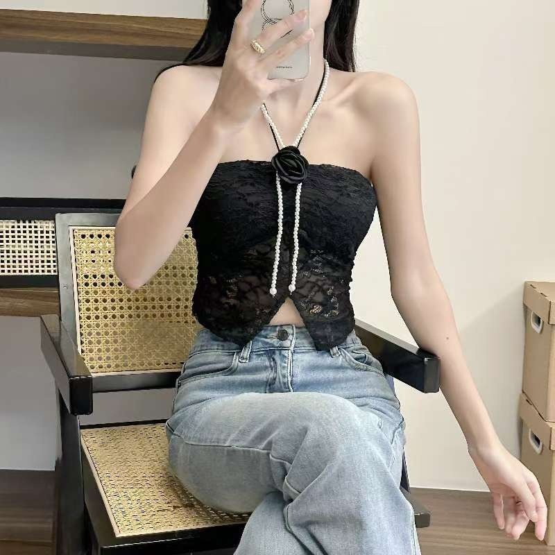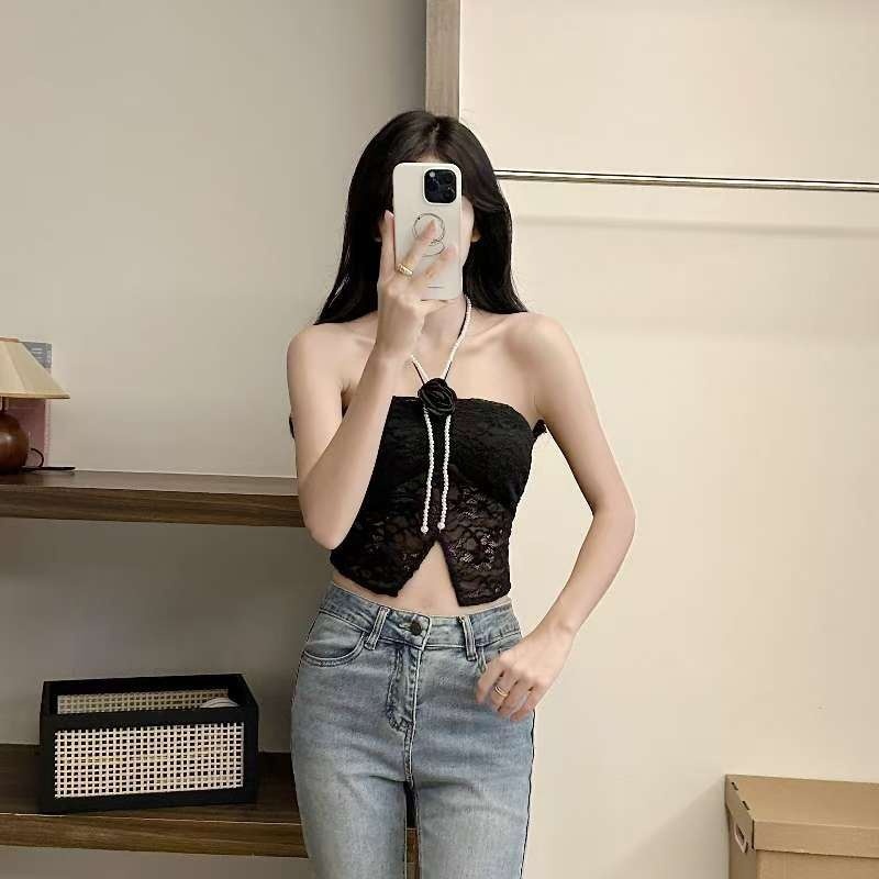 9074#甜辣珍珠花朵蕾丝挂脖抹胸女 蕾丝美背文胸一体背心性感上衣