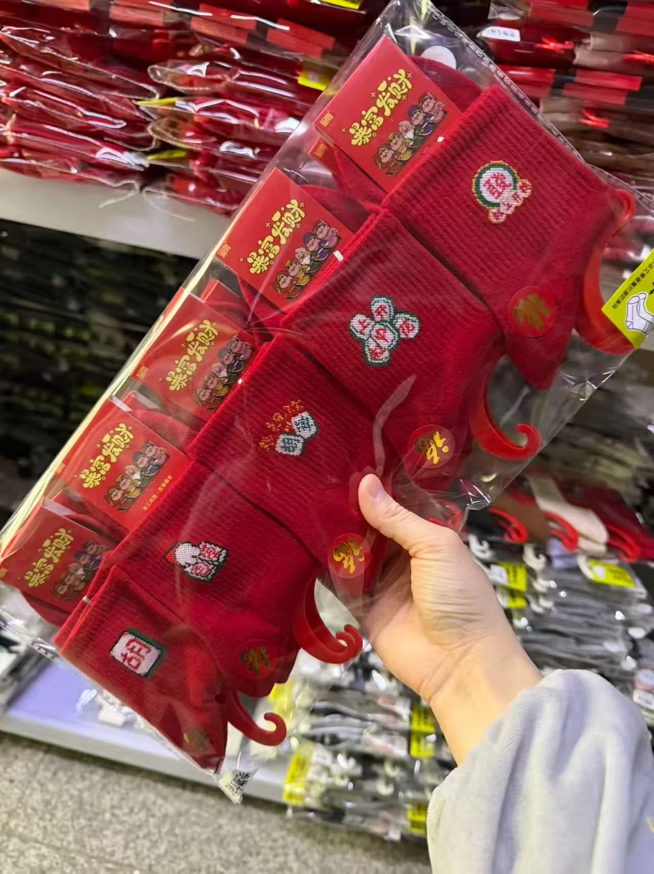 本命年新款男女士运动大红袜子新款中筒福字无骨缝合棉袜批发代发