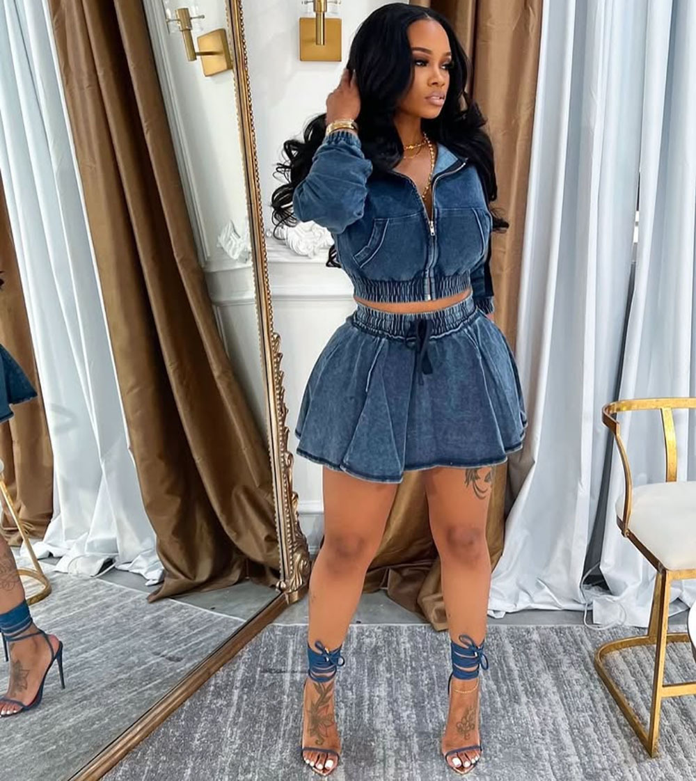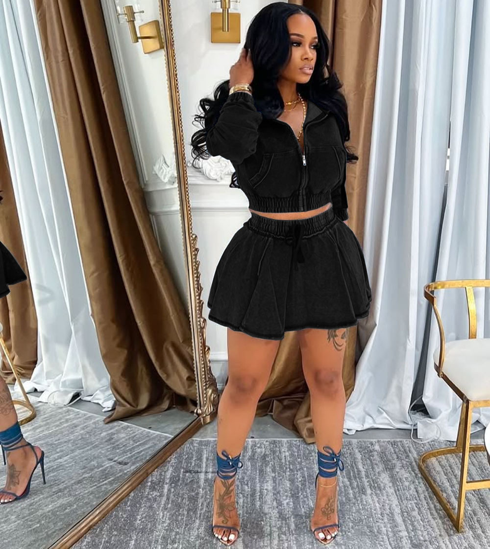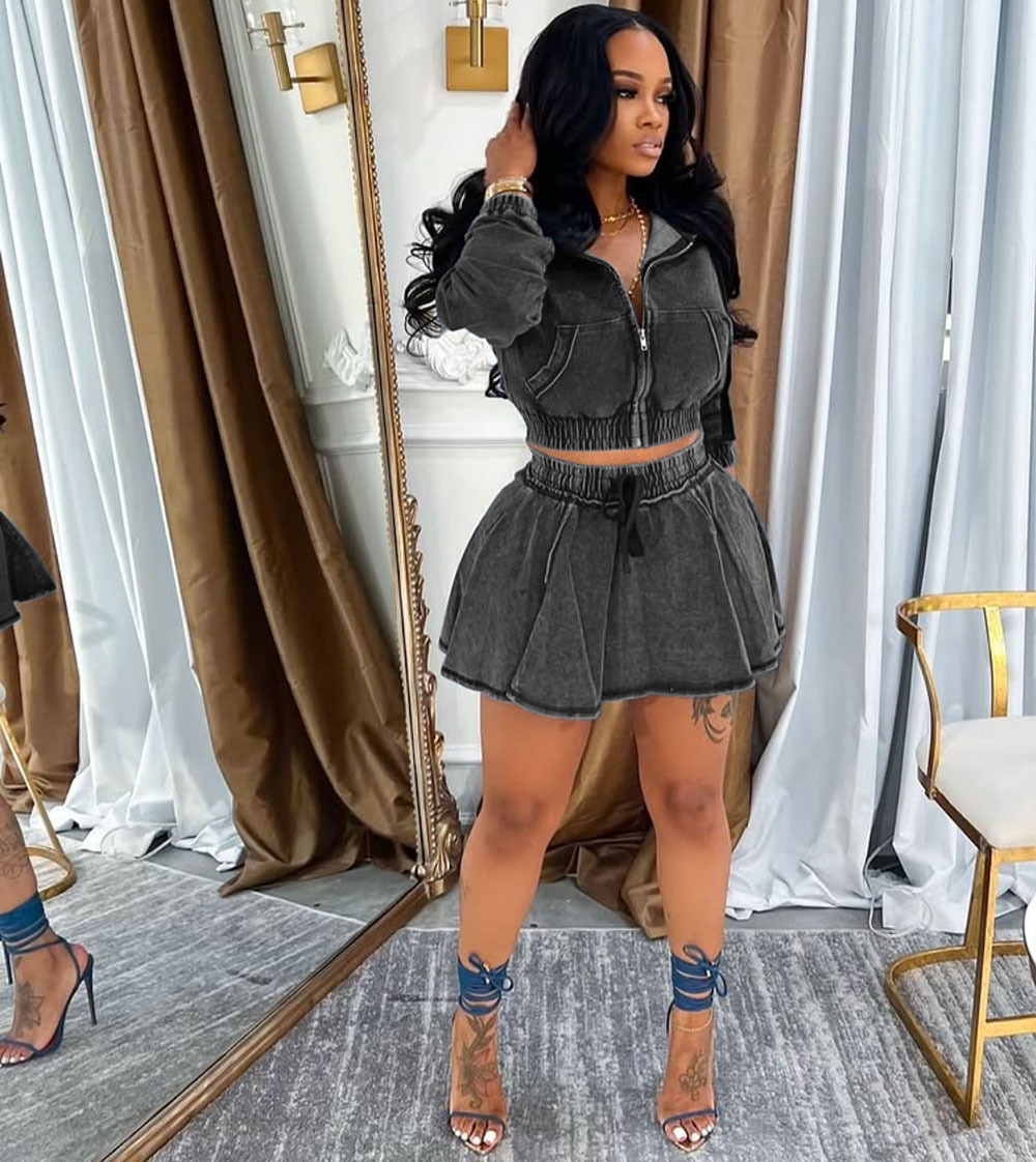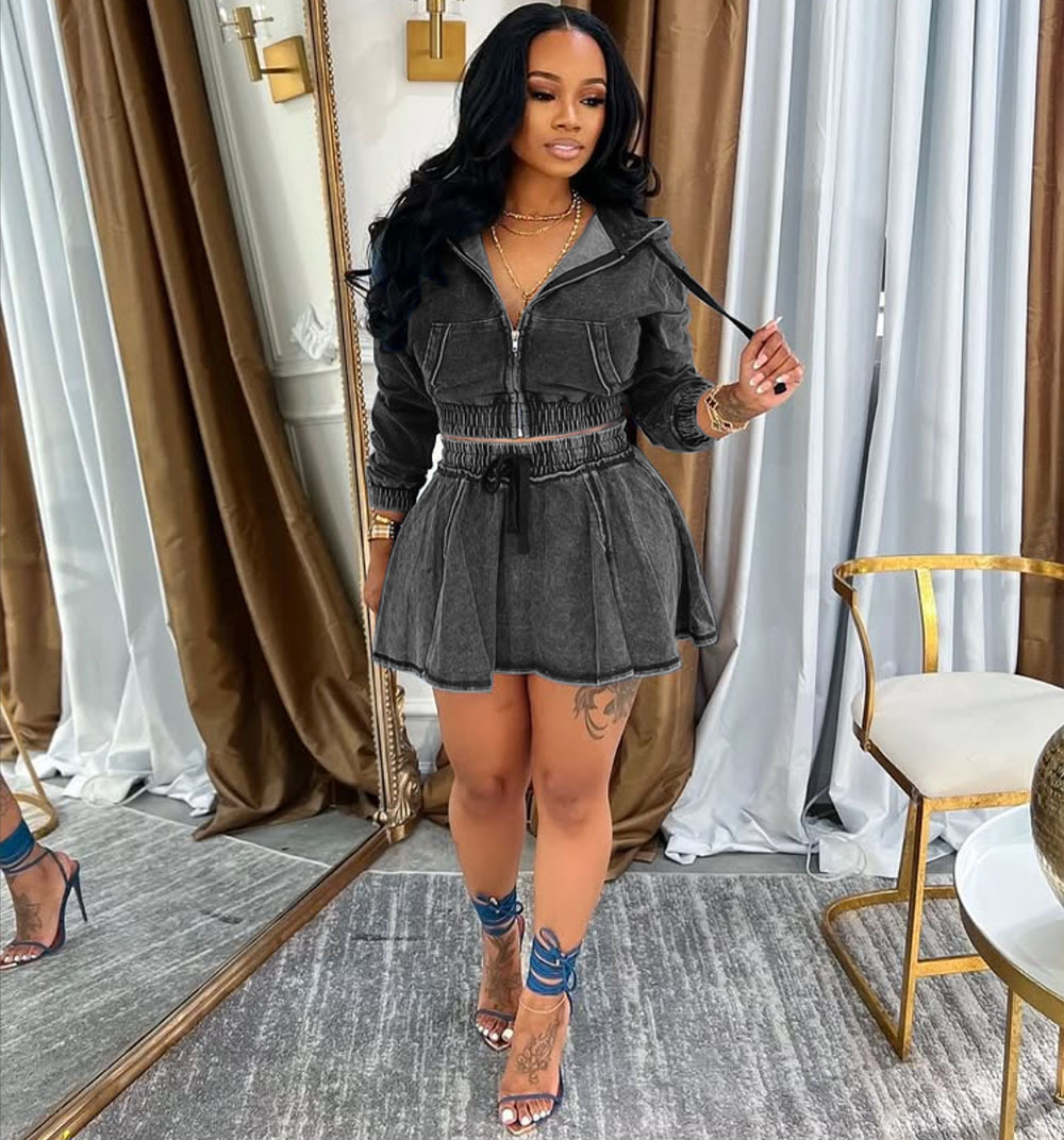 欧美女式牛仔裙套装 松紧腰褶皱牛仔短裙 长袖连帽牛仔外套