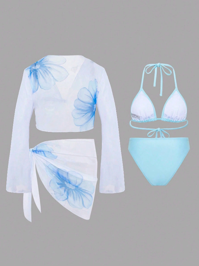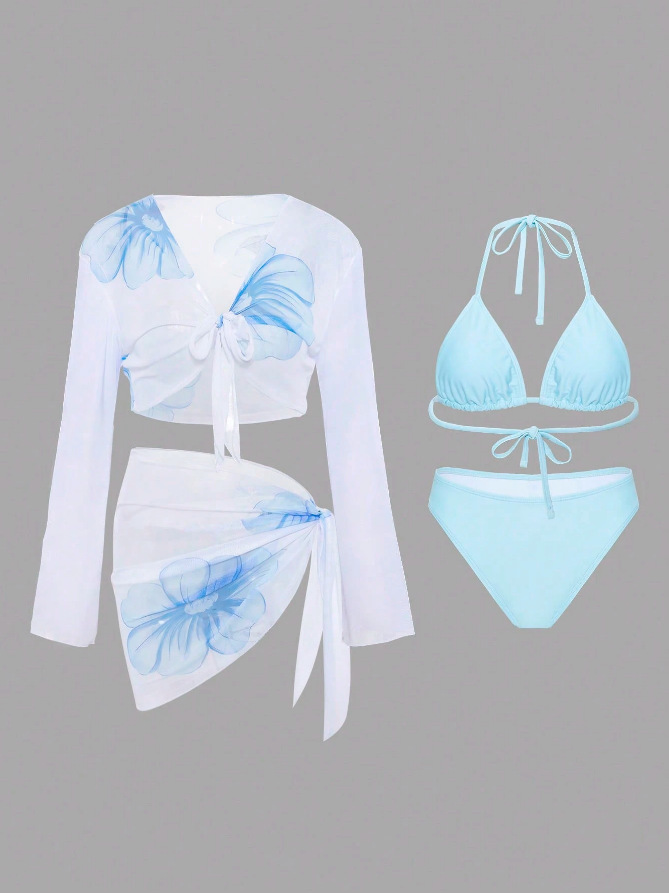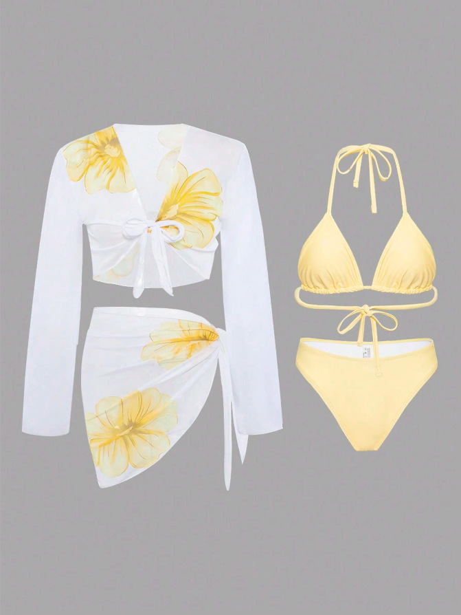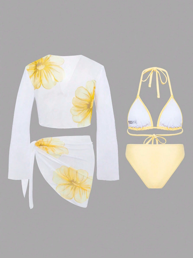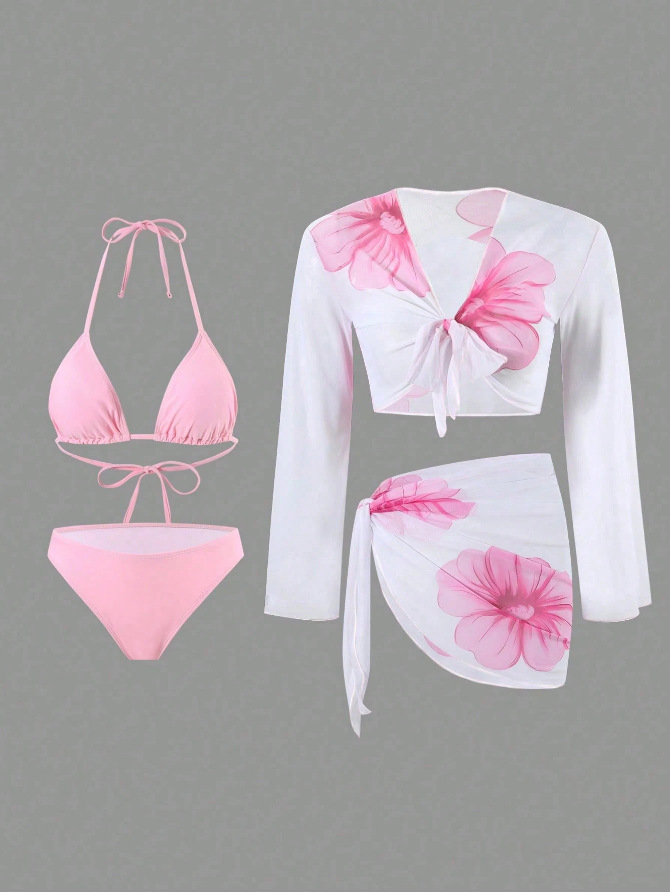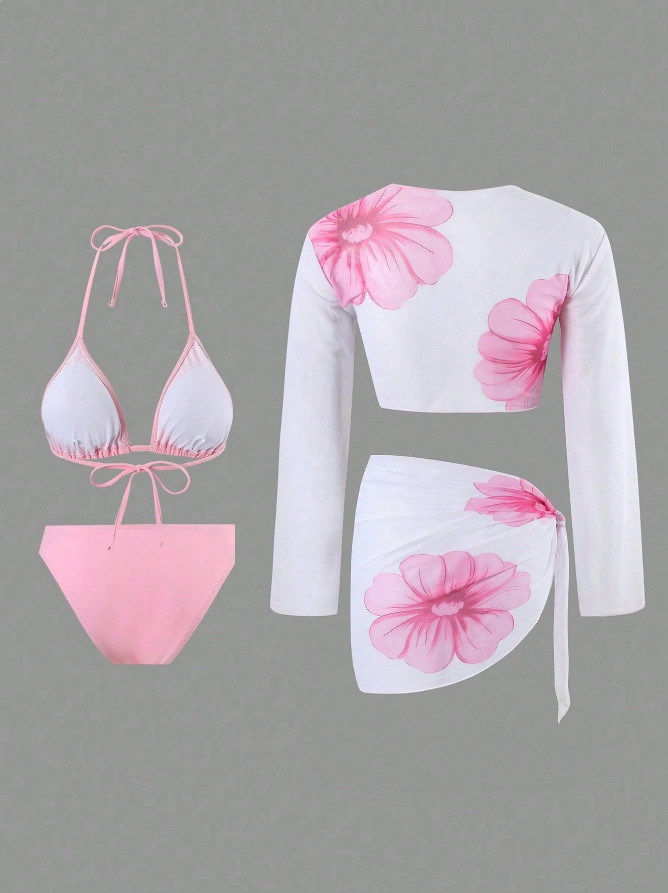 泳衣女纯欲bikini性感比基尼分体防晒罩衫显瘦辣妹欧美泳装四件套