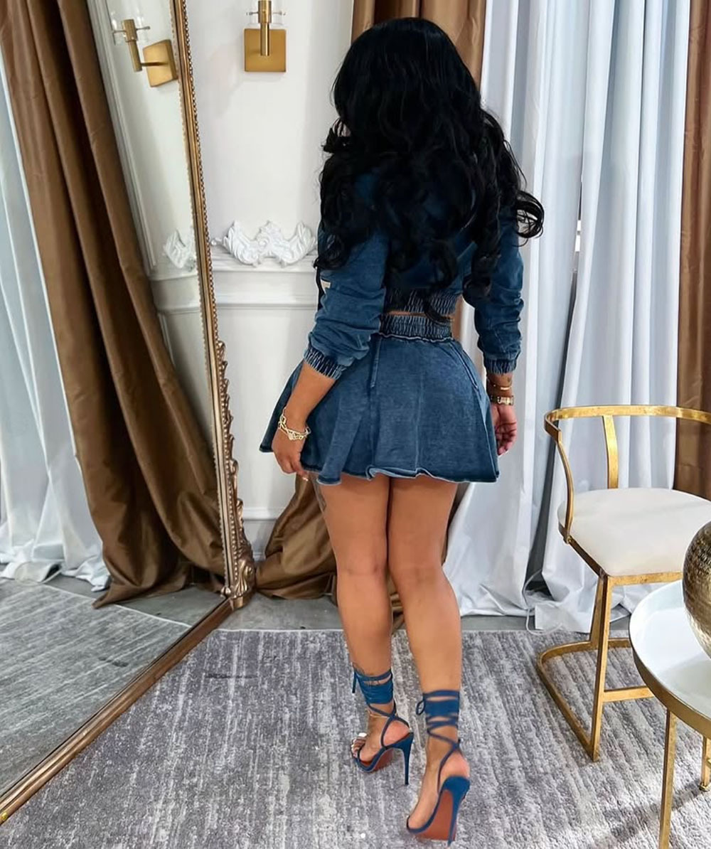 欧美女式休闲裙套装亚马逊跨境货源秋冬新款女装水洗牛仔夹克短裙