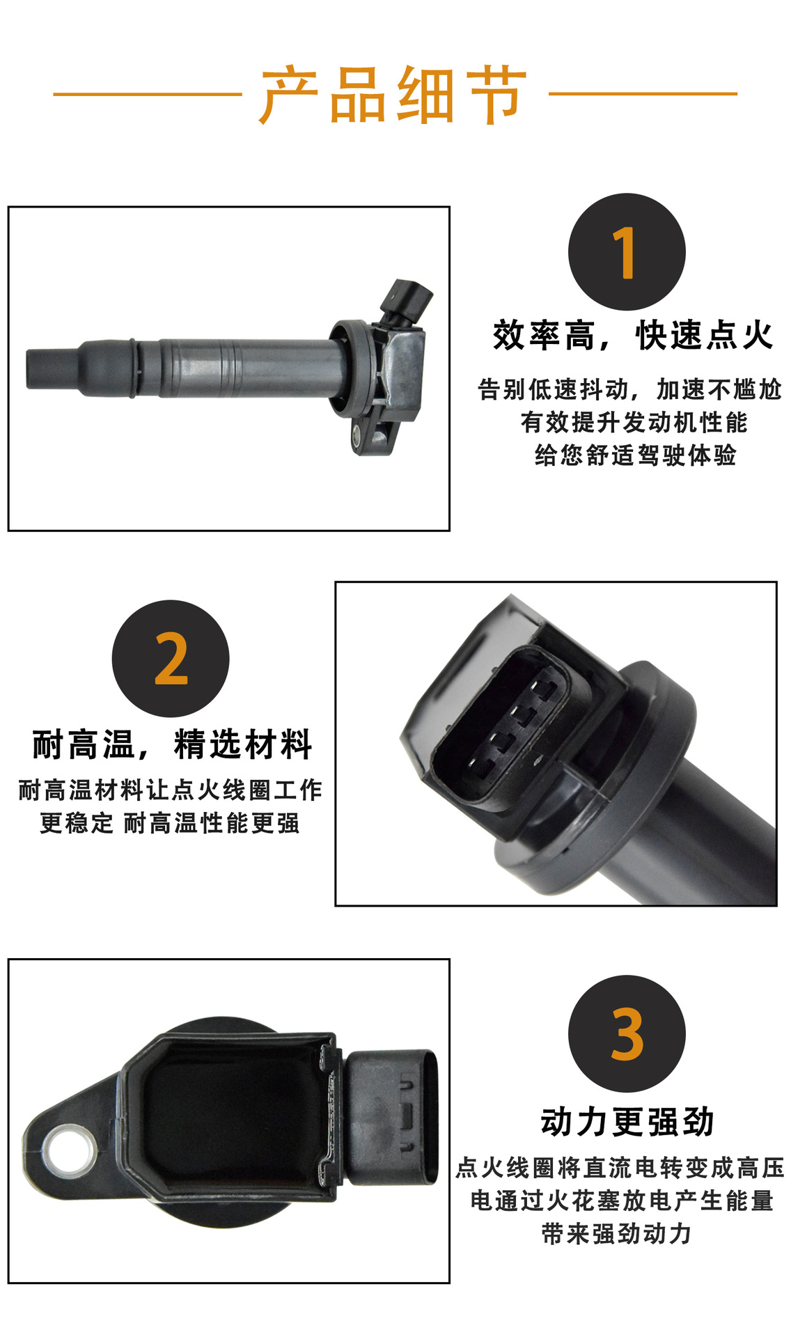 耐用材料:使用高质量绝缘材料和耐高温组件,增强点火线圈的稳定性和寿命,适应各种恶劣工作环境。
