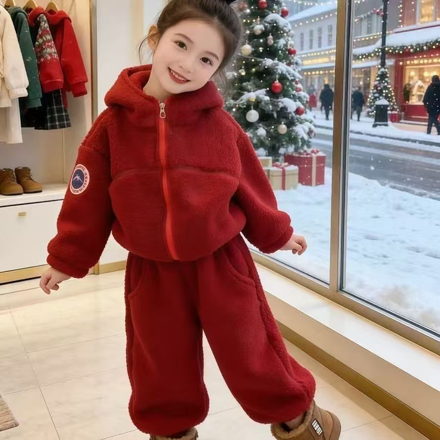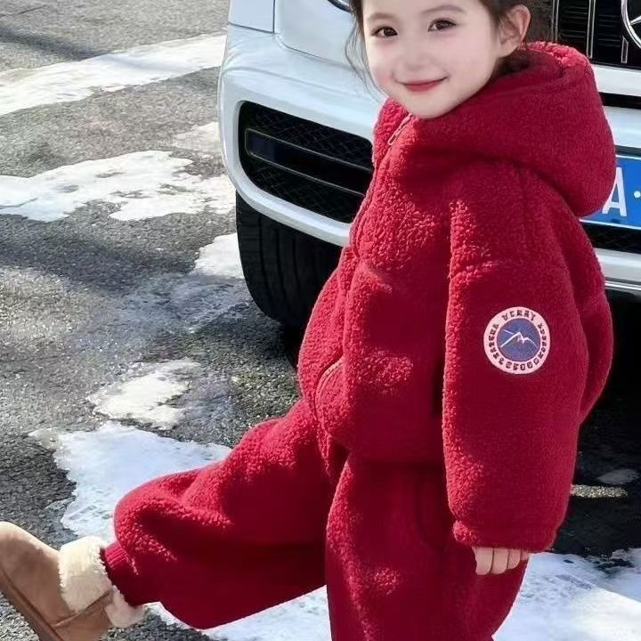 女童冬季加绒加厚套装新款儿童2025宝宝洋气两件套红色喜庆两件套