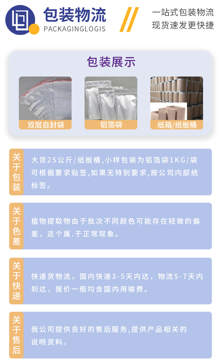 【包装方式】大货纸板桶装,小货为铝箔袋装。