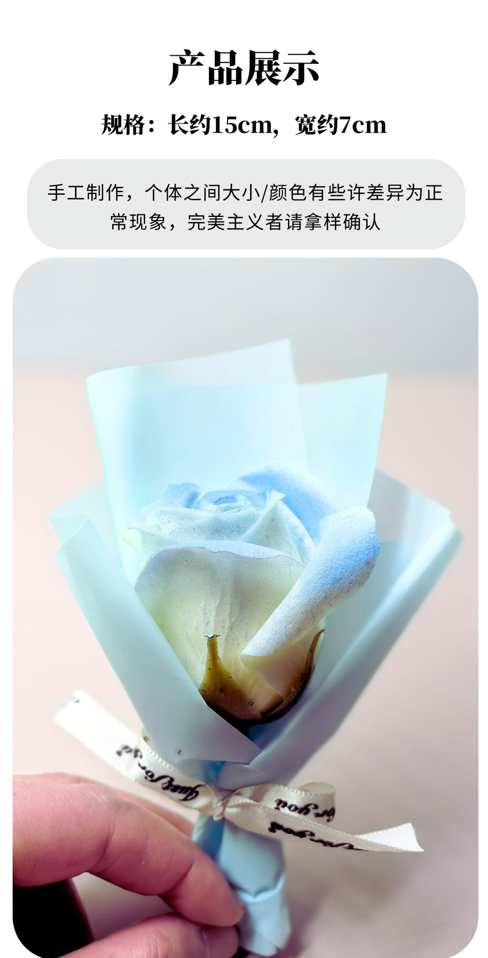 1、本品为包好的成品,纯手工制作,每束会有一些小差异!测量尺寸为手工测量稍有差异。
