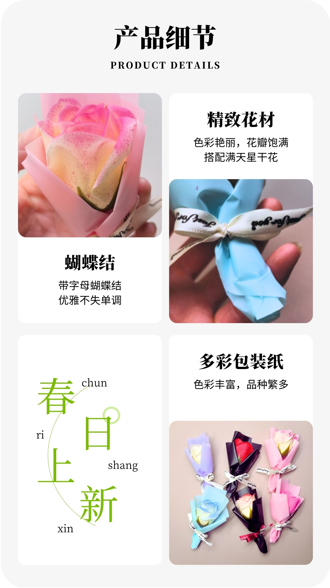 6、不同显示器以及个体感受,花束批次之间存在色差,请以实际为准,建议拿样确认。
