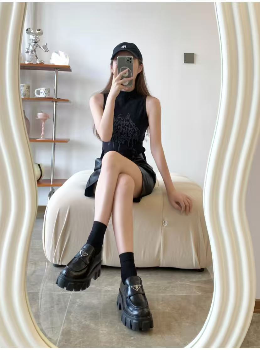 42码P三角标厚底小皮鞋女2025年秋冬休闲百搭增高乐福鞋单鞋厚底