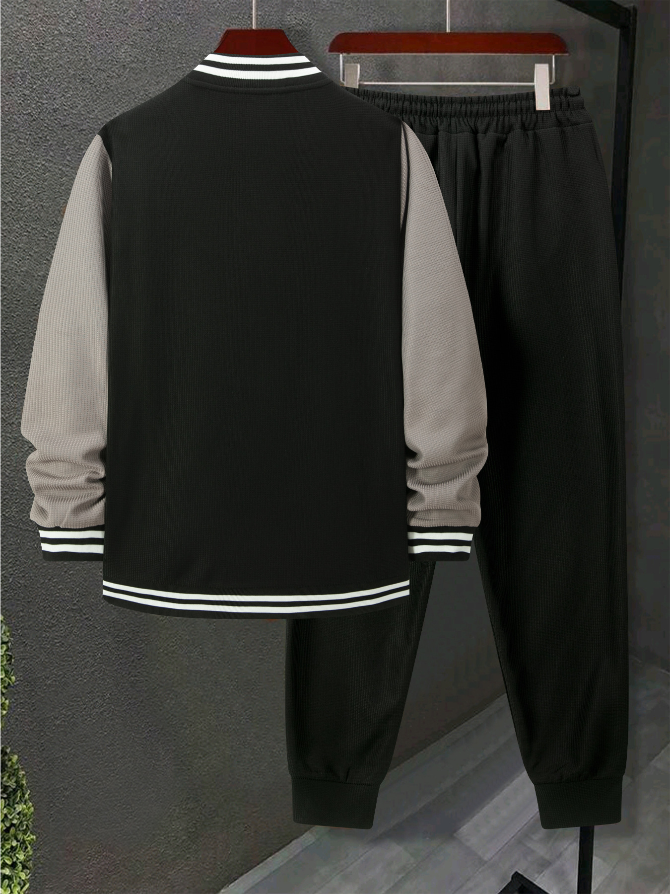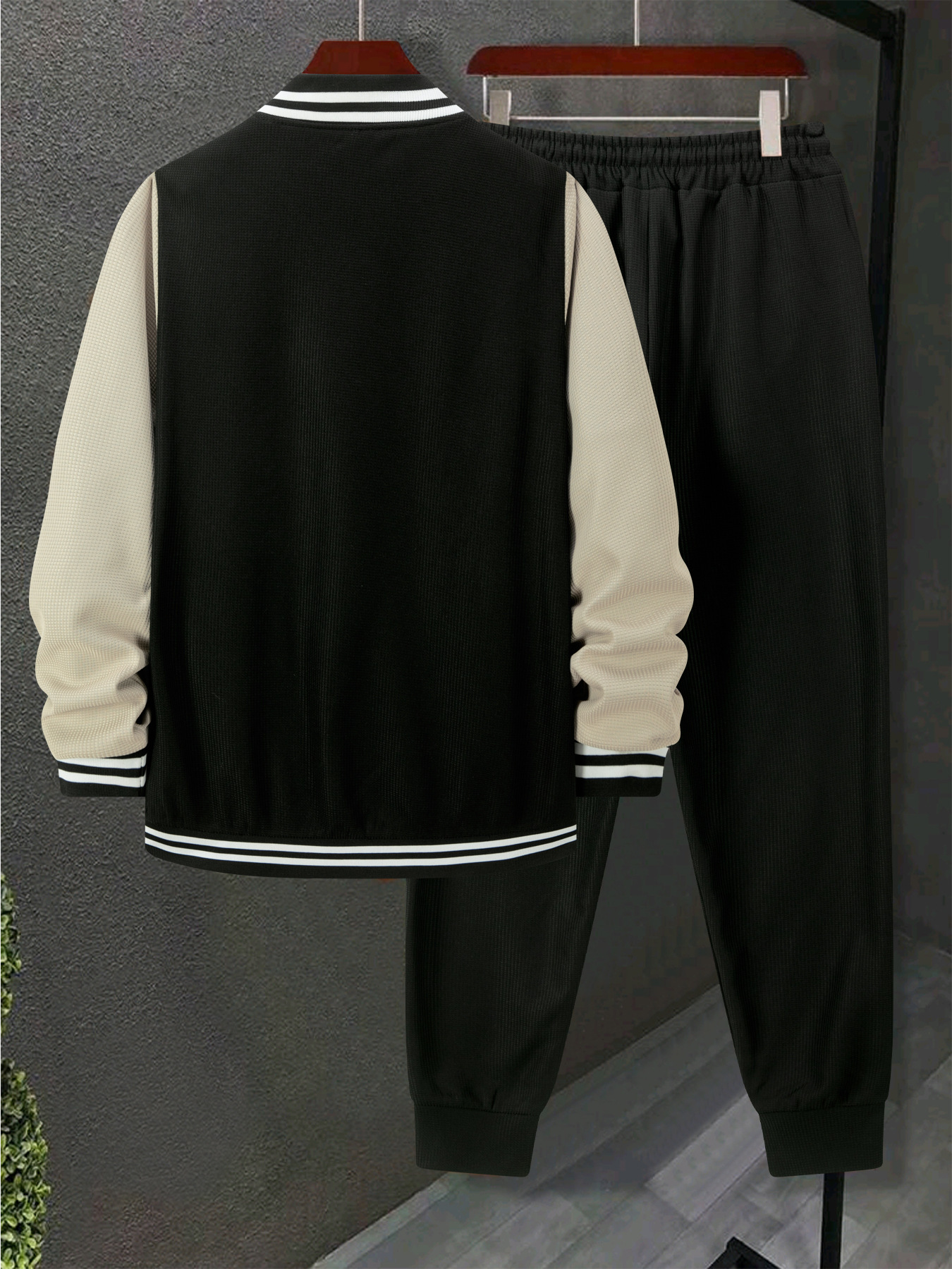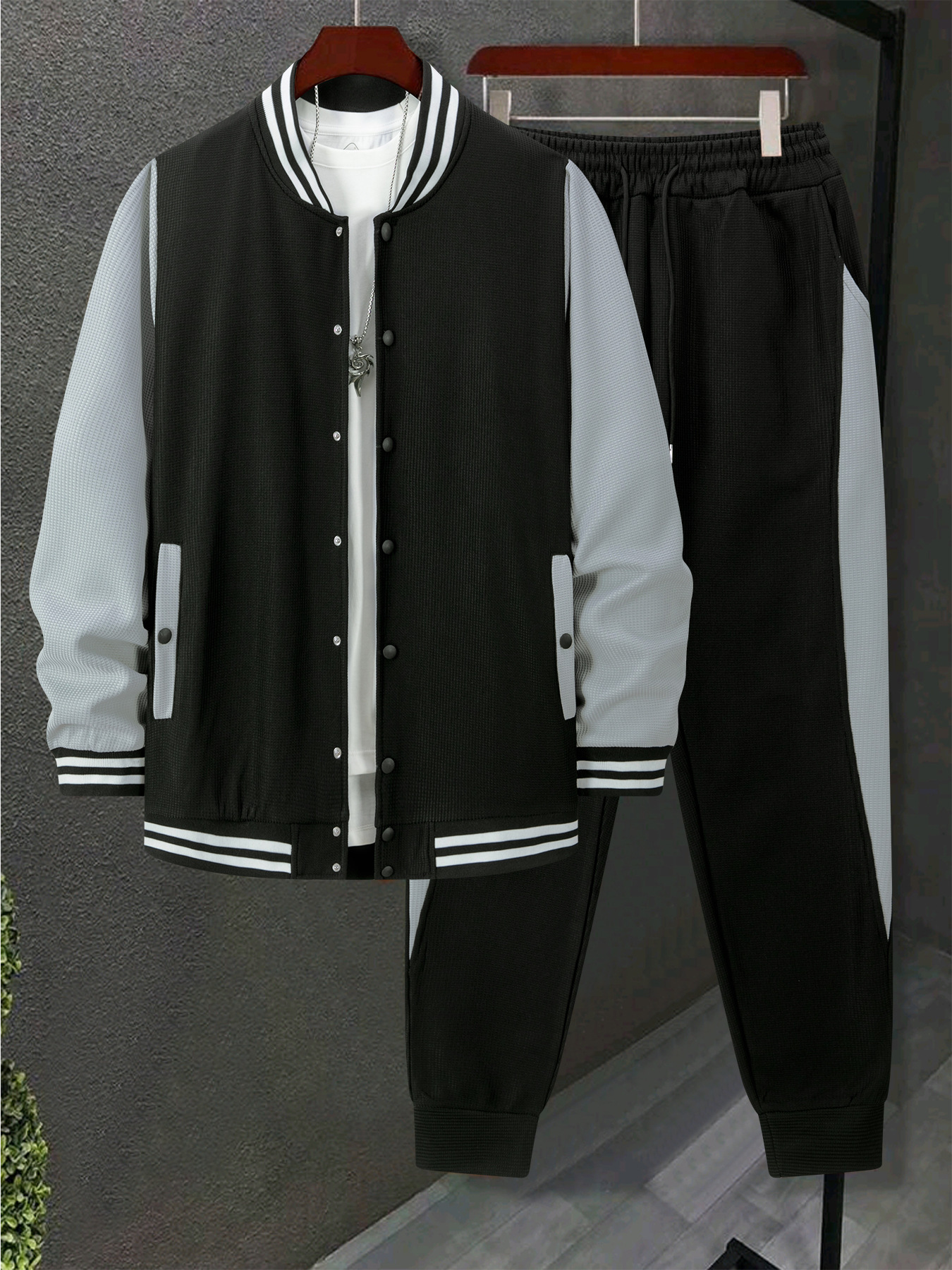 跨境秋冬新款棒球服休闲百搭加绒华夫格开衫外套拼色运动长裤套装