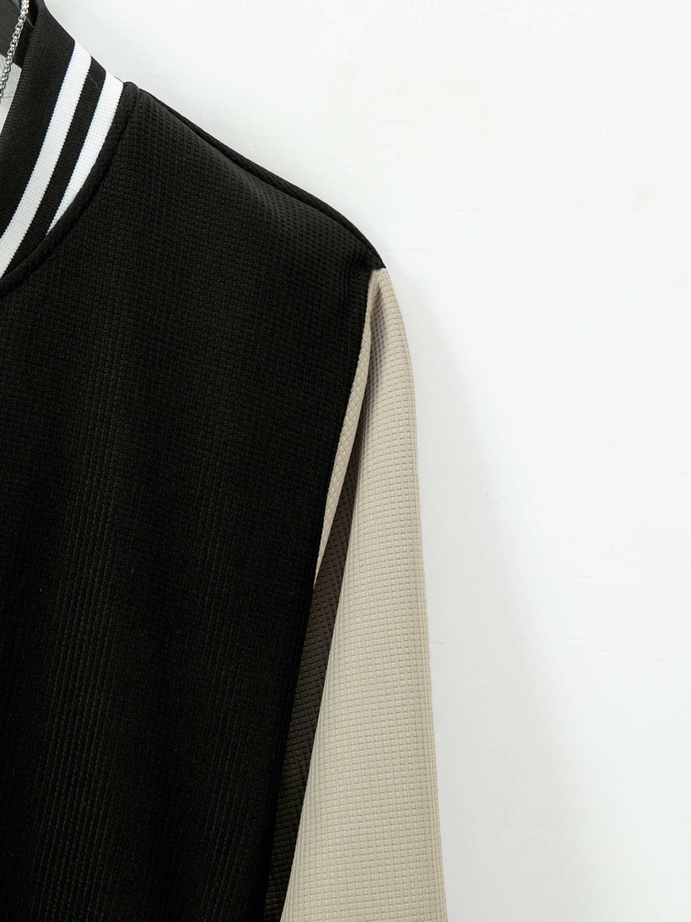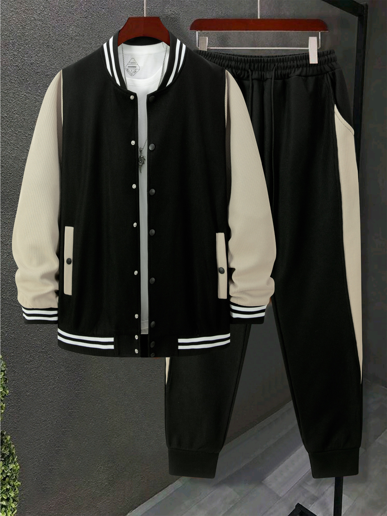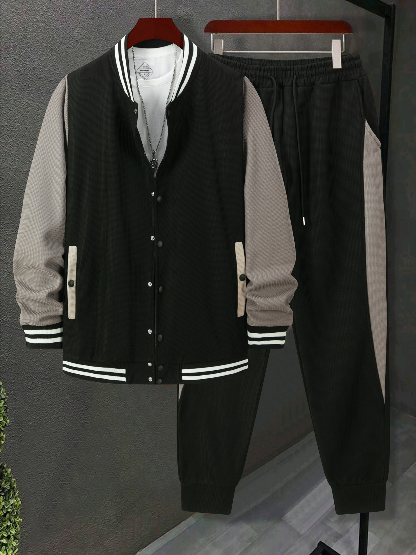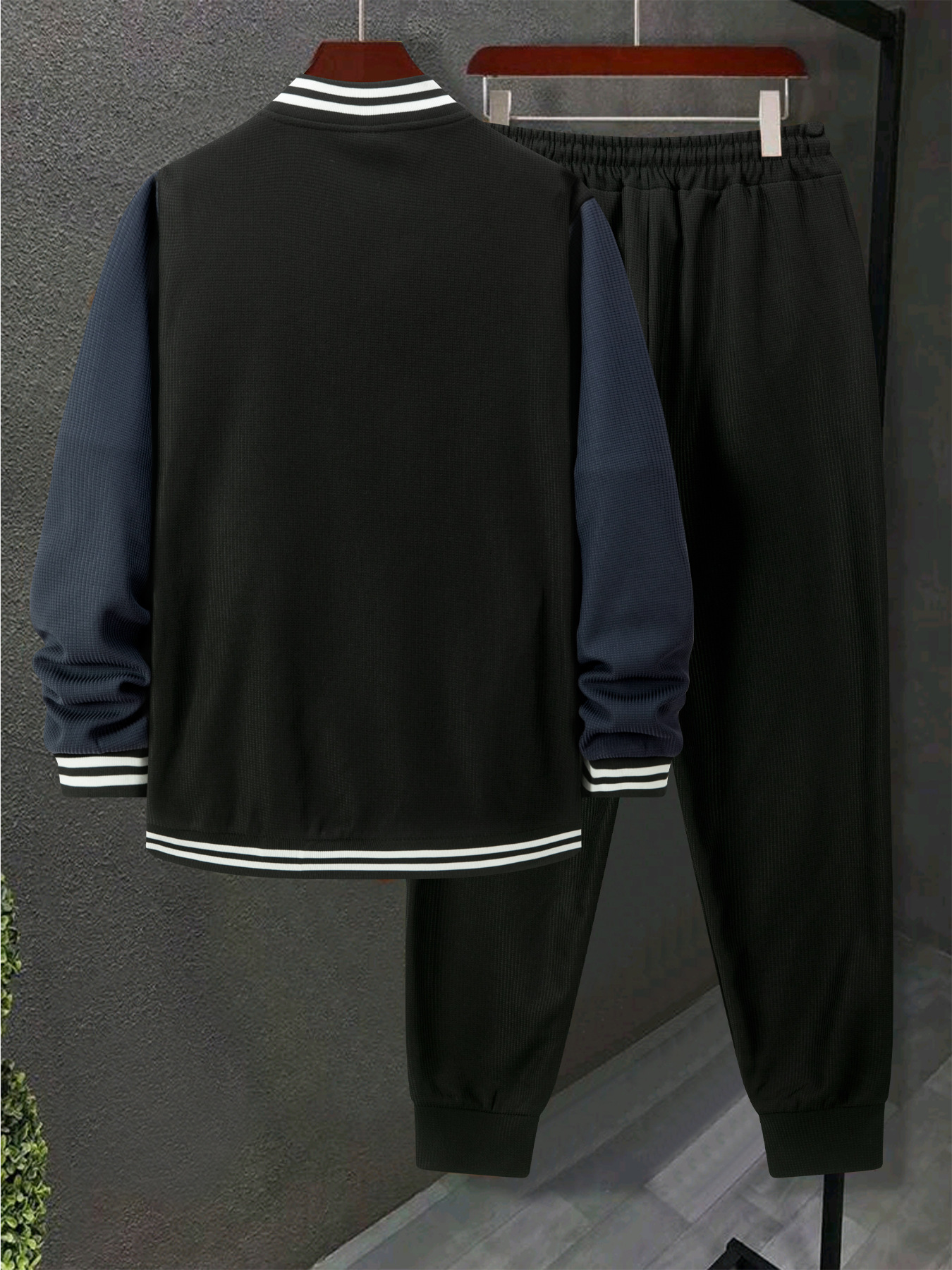 跨境秋冬新款棒球服休闲百搭加绒华夫格开衫外套拼色运动长裤套装