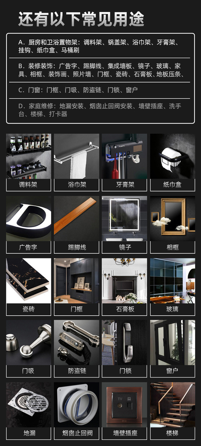 免钉胶强力胶粘墙建材粘铁防水免打孔卫浴柜门型代钉胶点霸专用型,批发价,价格:0.14,厂家直销,免钉胶强力胶粘墙建材粘铁防水免打孔卫浴柜门型代钉胶点霸专用型,免费拿样。