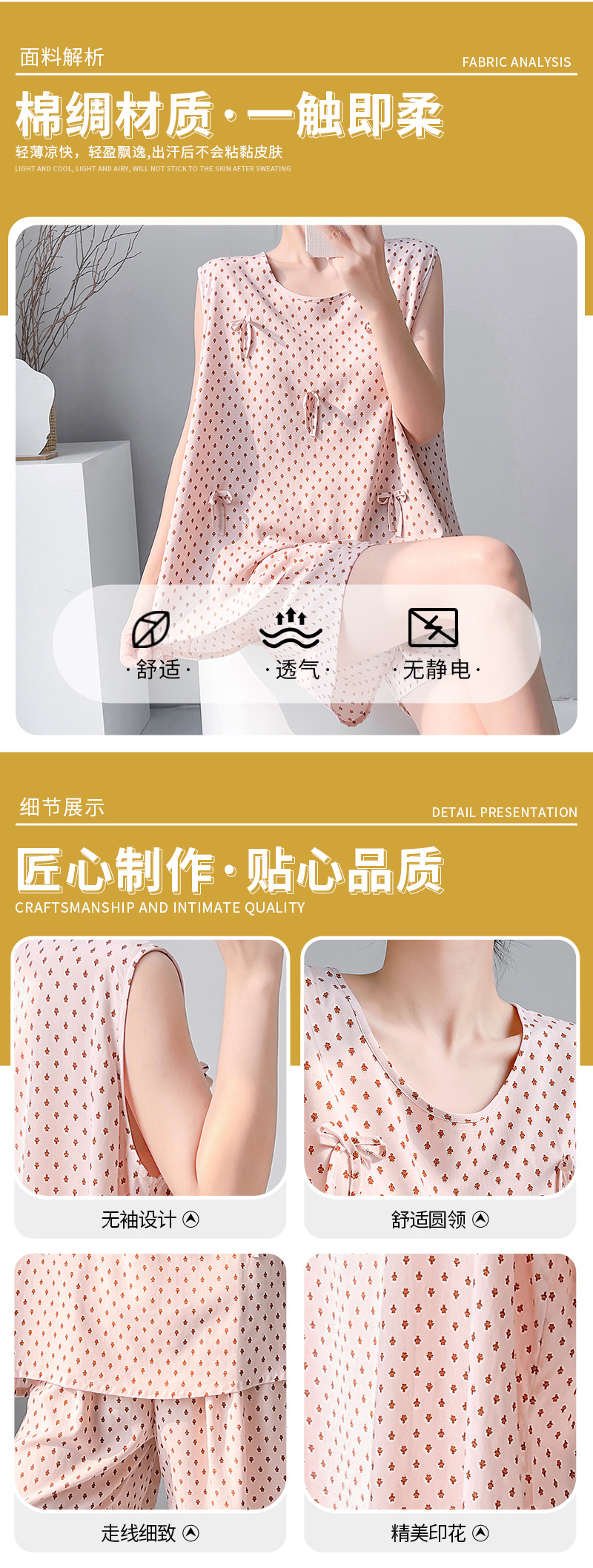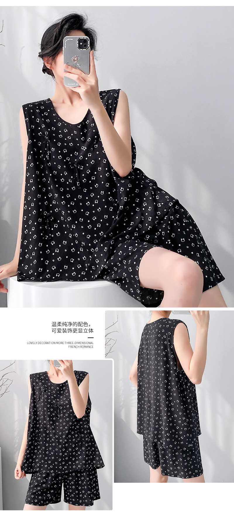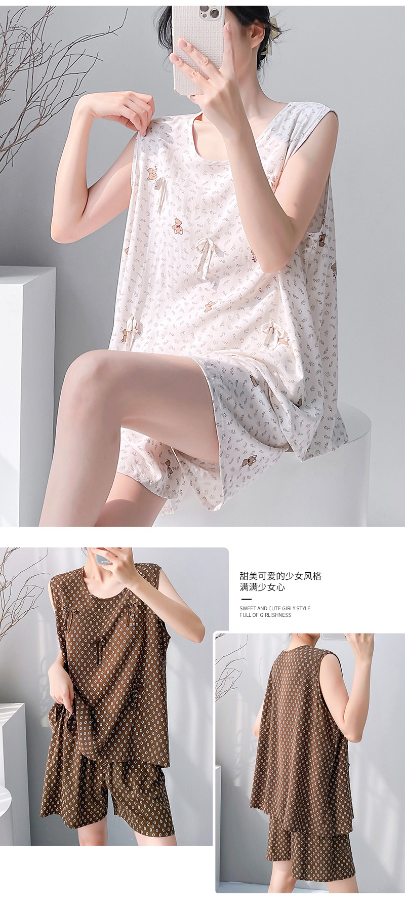 夏季绵绸睡裙无袖宽松春夏款女士家居服印花休闲宽松短裤套装现货