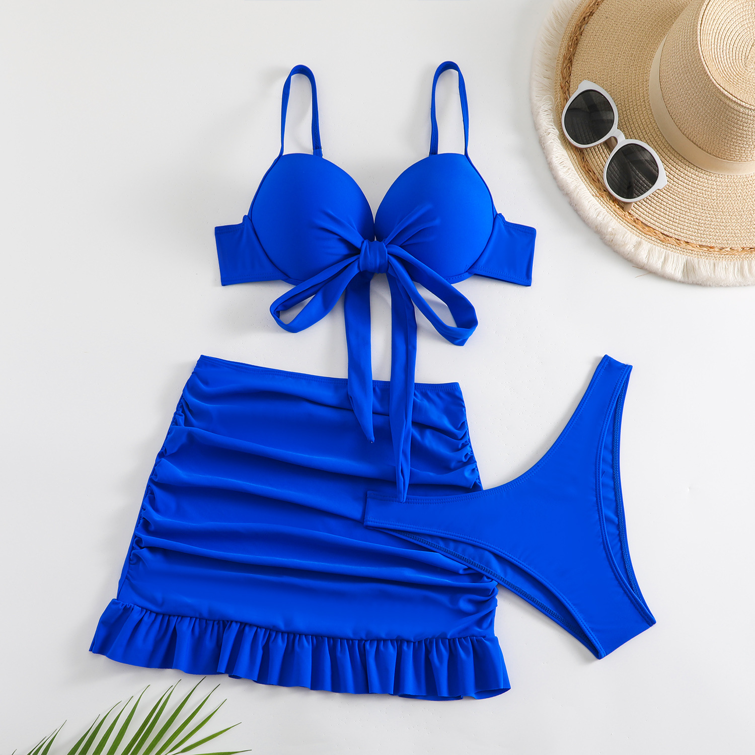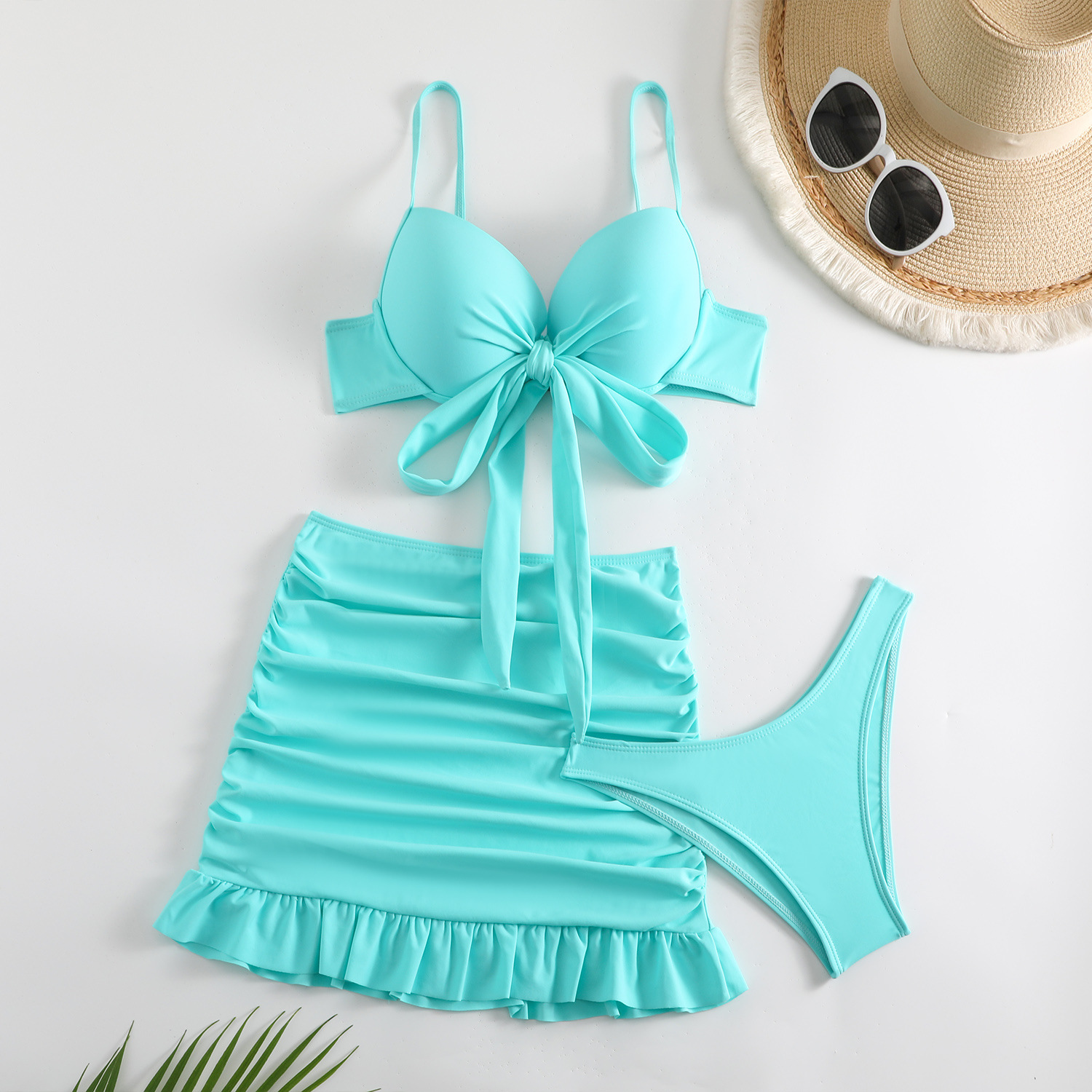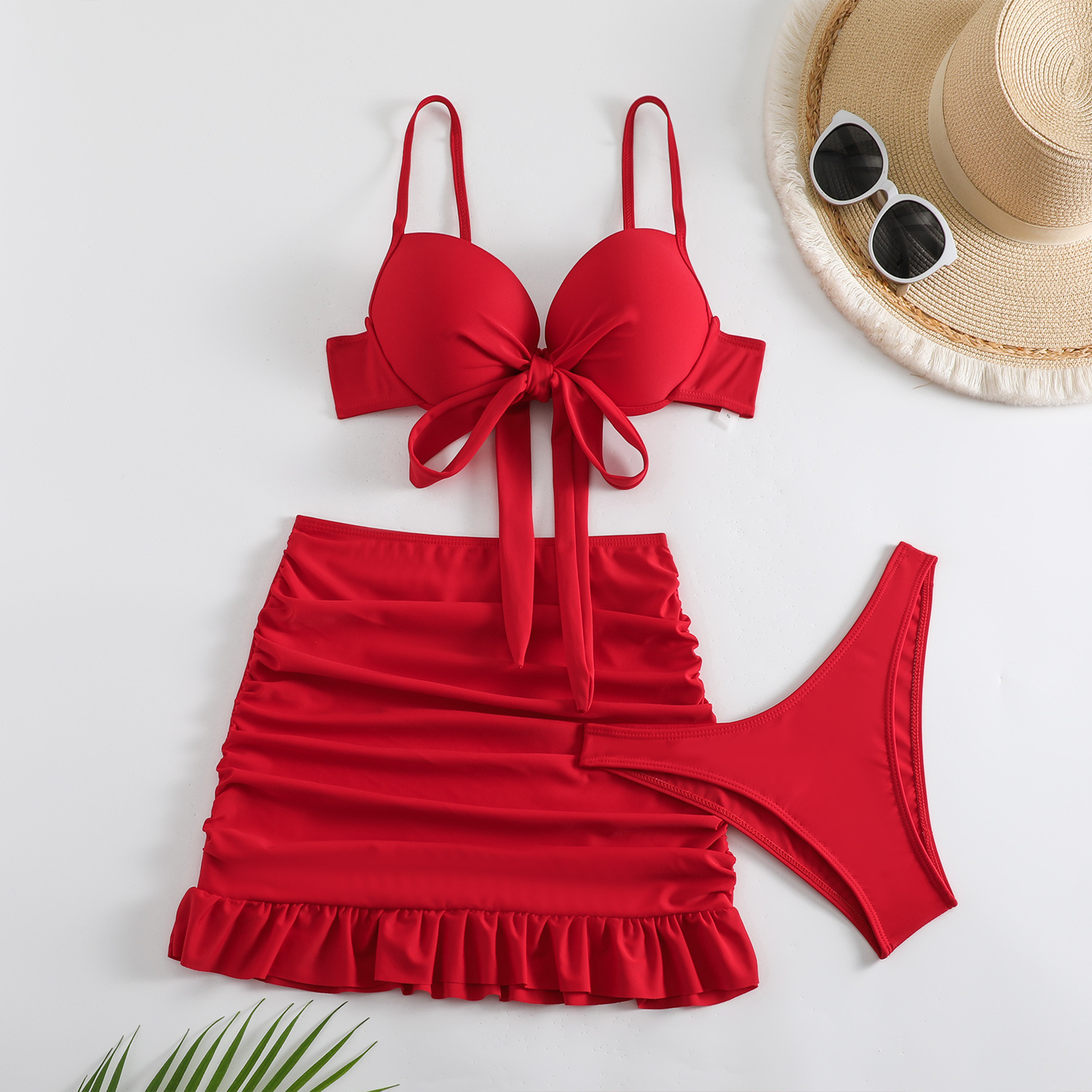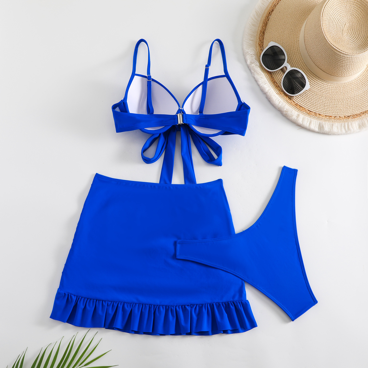 加工定制纯色分体泳衣女三件套欧美性感聚拢紧身绑带泳装性感紧身