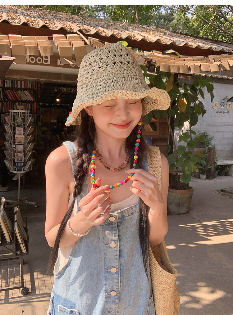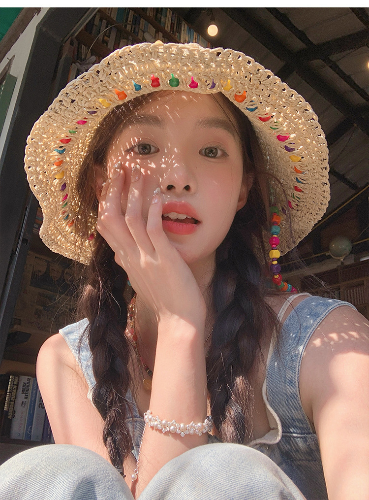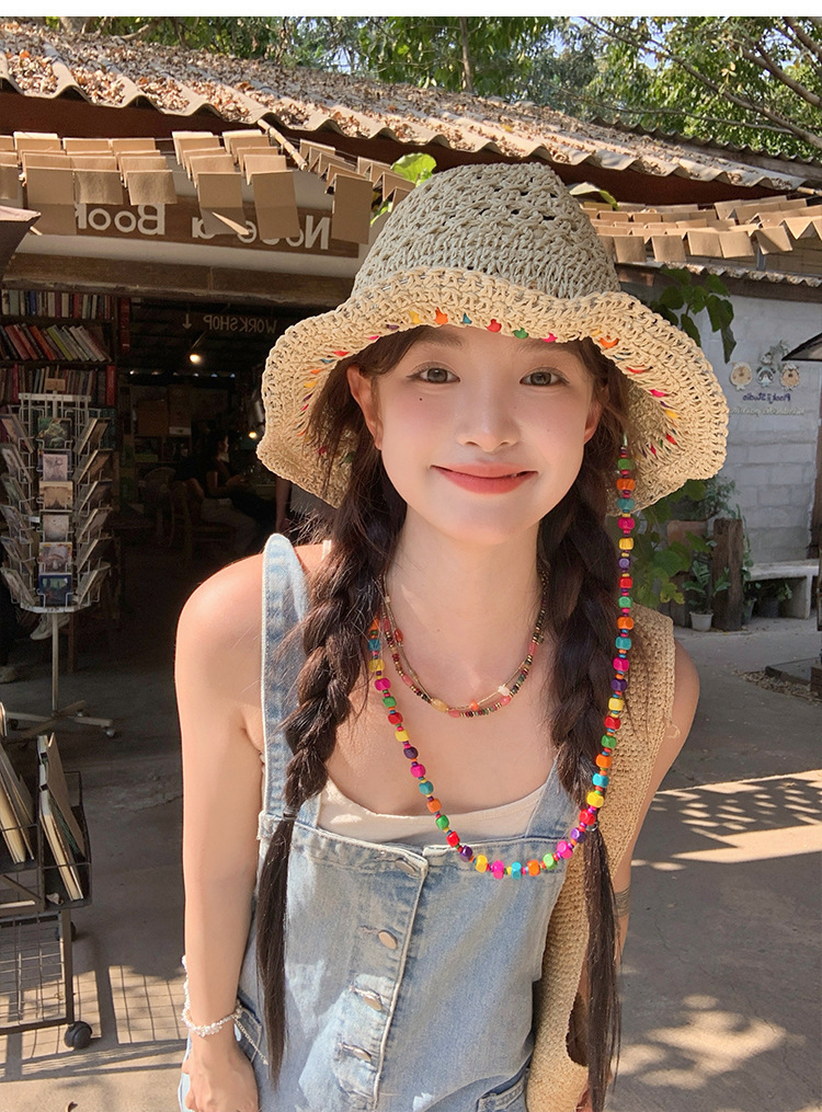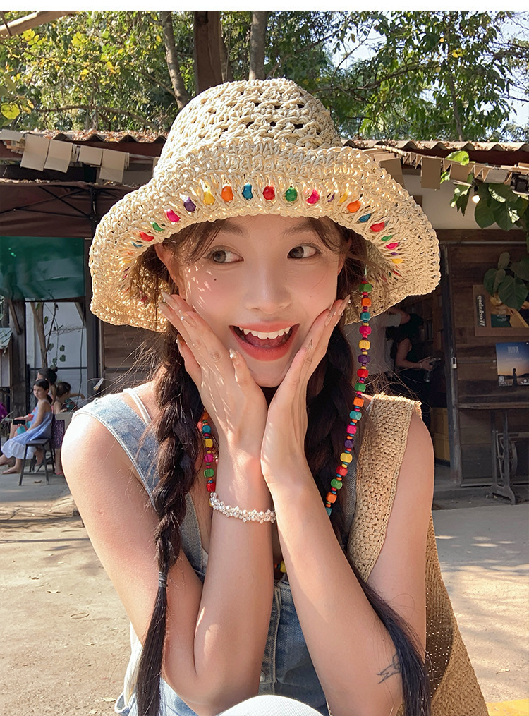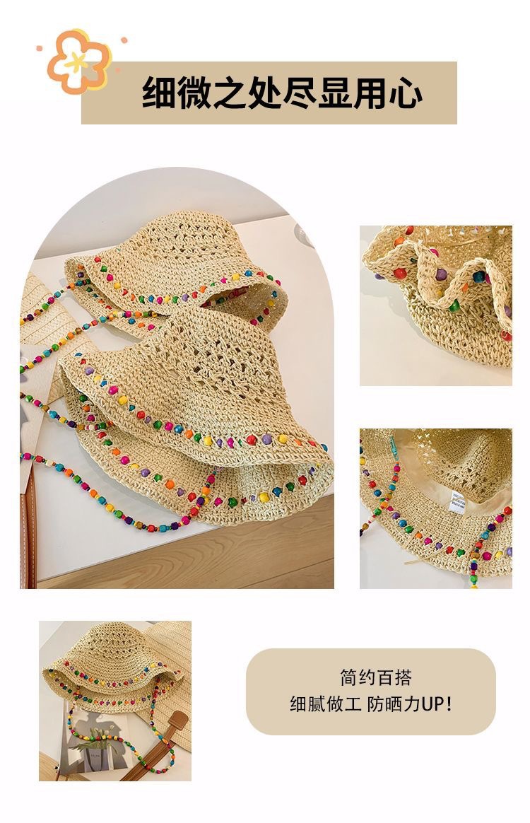 韩系ins彩色串珠草编渔夫帽夏季海边度假防晒遮阳草帽可折叠帽子