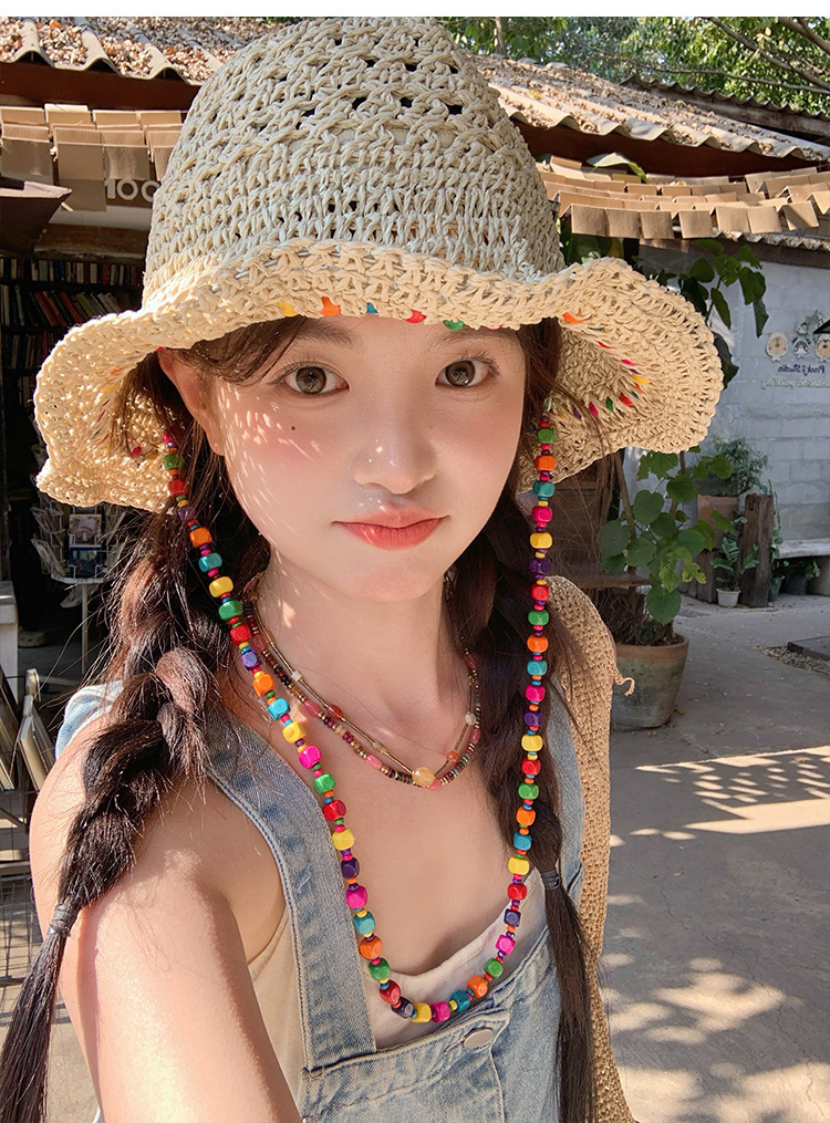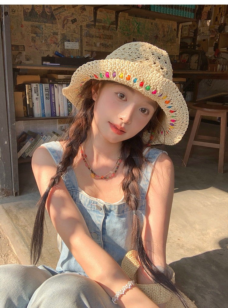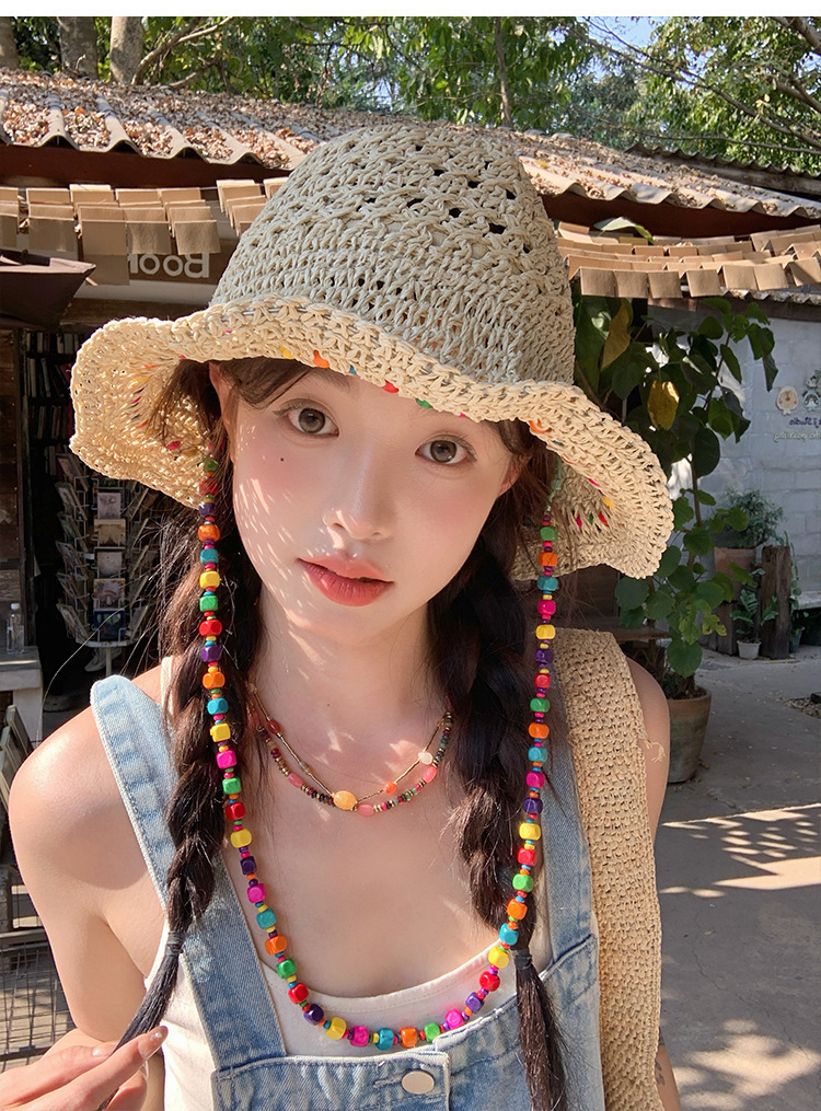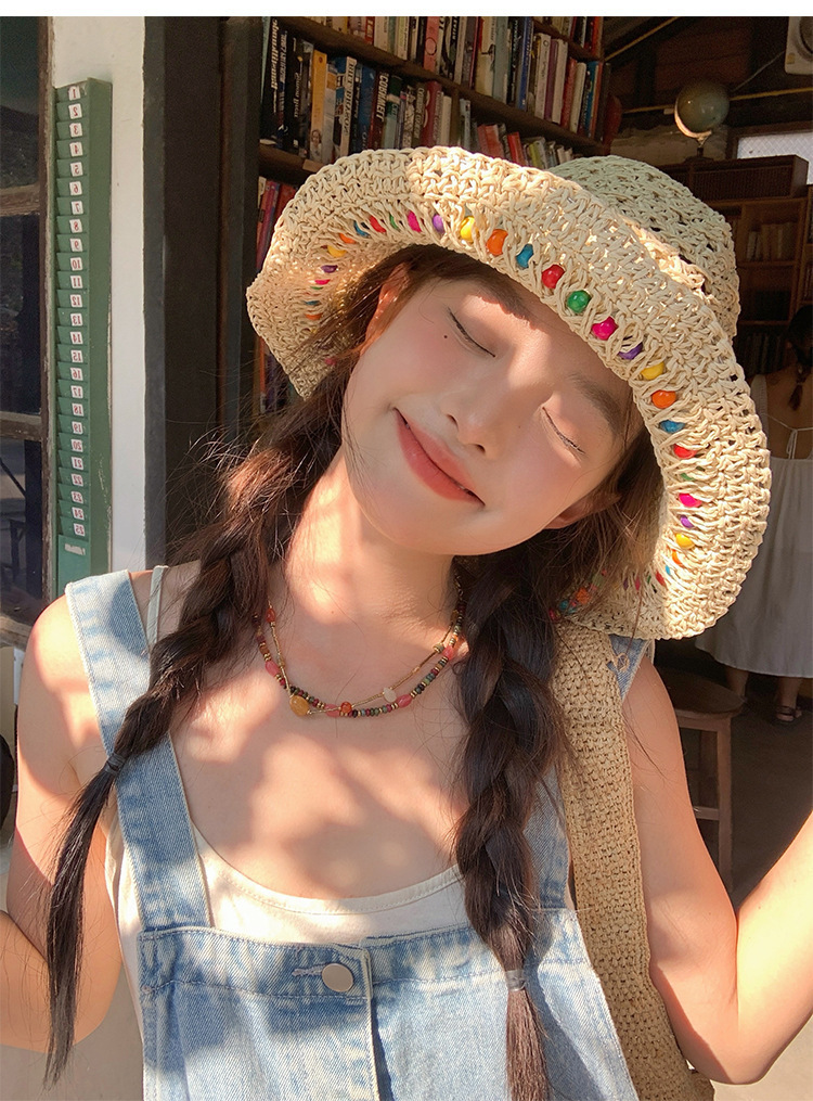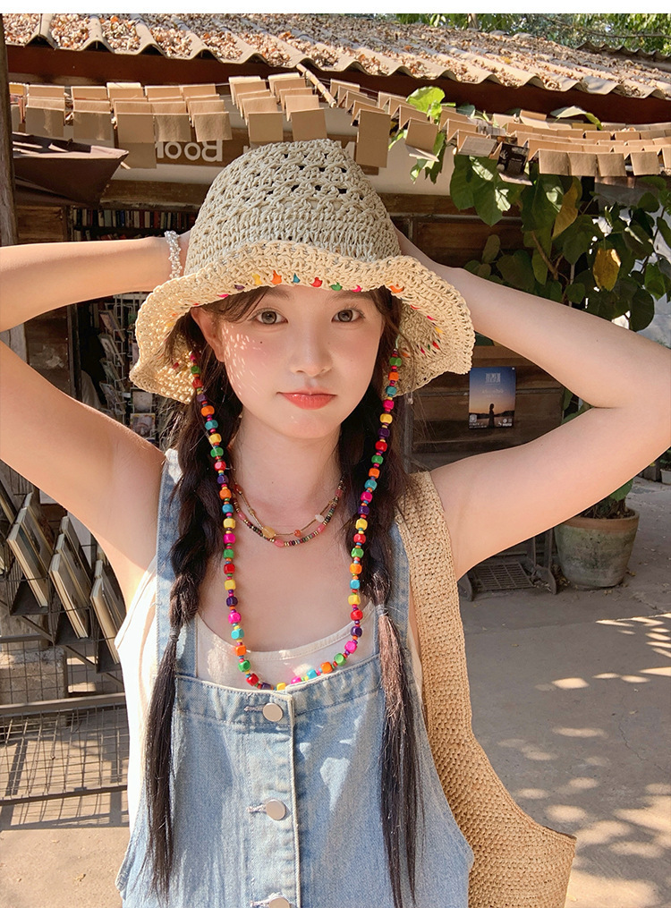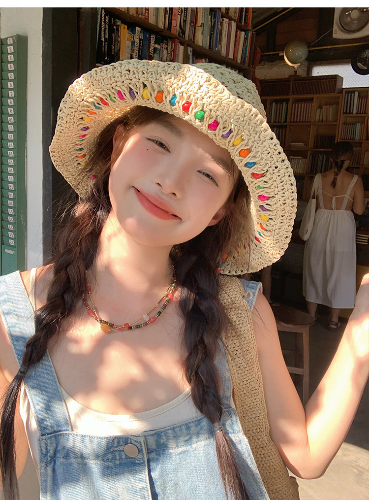 韩系ins彩色串珠草编渔夫帽夏季海边度假防晒遮阳草帽可折叠帽子