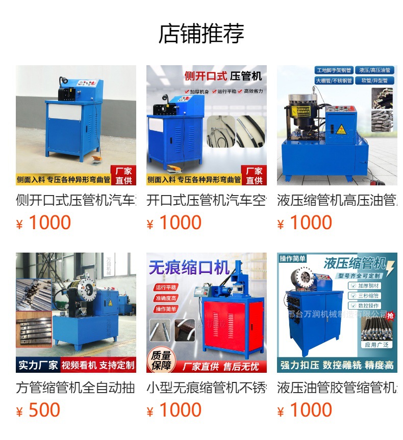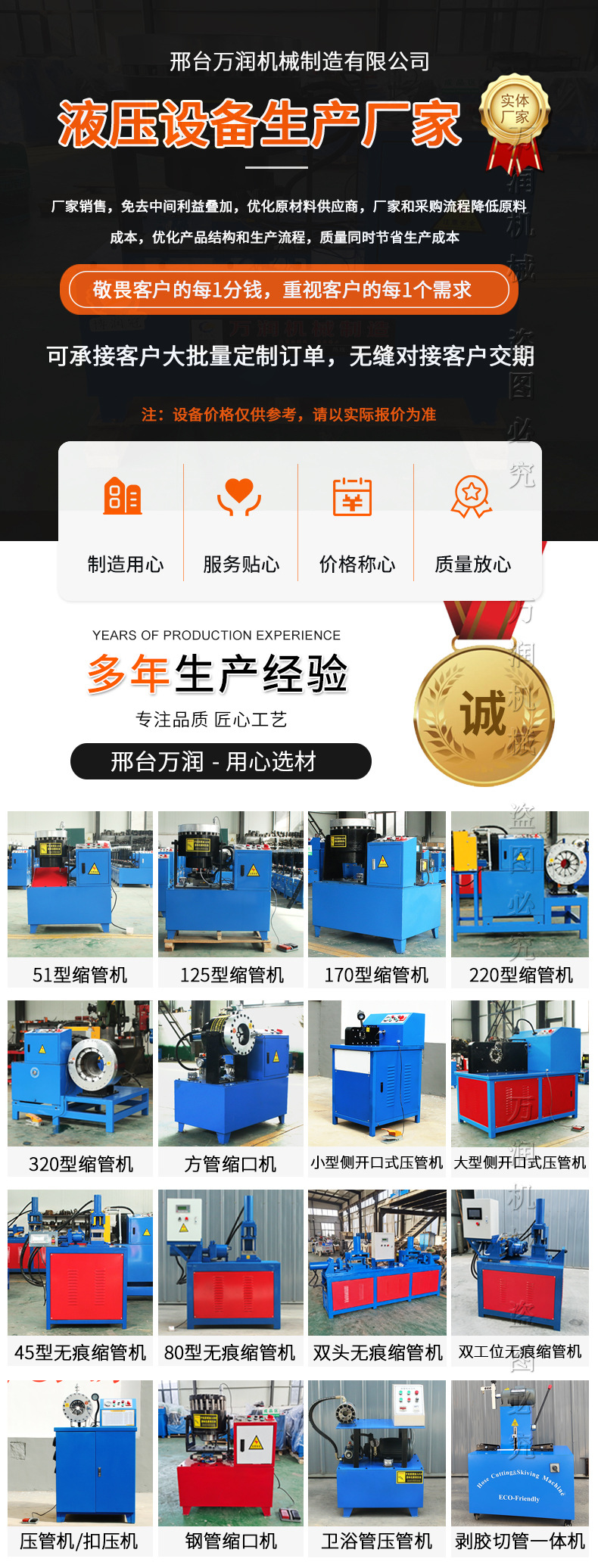 推荐理由:邢台万润机械制造数十年专注液压设备,拥有ISO9001质量认证,自研多款缩管机、压管机等产品,工艺成熟品质可靠。产品应用场景广、远销海内外,以完善研发与服务打造核心竞争力,值得信赖。