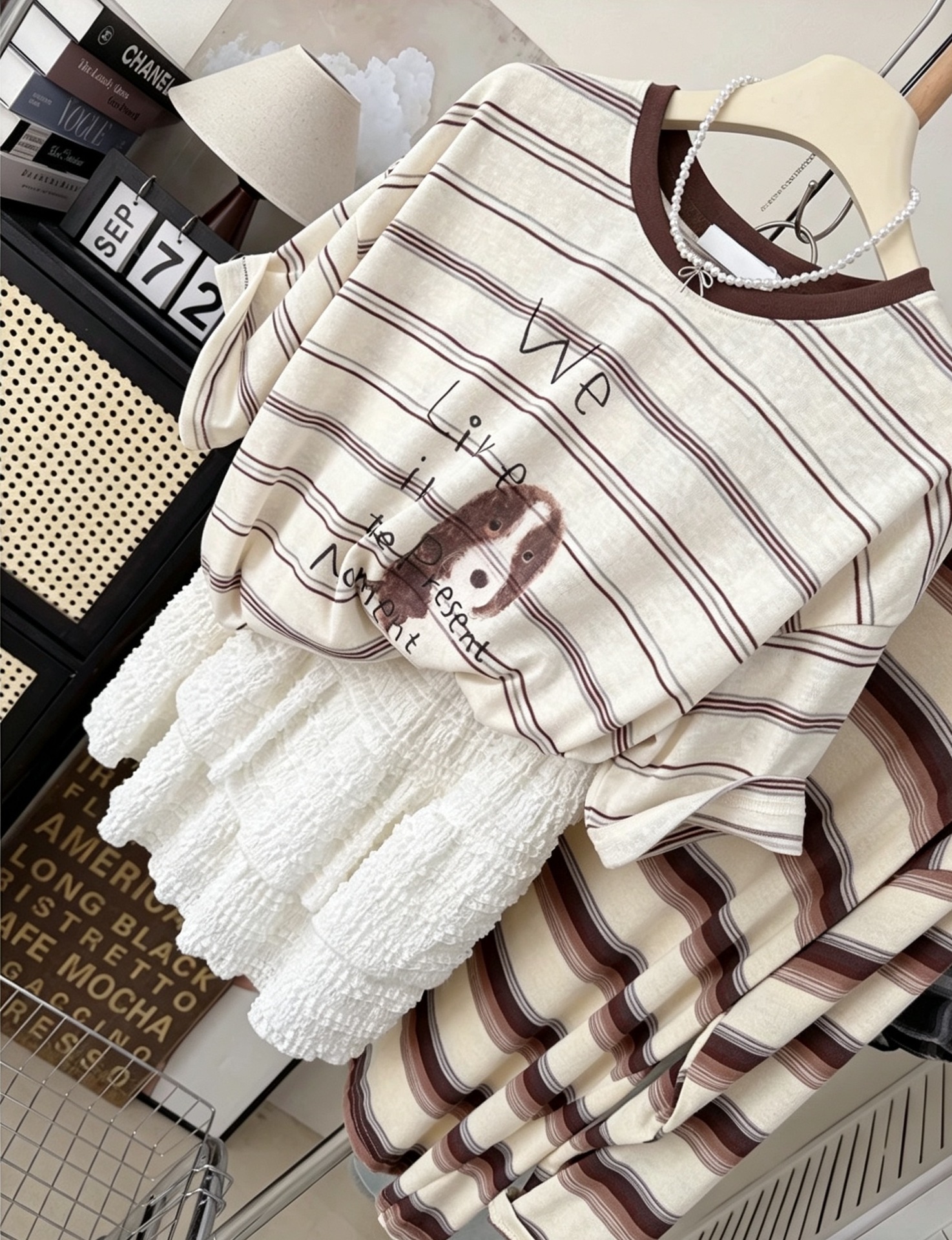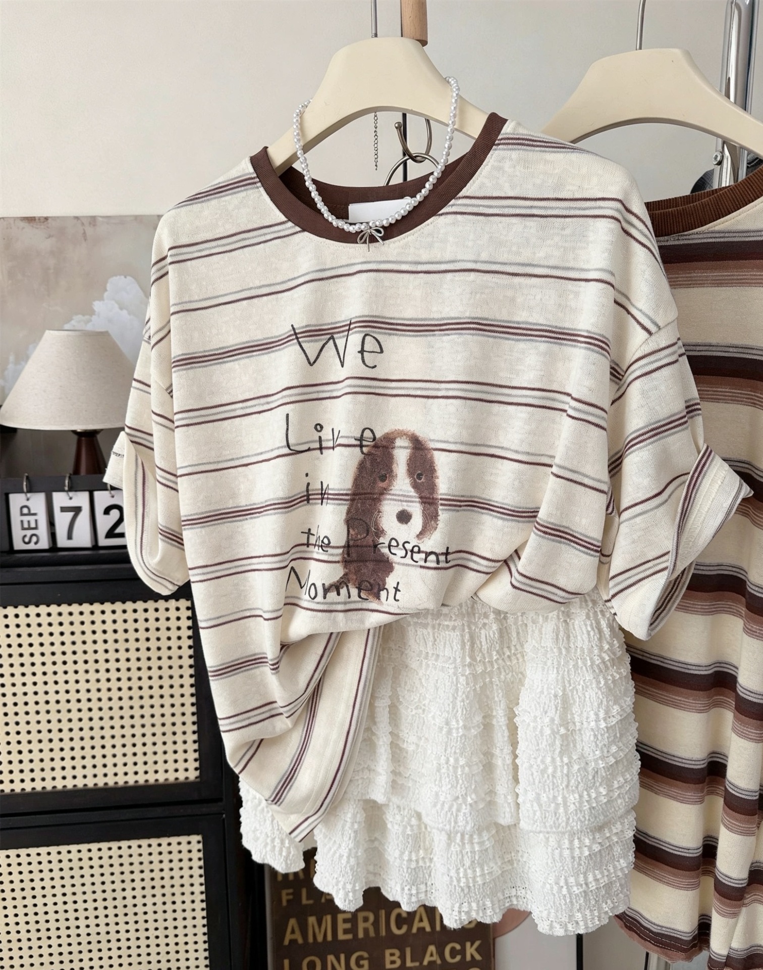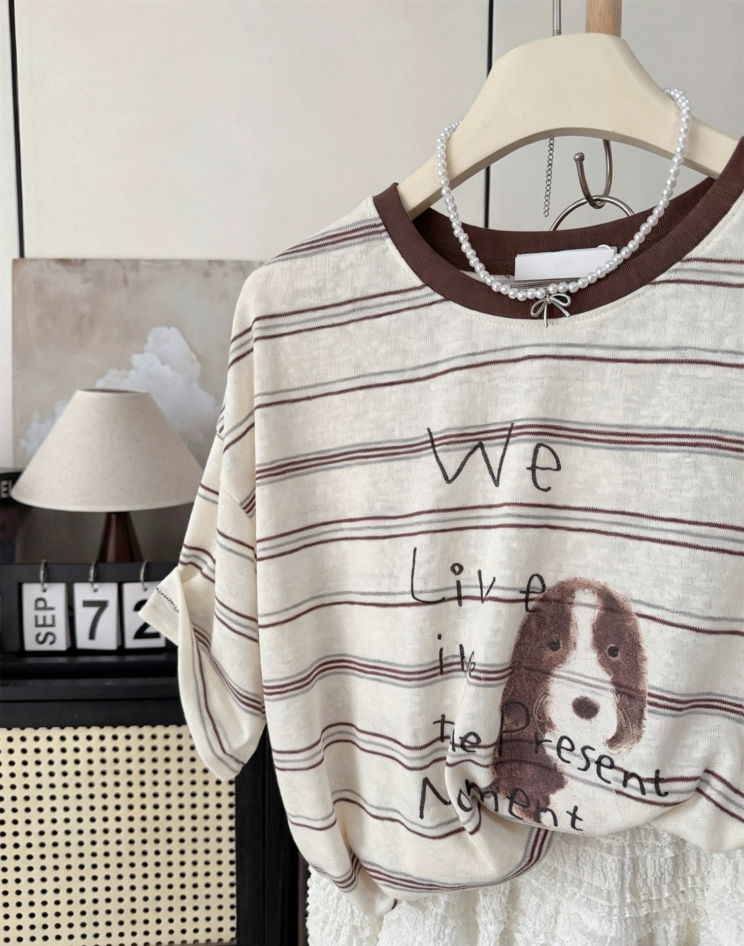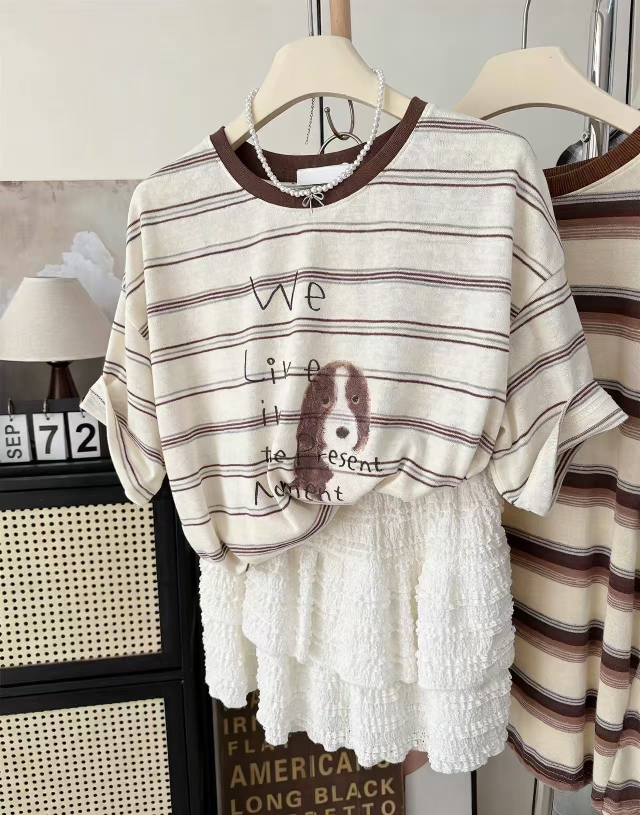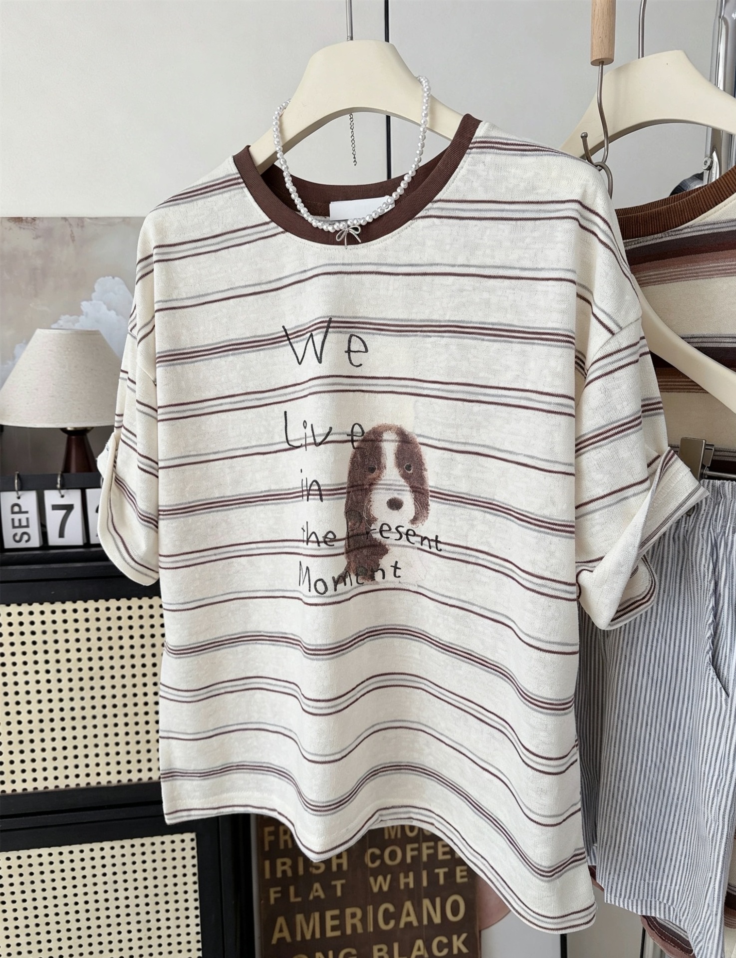 INS风复古撞色~夏季条纹小狗印花上衣韩系宽松小个子短袖T恤女衫