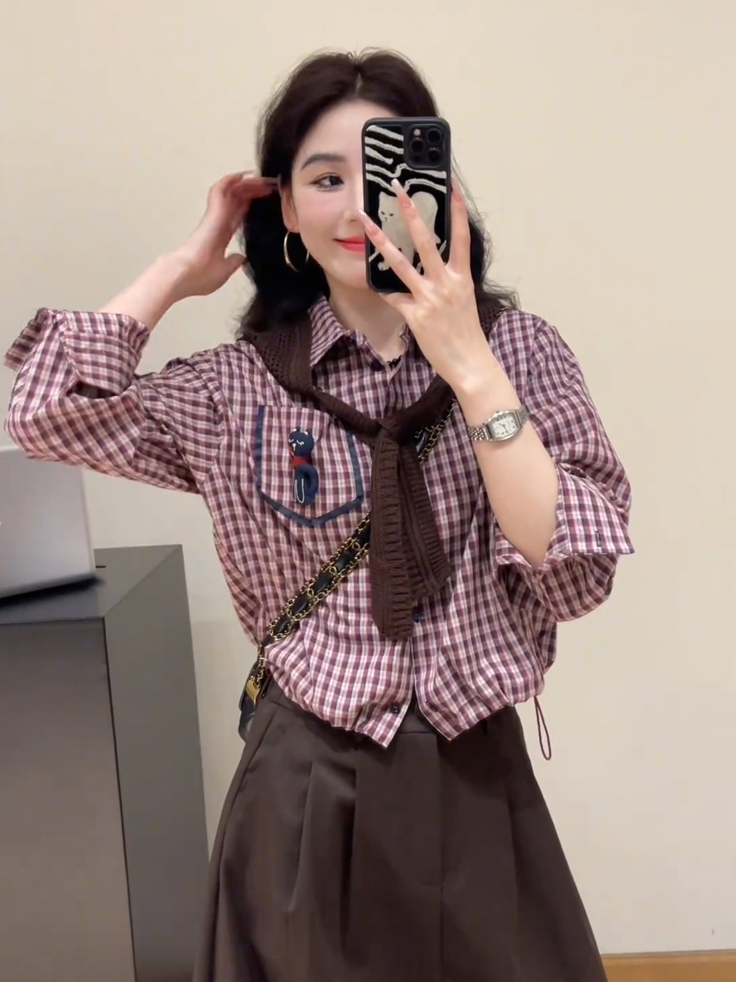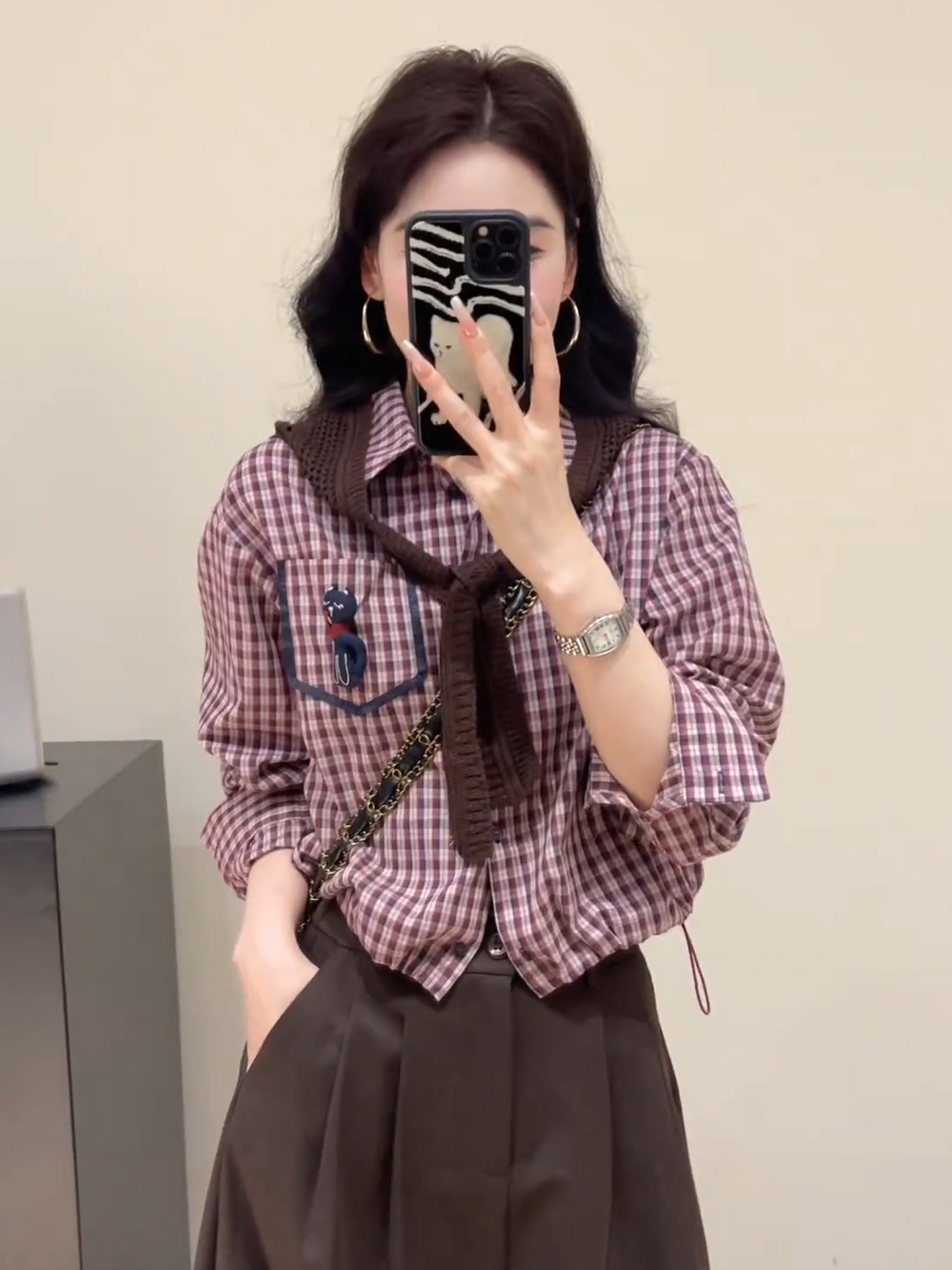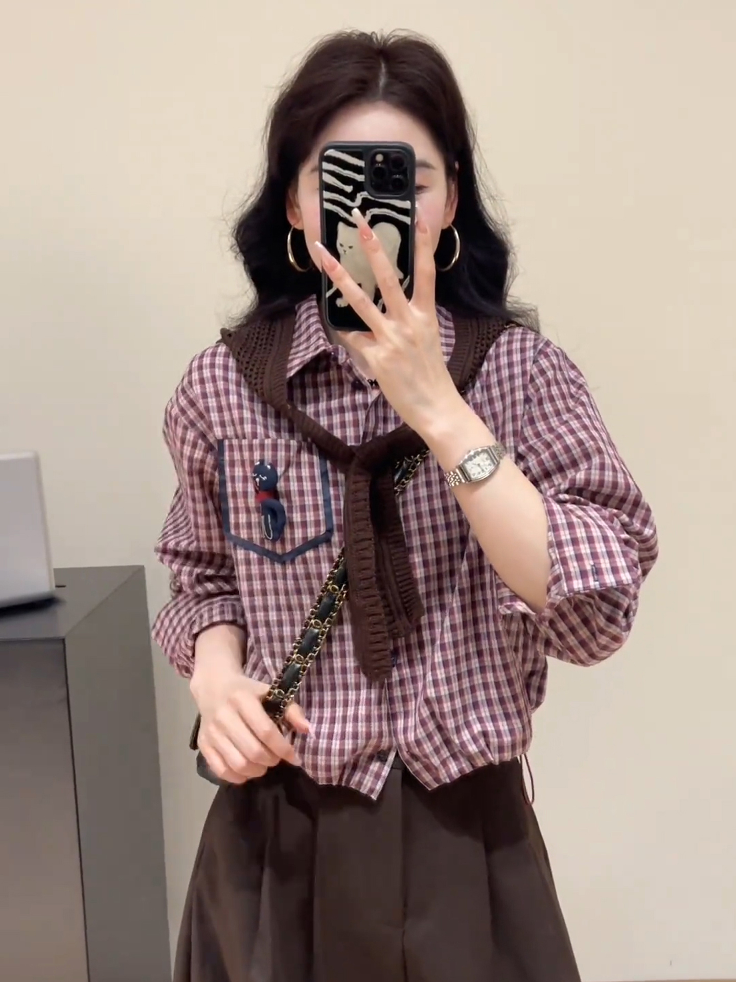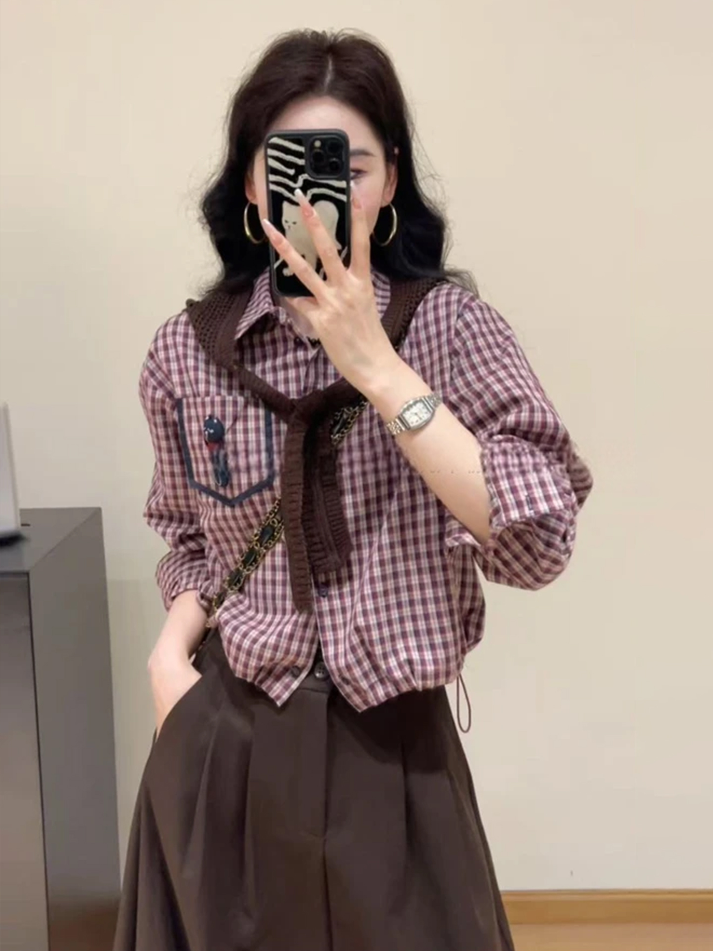 早秋韩系格纹复古衬衫披肩两件套衣女5超火松弛感穿搭一整套