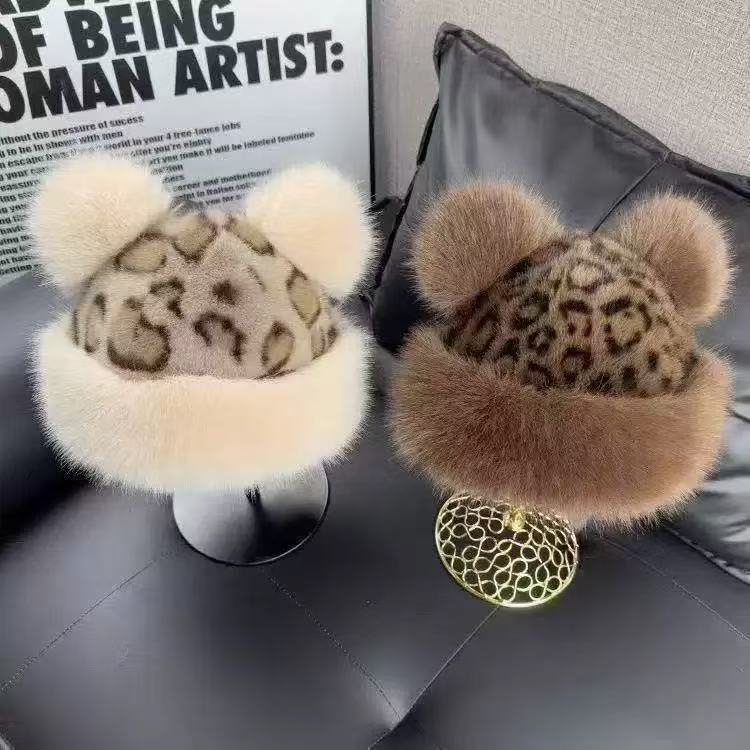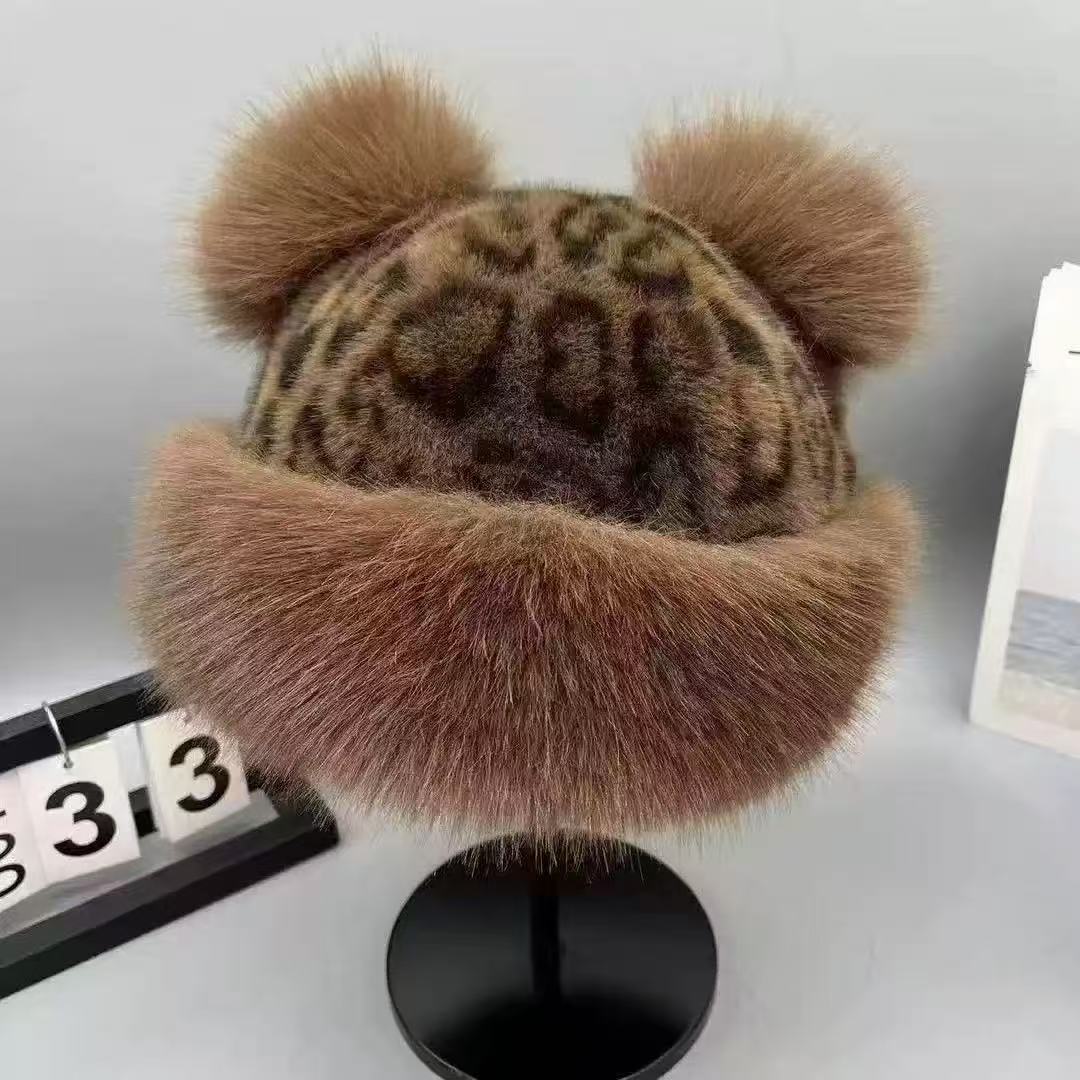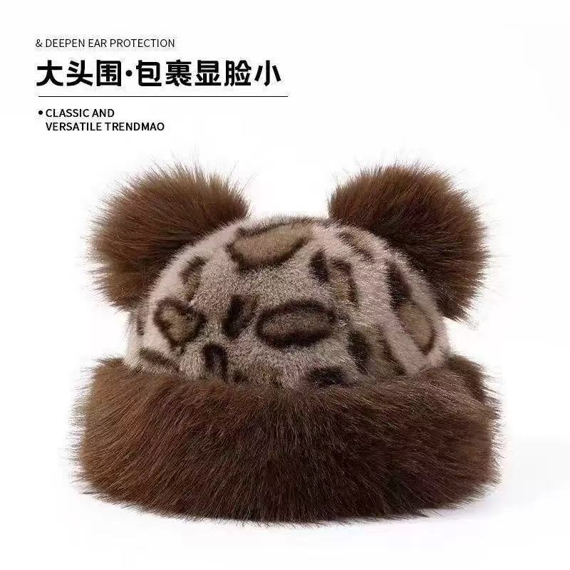 复古豹纹帽小熊耳朵毛绒蒙古帽时尚新款秋冬仿皮草加厚保暖护耳帽