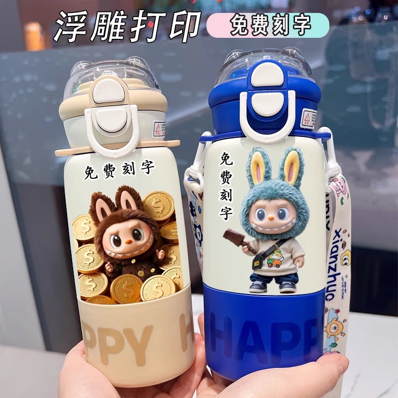 labubu拉布布保温杯儿童2025新款双杯盖水杯学生用上学便捷保温壶