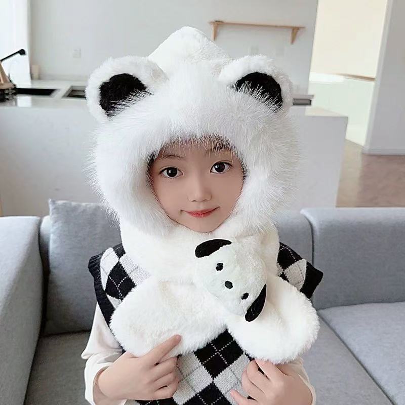 儿童卡通毛绒帽子围巾一体冬季保暖护耳套头帽