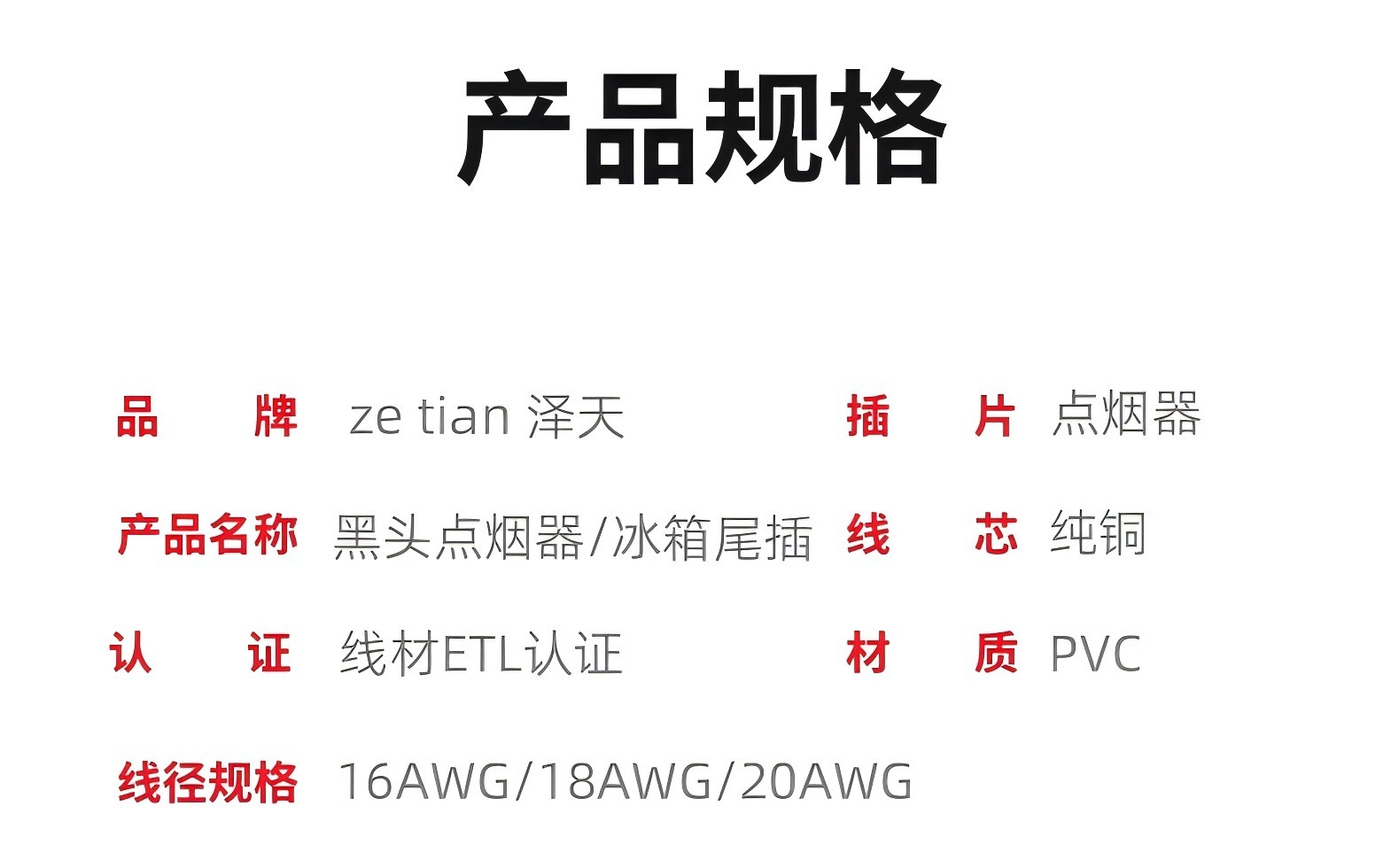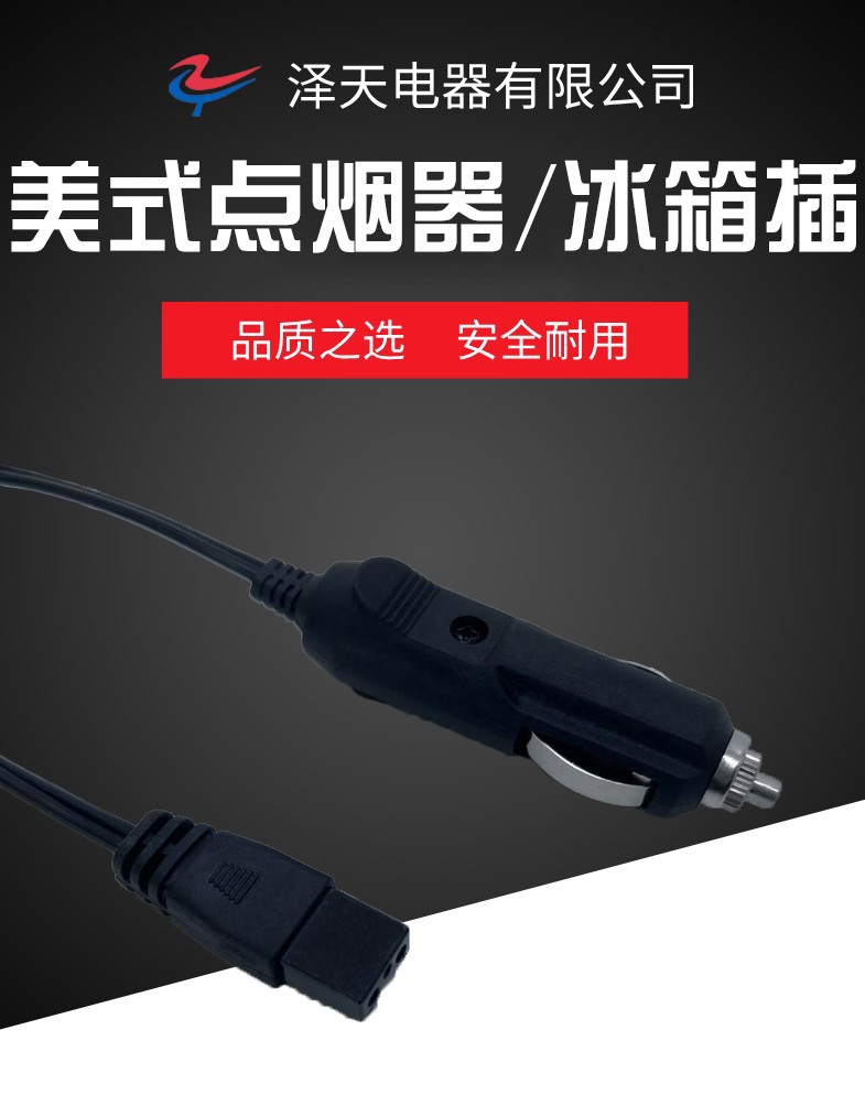 美式点烟器黑头无灯2*20AWG平行线1.6米转冰箱B字尾插