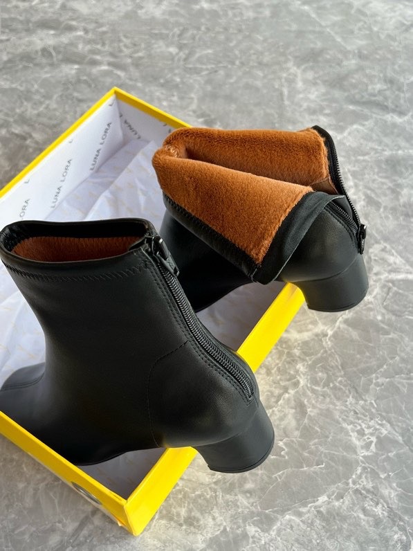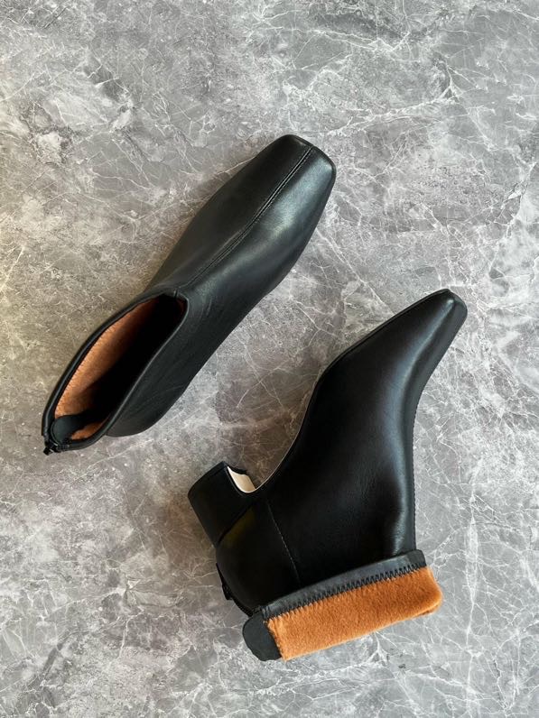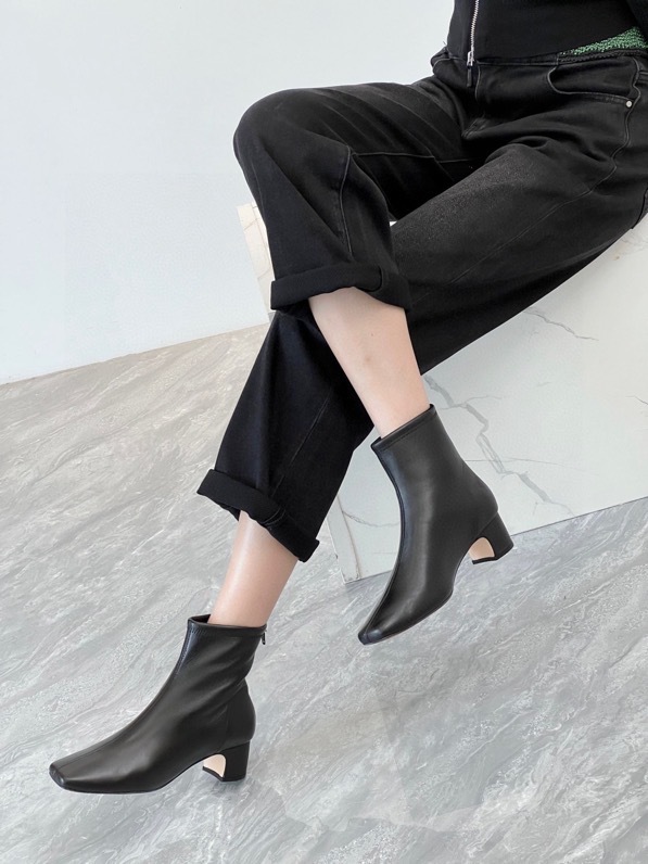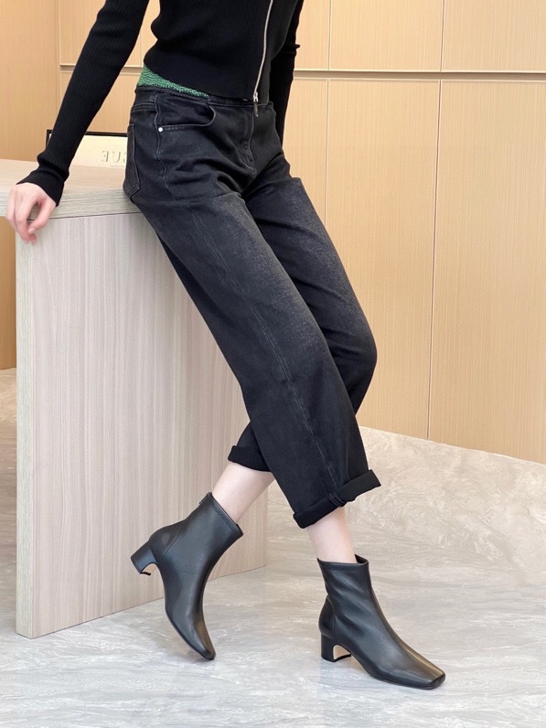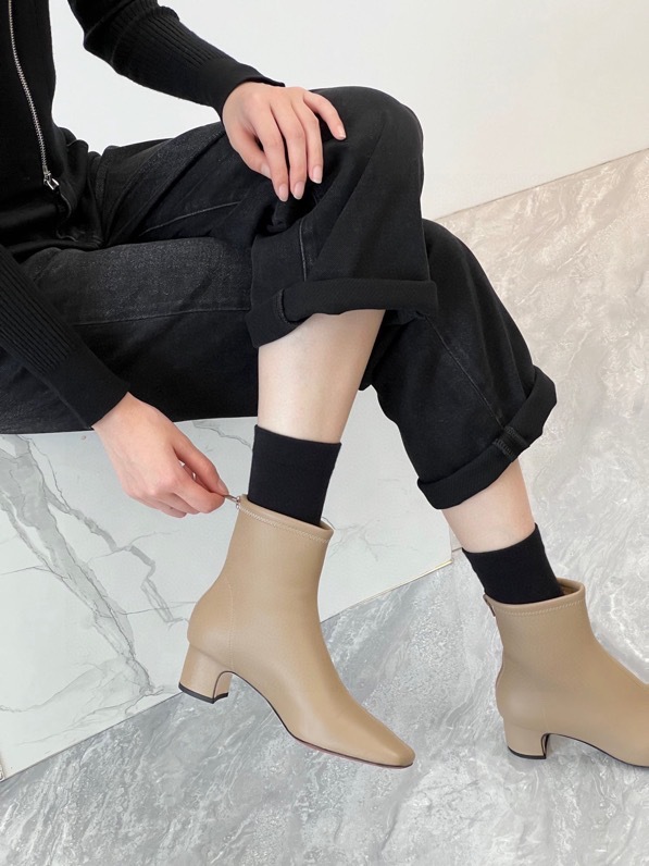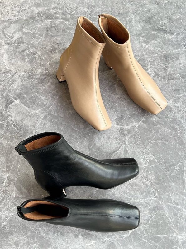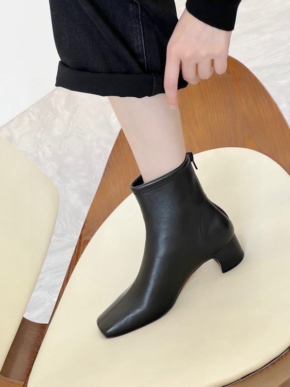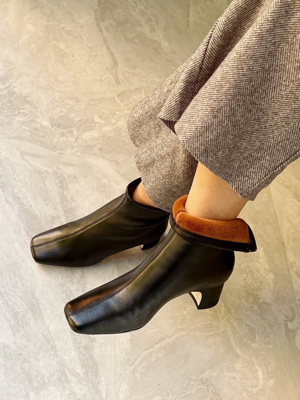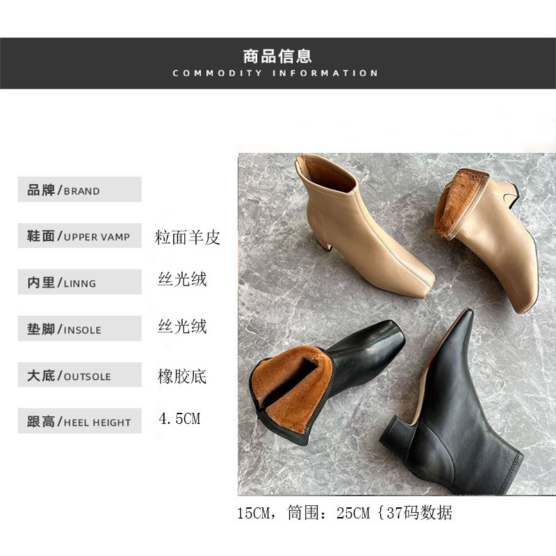 莞产高货瘦瘦短靴方头粗跟后拉链羊皮软底舒适冬季加丝光绒马丁靴