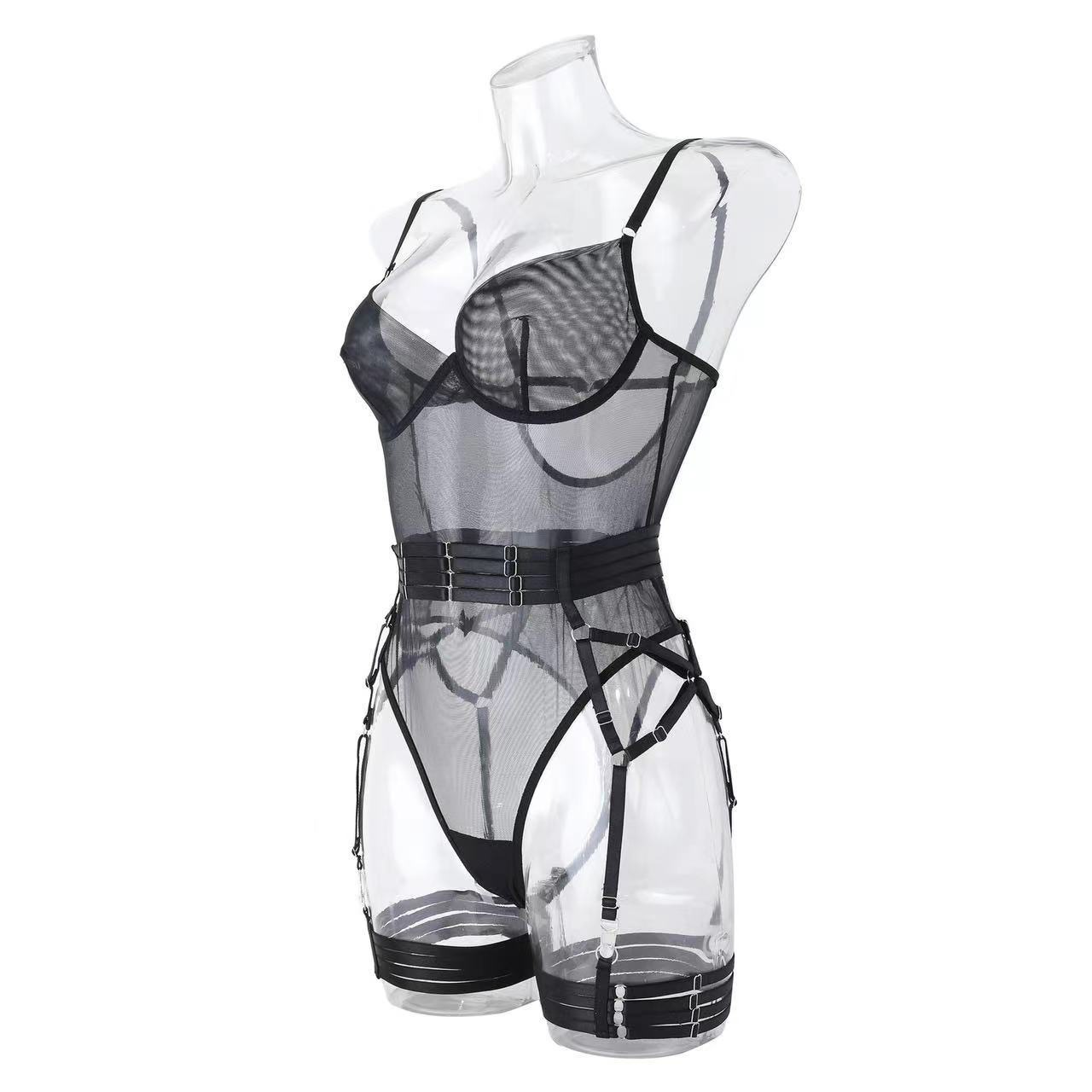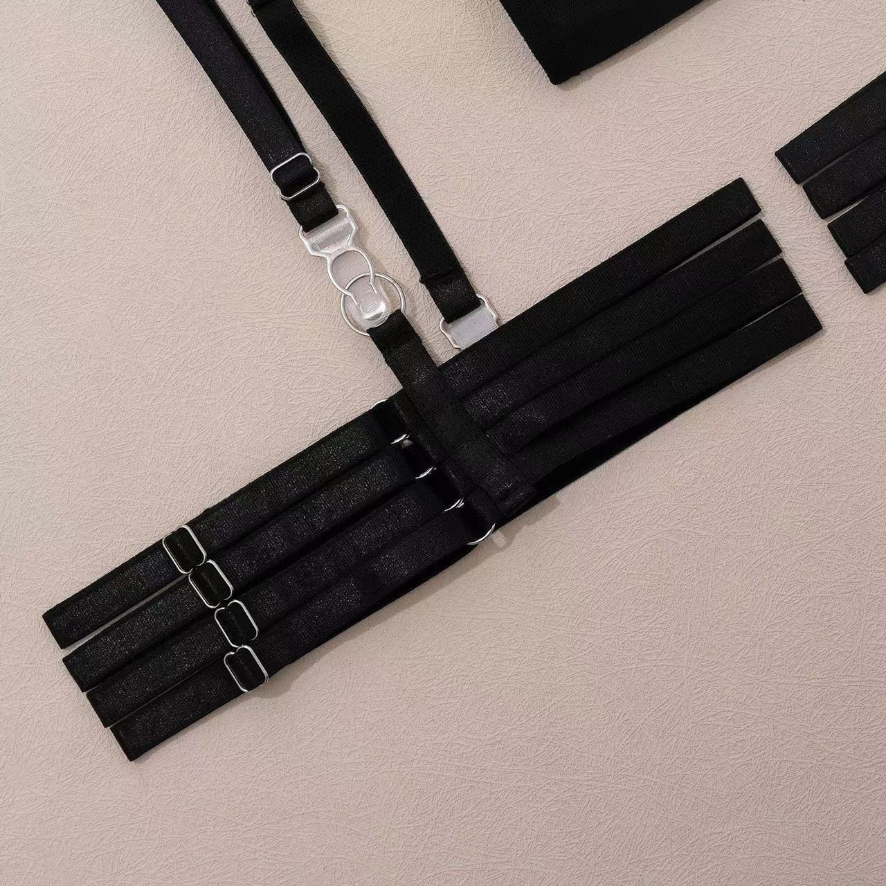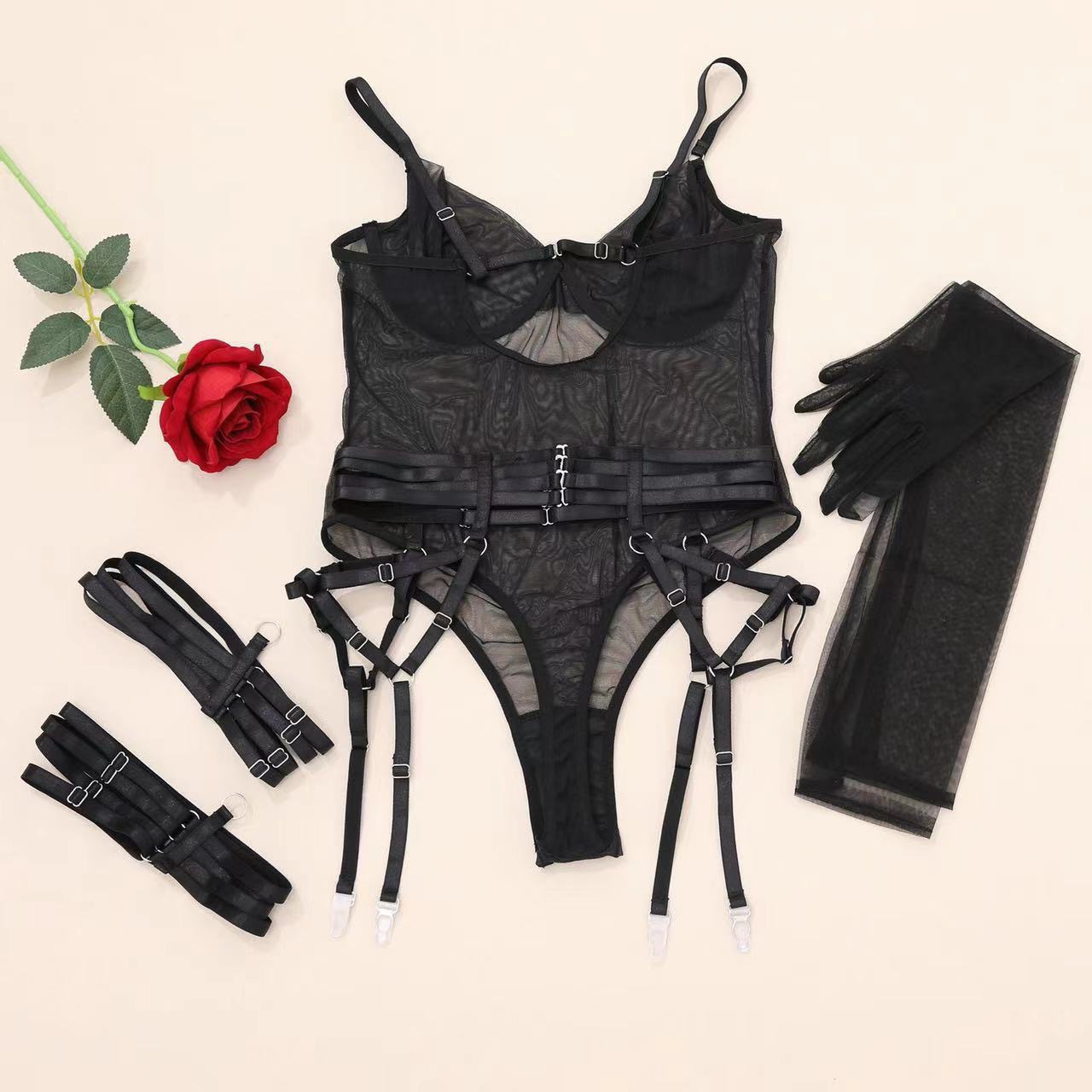 欧美跨境速卖通全托管热销情趣内衣绑带拼接修身带手套三件套现货