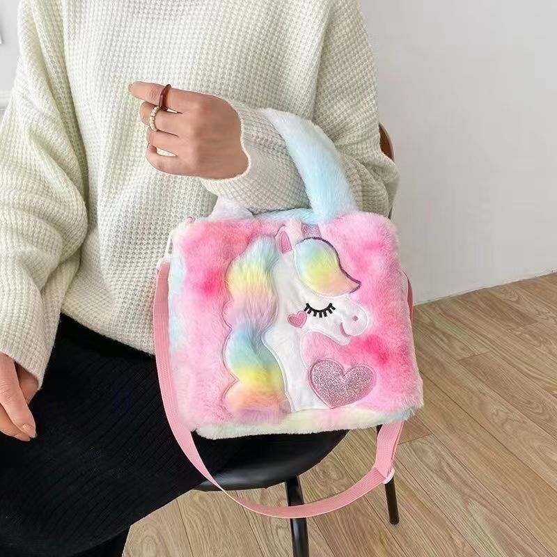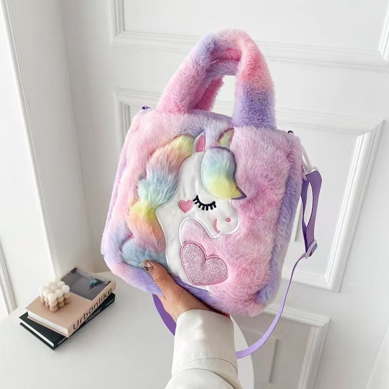 新款卡通绣花毛绒单肩包可爱少女儿童手提包独角兽女童斜挎包现货